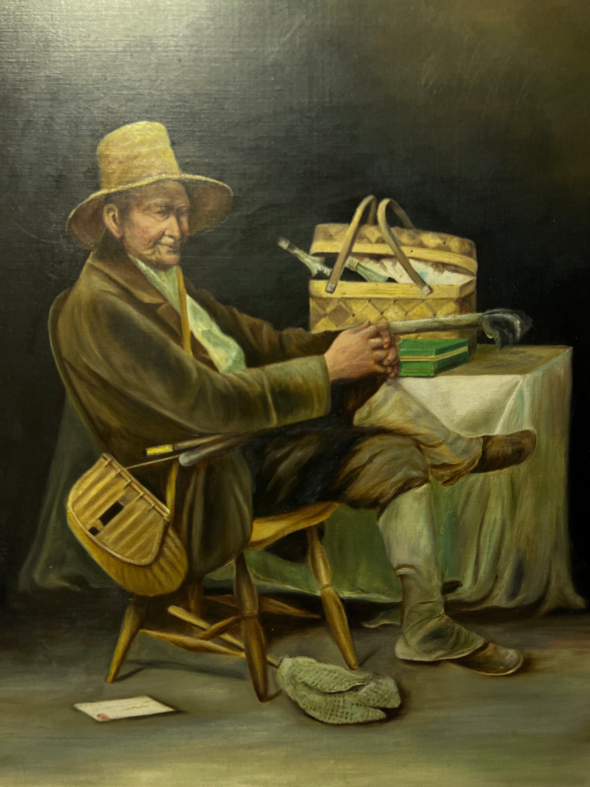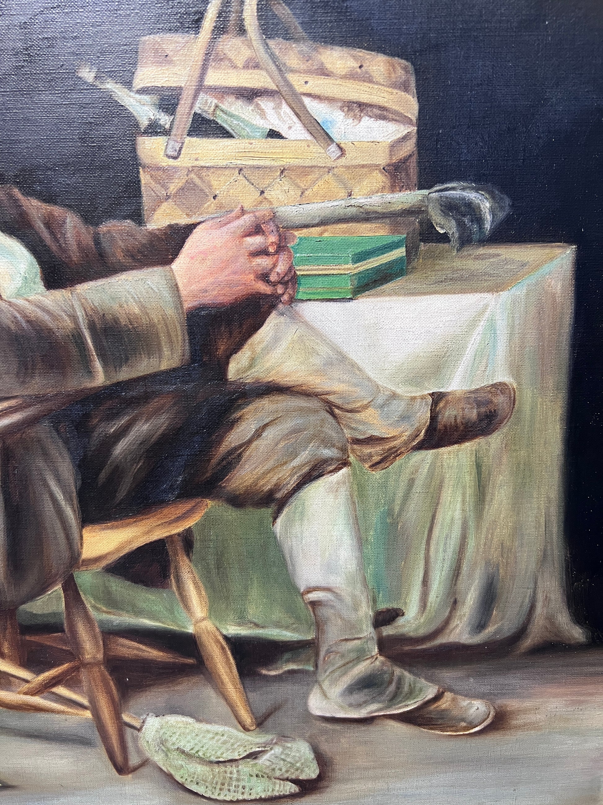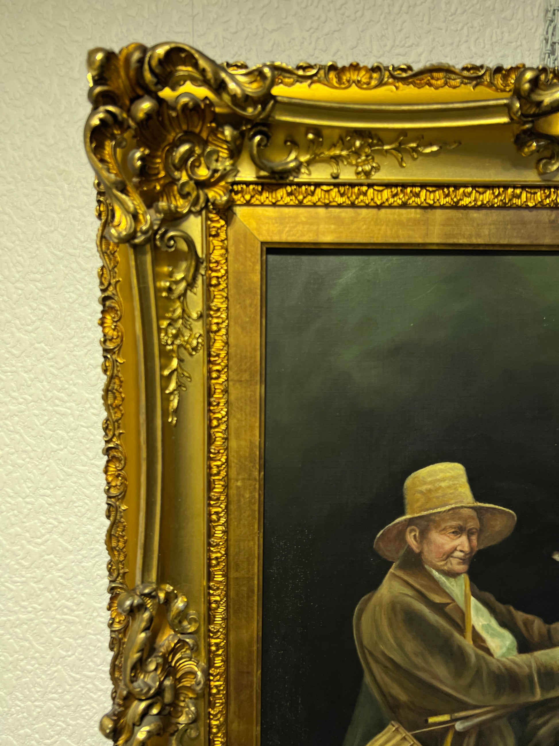 This amazing vintage oil painting on canvas depicts an elderly man seated in a sturdy wooden chair, deeply immersed in quiet contemplation as he gently ties a bundle with careful hands. His humble, earth-toned garments and straw hat convey rustic dignity, while his weathered features and thoughtful posture evoke a life of experience and solitude.
