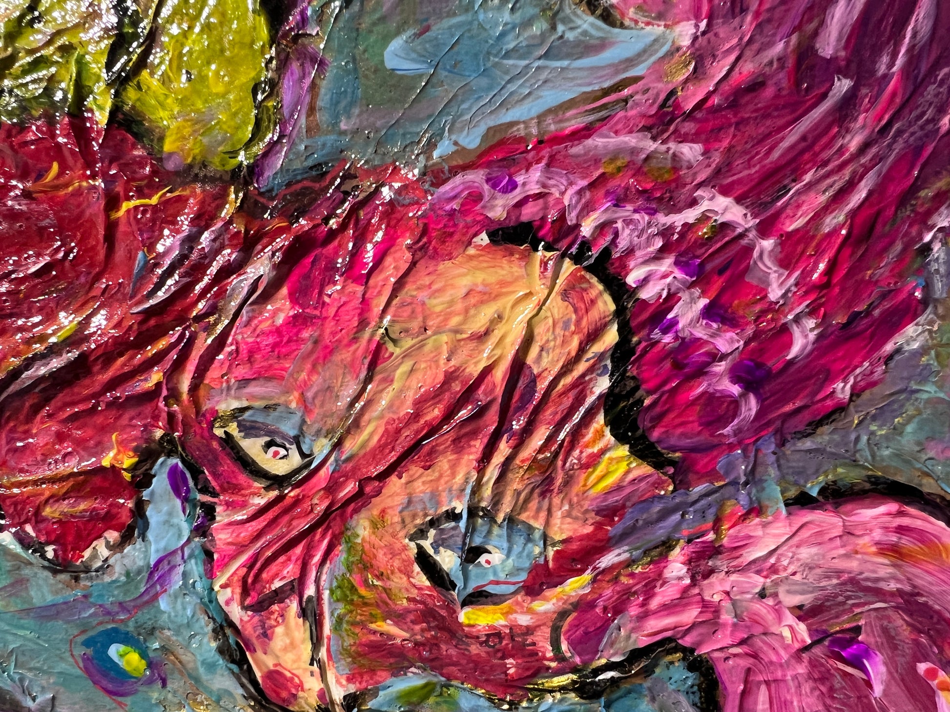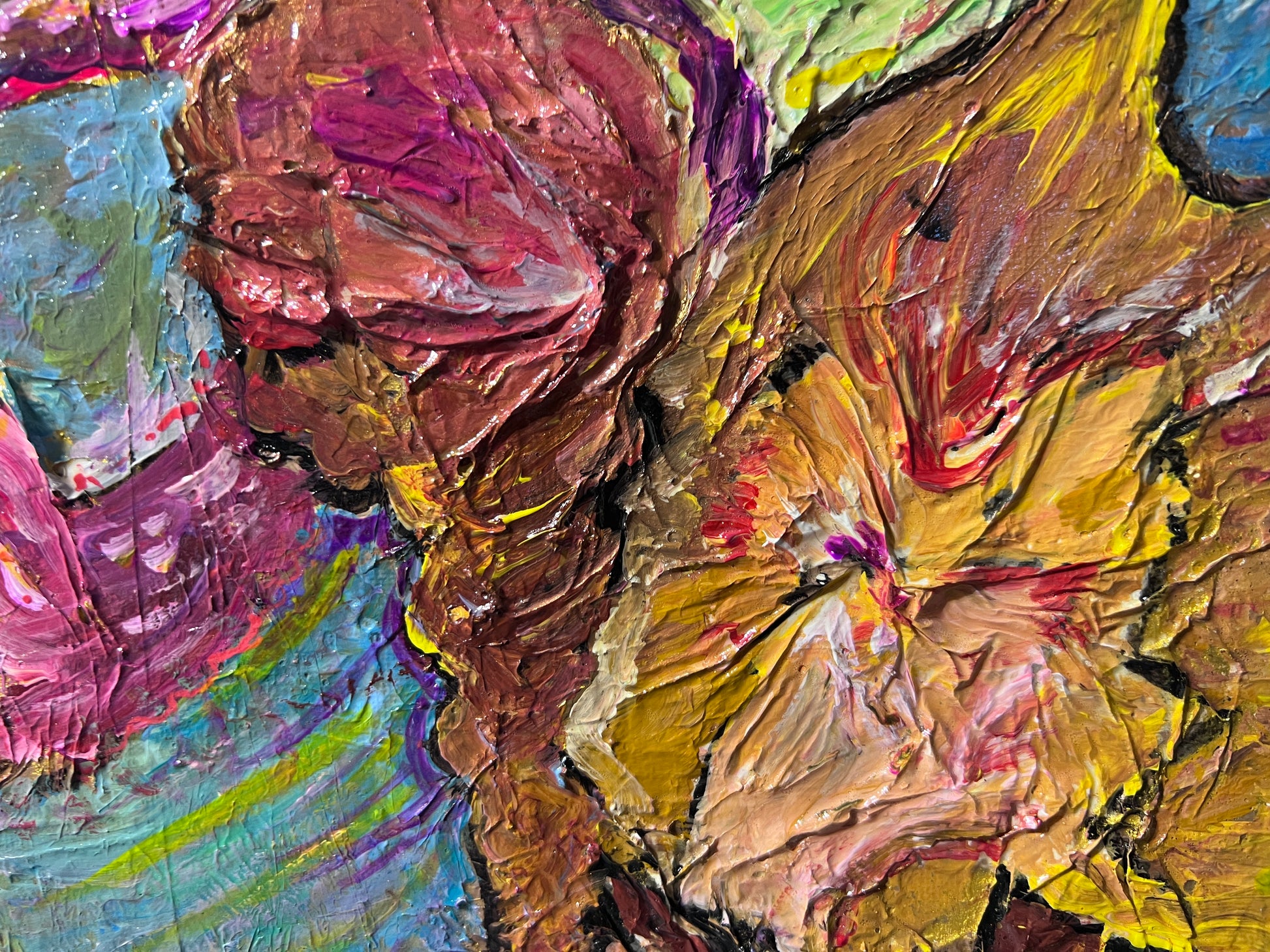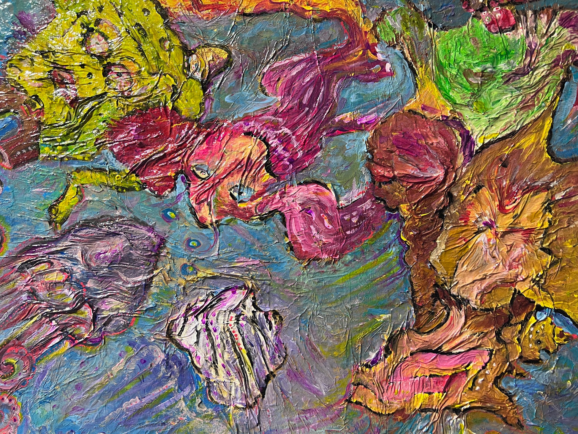 The heavily textured surface, built up with thick, impasto strokes, gives the piece depth and dimension. Dynamic brushwork and intricate details invite viewers to explore every corner of the painting, discovering new forms and stories within the abstract design. The background’s cooler tones of blue and purple contrast beautifully with the warmer, more intense colors in the foreground, creating a lively yet balanced atmosphere.