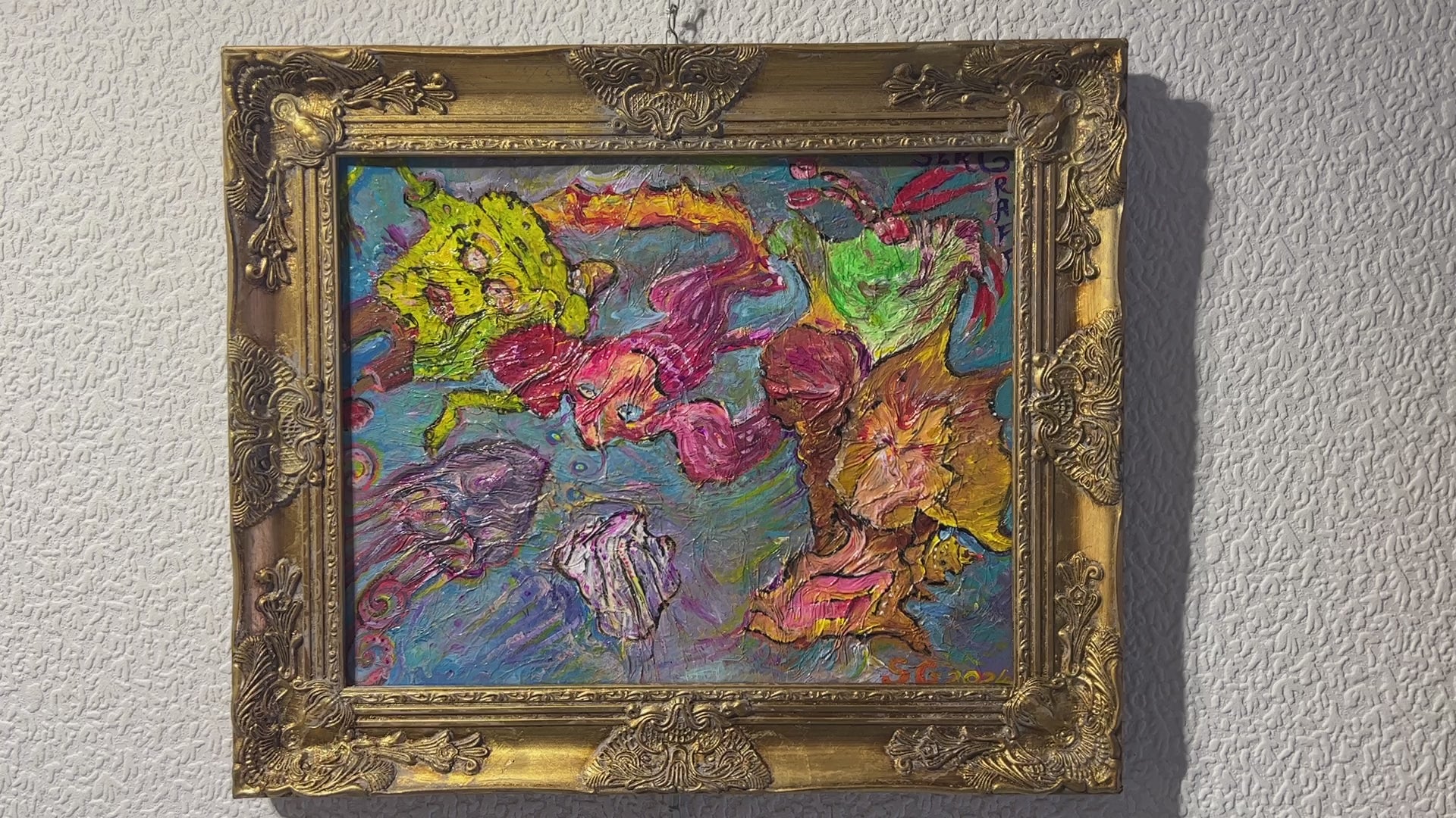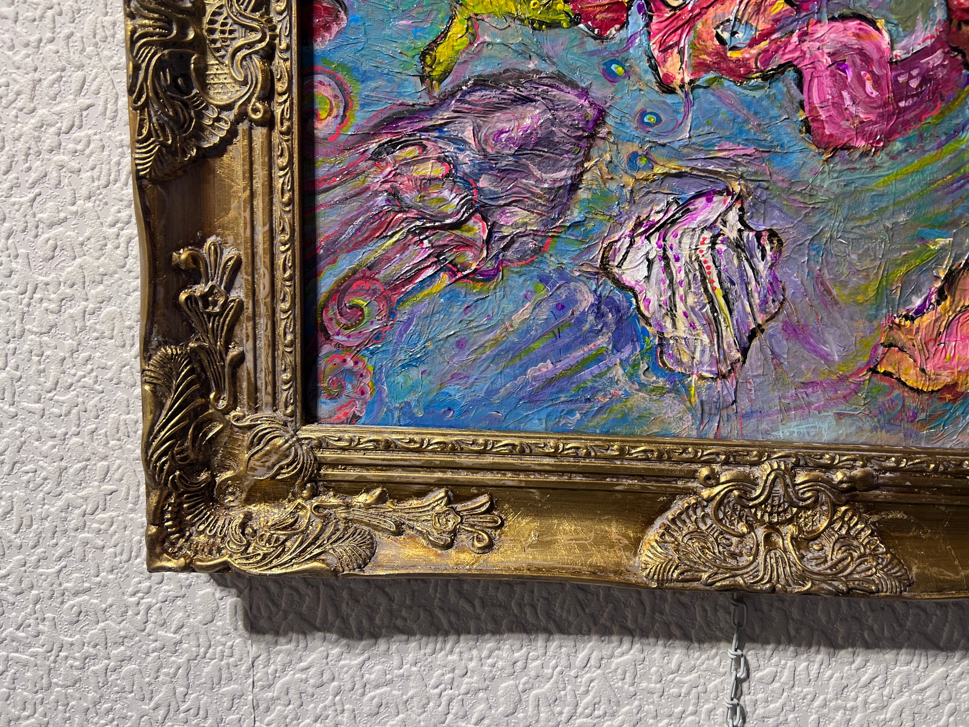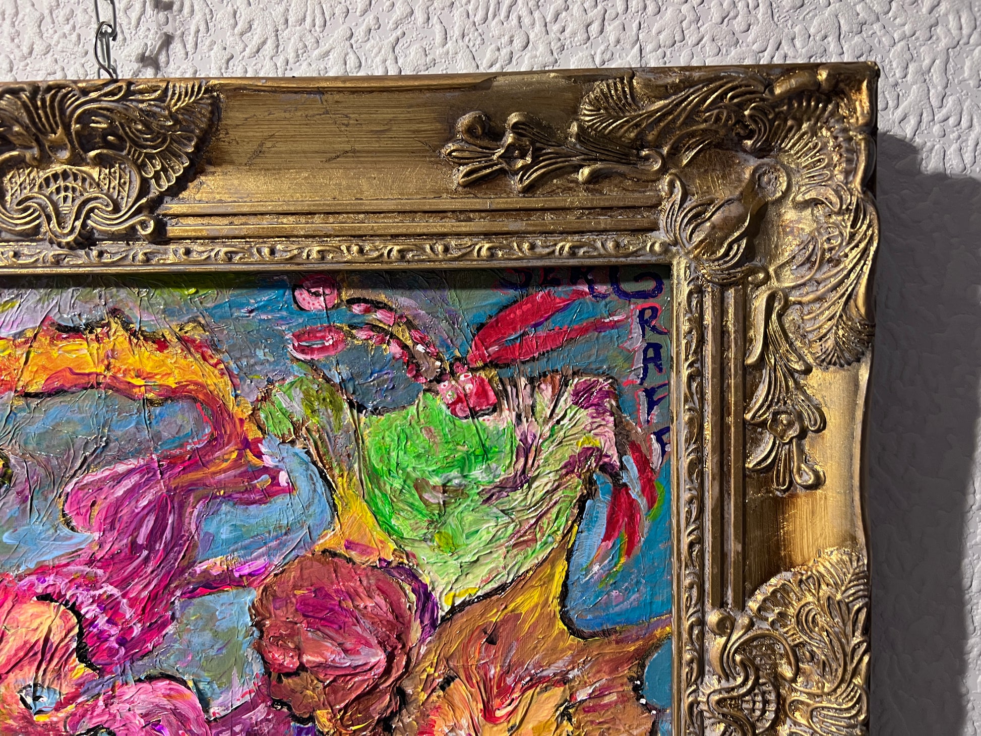 The work is presented in a magnificent ornate gold frame, whose classic elegance complements the bold, contemporary spirit of the artwork. Together, frame and painting make a striking statement piece that captures imagination and joy.