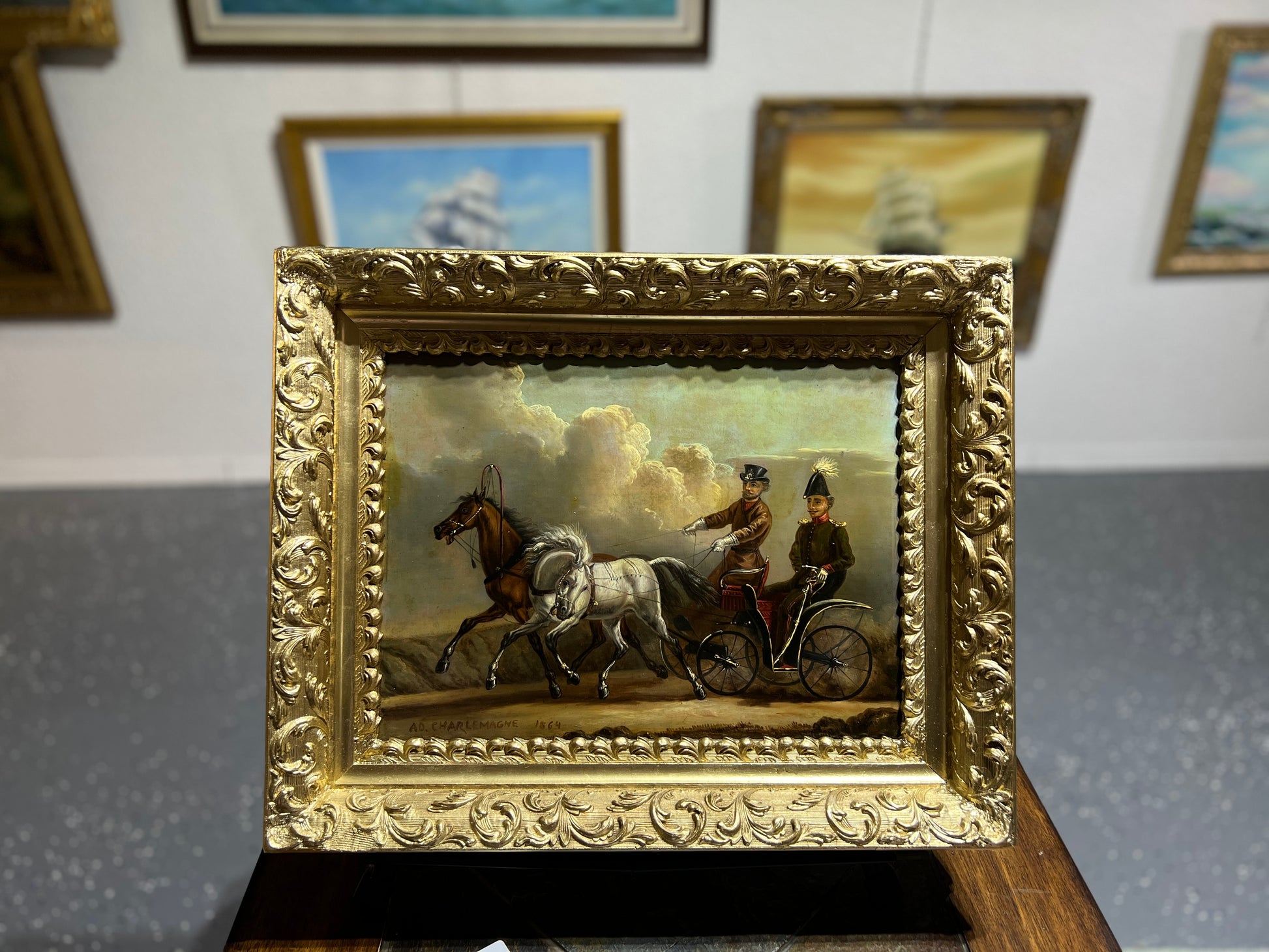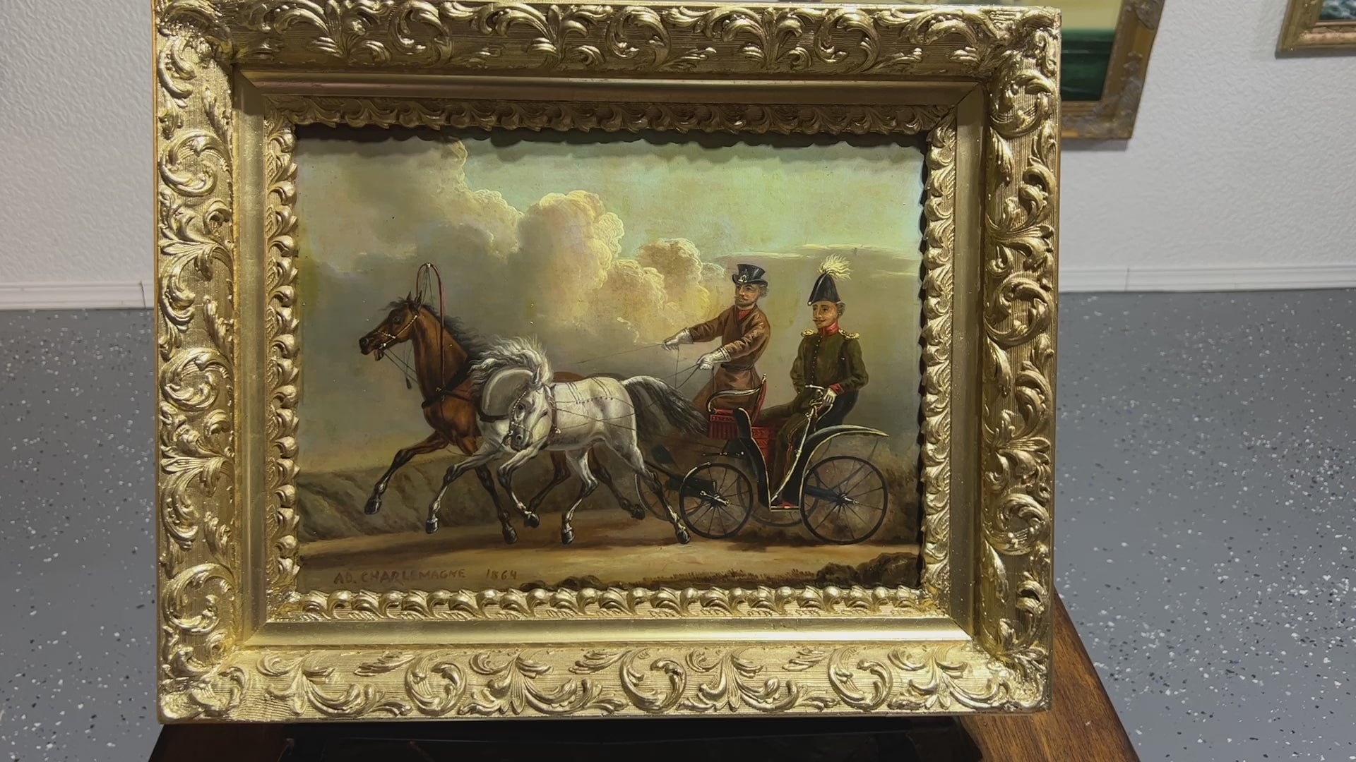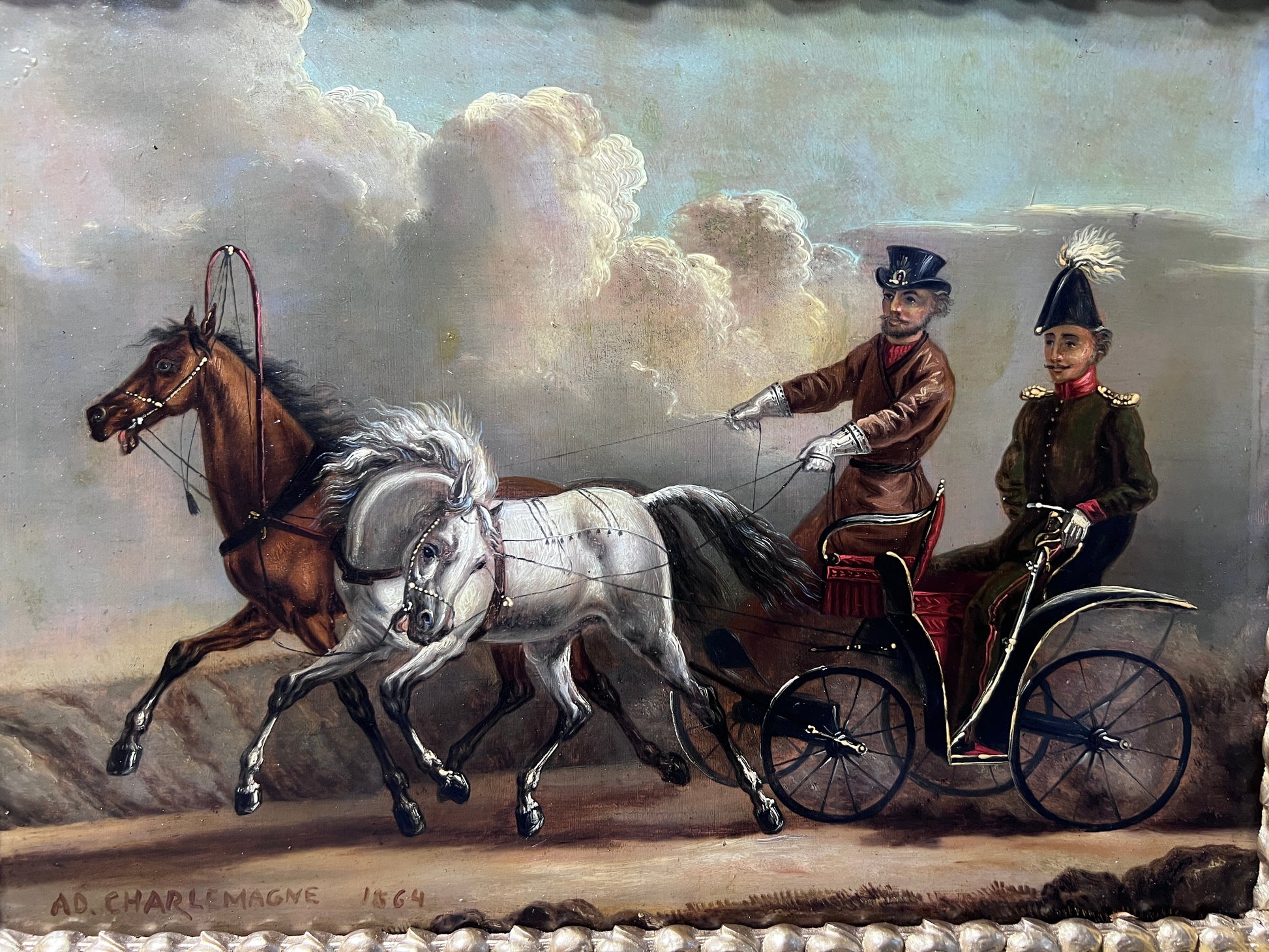 Up for sale is a very rare and historically significant 19th-century original oil painting on metal panel, depicting a charming carriage ride through the countryside. This exceptional work is signed “Ad. Charlemagne” and dated 1864 in the lower left corner.