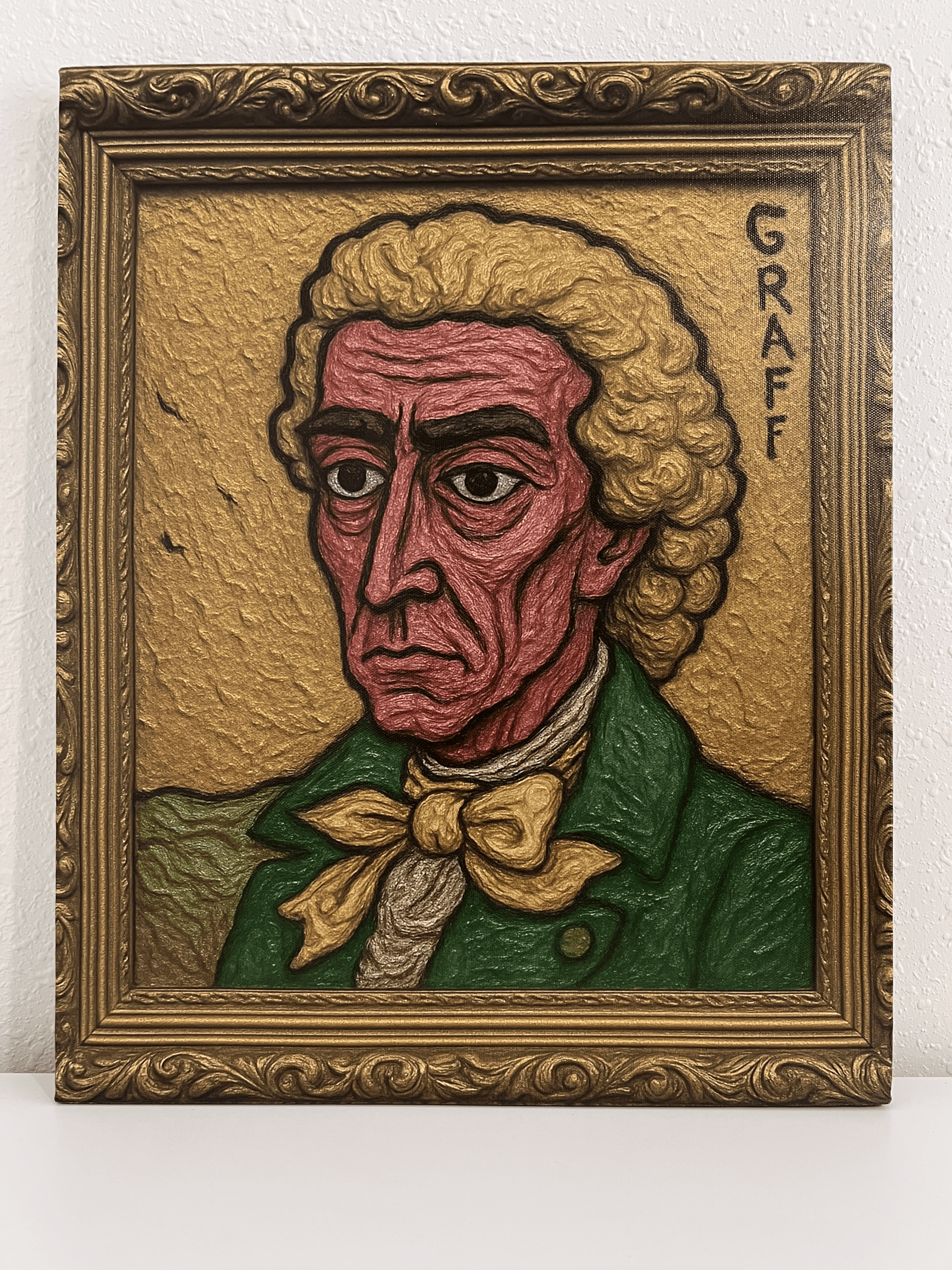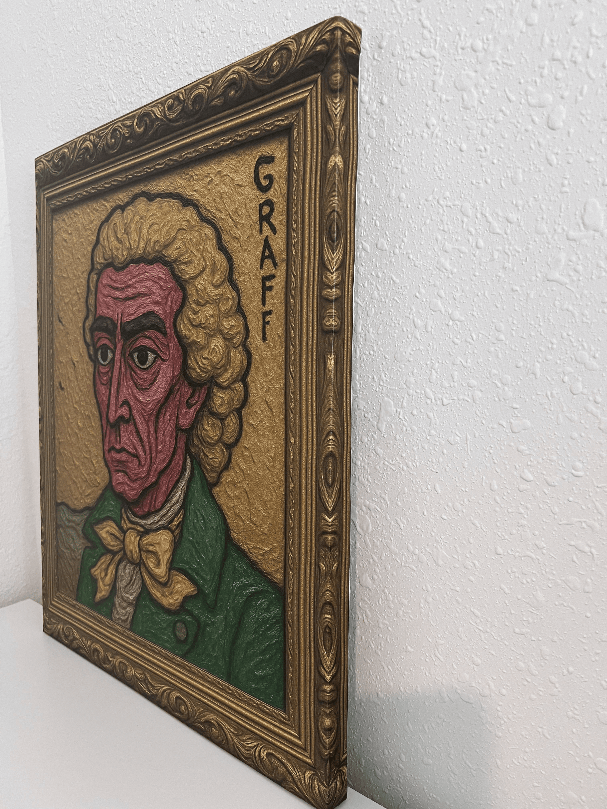 This striking print on canvas by artist Serg Graff reimagines Founding Father Alexander Hamilton in bold colors and textured detail. Rendered in a unique pop-surrealist style, Hamilton’s stoic expression is contrasted with expressive brushwork, sculptural lines, and a rich gold background.