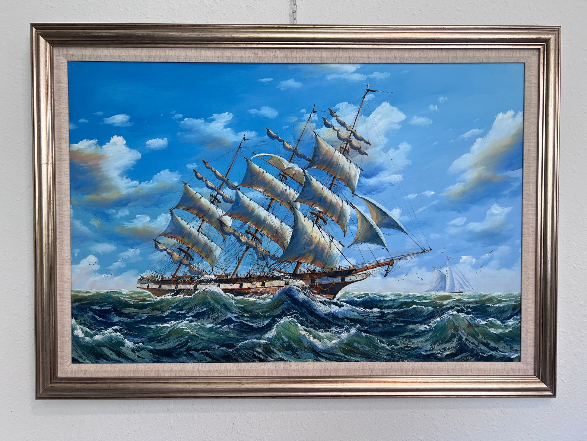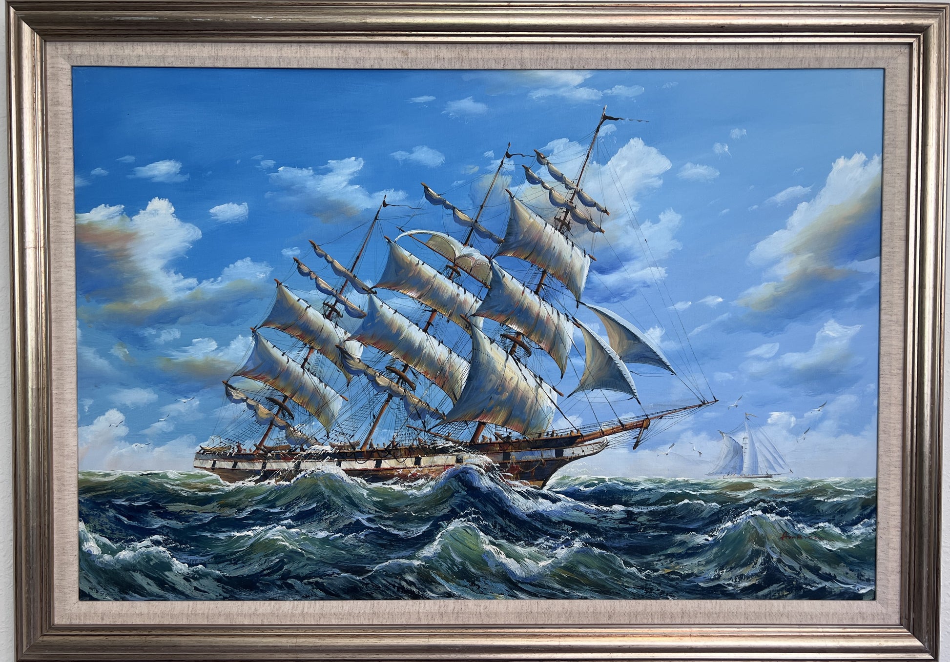 The artist’s confident brushwork and vibrant palette give this piece energy and depth. Seagulls dot the sky, and a second vessel sails in the distant horizon, adding balance and narrative to the seascape. This is a timeless representation of nautical strength and the power of nature.