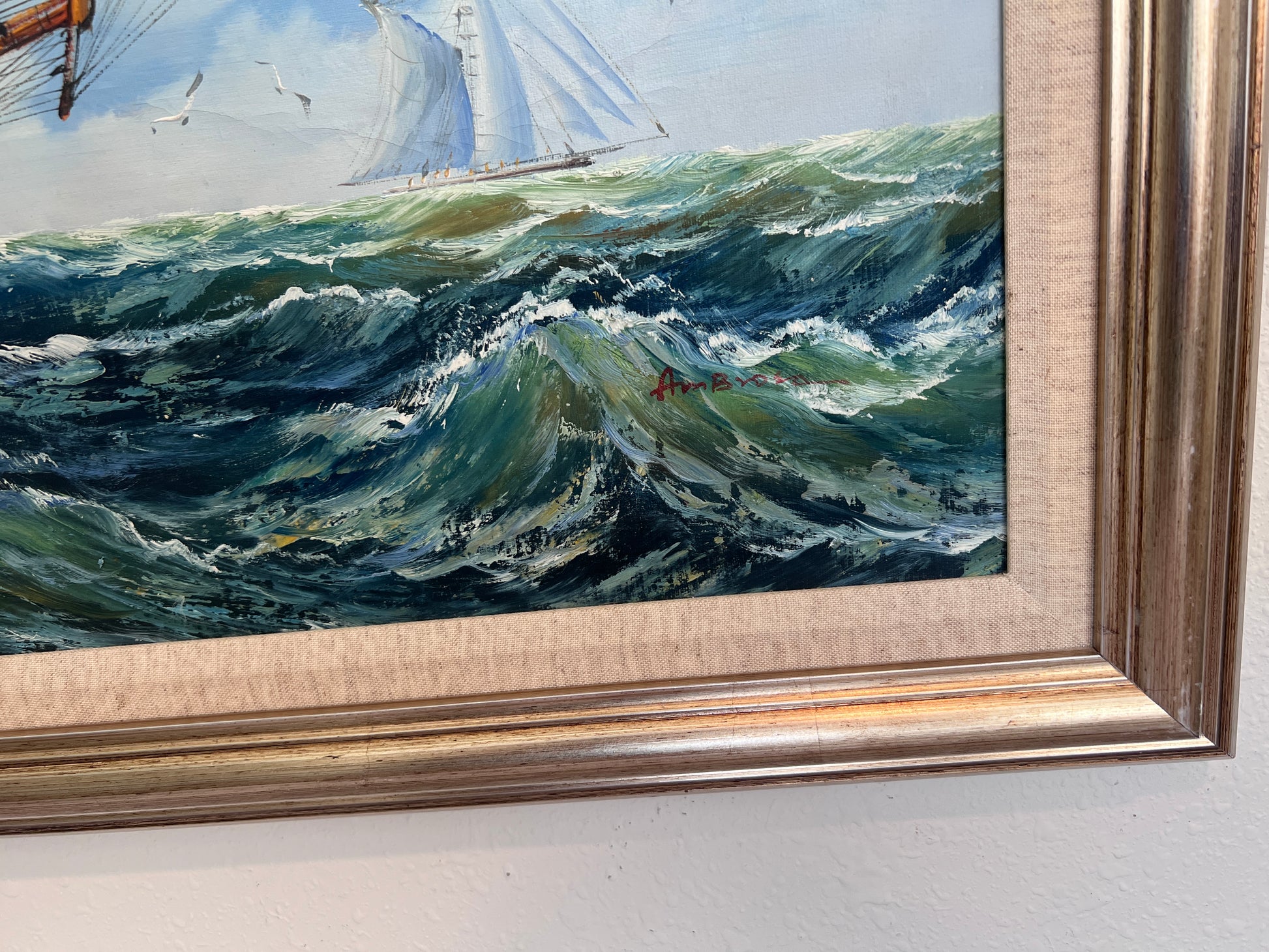 Ambrose Large Original Oil Painting on Canvas Sailing Ship Ocean Seascape Framed