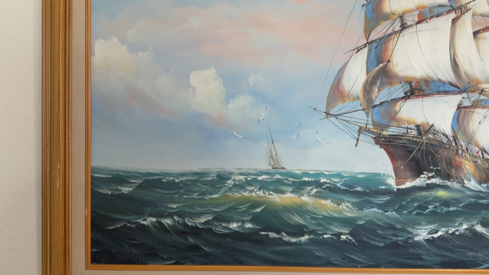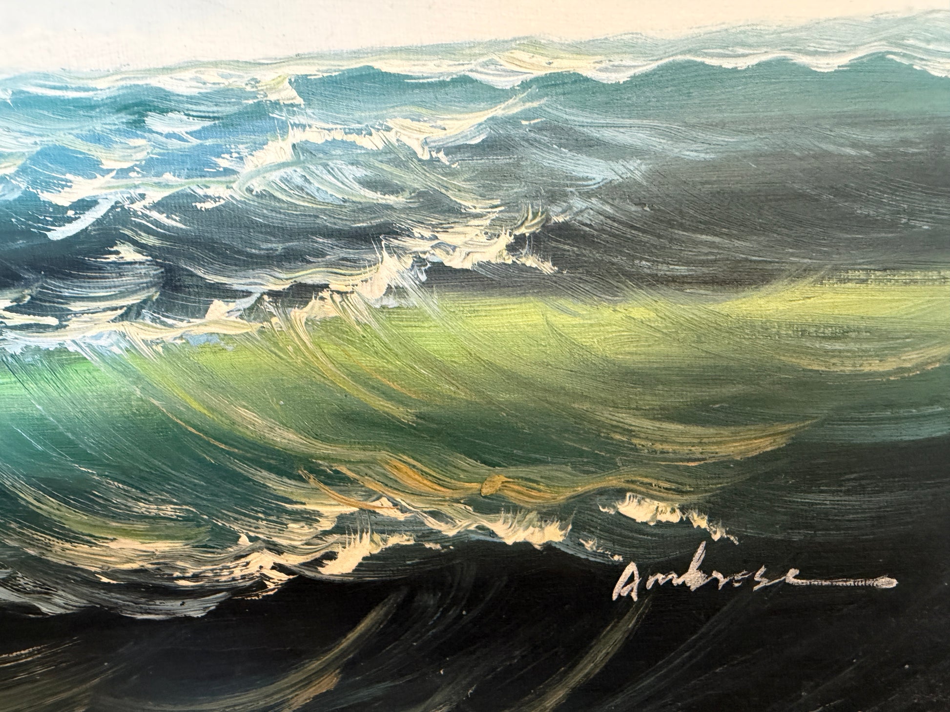 The work is signed “Ambrose.” While further attribution research may be required, the style reflects late 20th-century maritime realism, a tradition rooted in classic European and American marine painting. Artists working in this genre often focused on historic sailing vessels, dramatic seas, and atmospheric skies, drawing inspiration from 19th-century maritime masters.