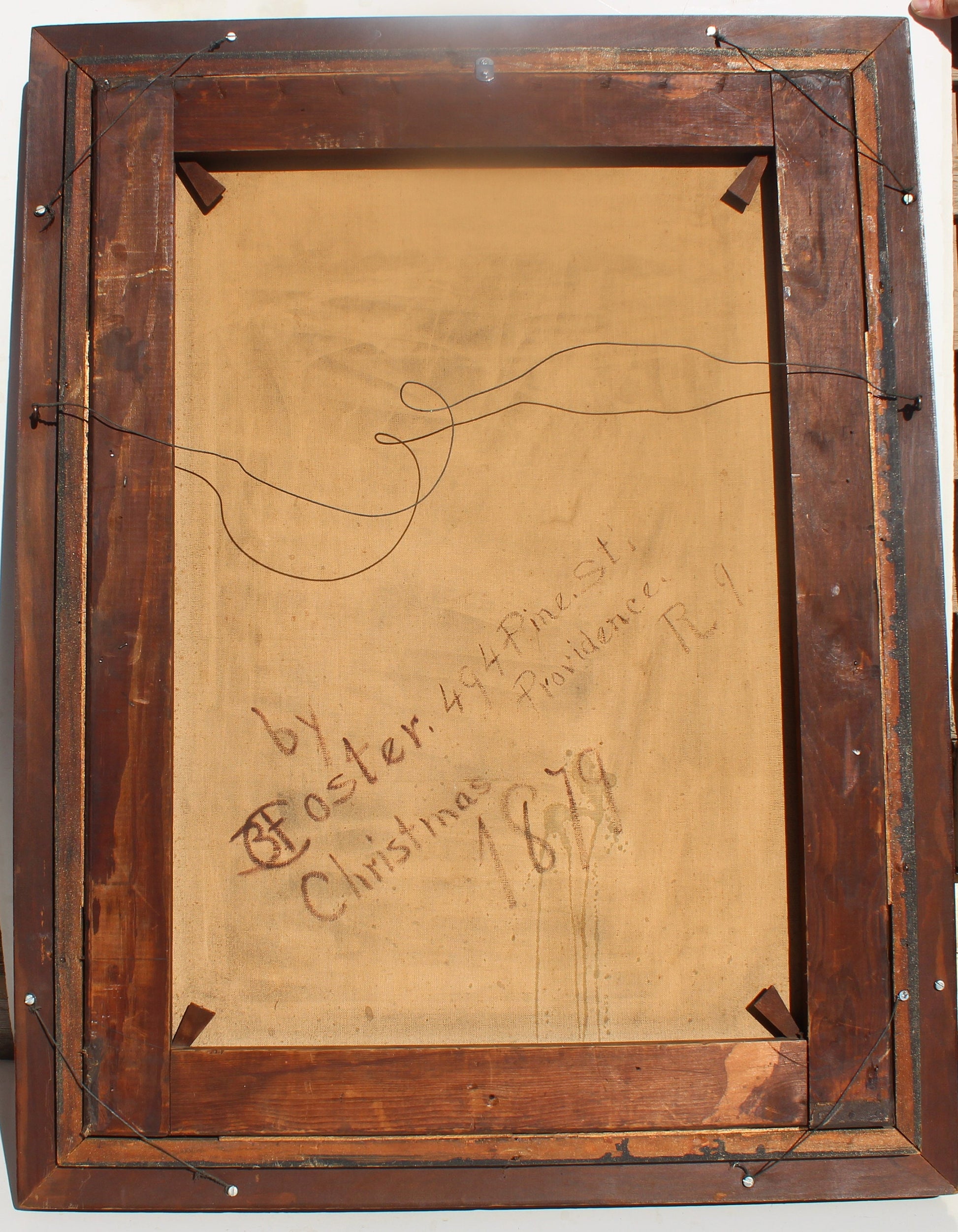 A note handwritten on the back of the canvas reads: “By C. Foster, 494 Pine St, Providence, RI. Christmas 1879”—suggesting the work was intended as a cherished holiday gift, dating the painting to the 1870s or earlier. While the front bears no visible signature, the rear inscription adds a layer of historical intrigue and provenance.