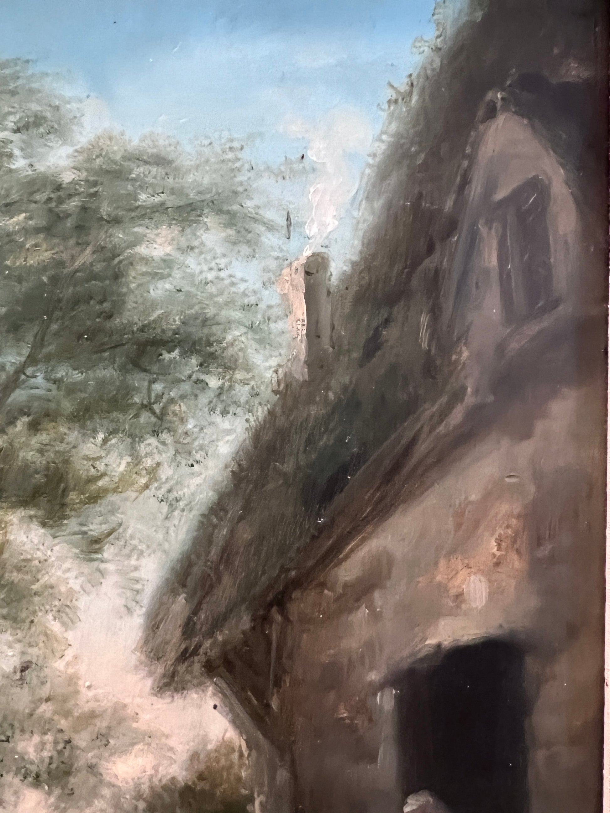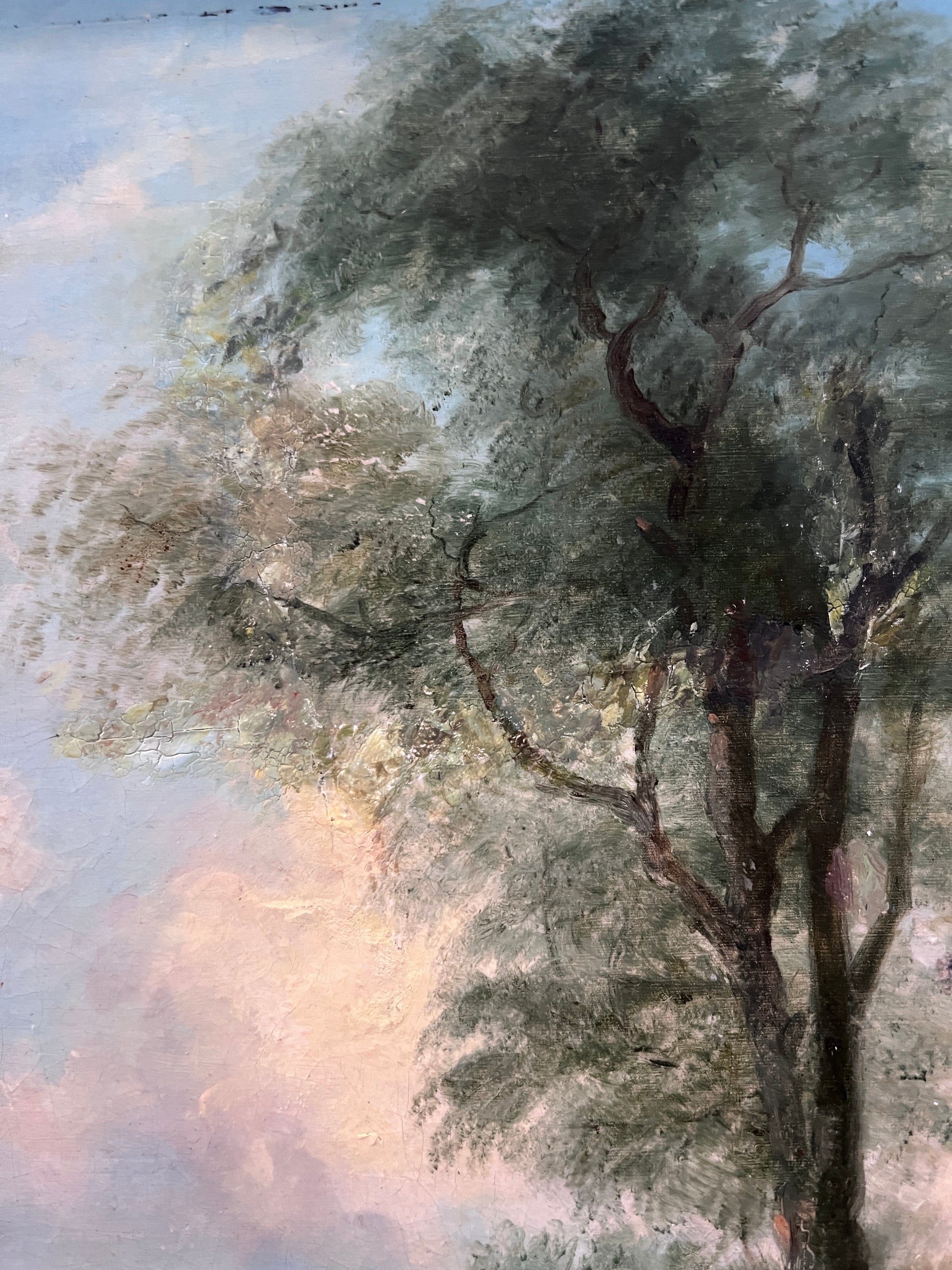 The artist demonstrates confident academic training in the modeling of figures, sensitive handling of light across the sky and foliage, and a restrained, earthy palette typical of the period. The scene carries a quiet narrative quality, inviting prolonged viewing and offering strong decorative presence suitable for both traditional and transitional interiors.