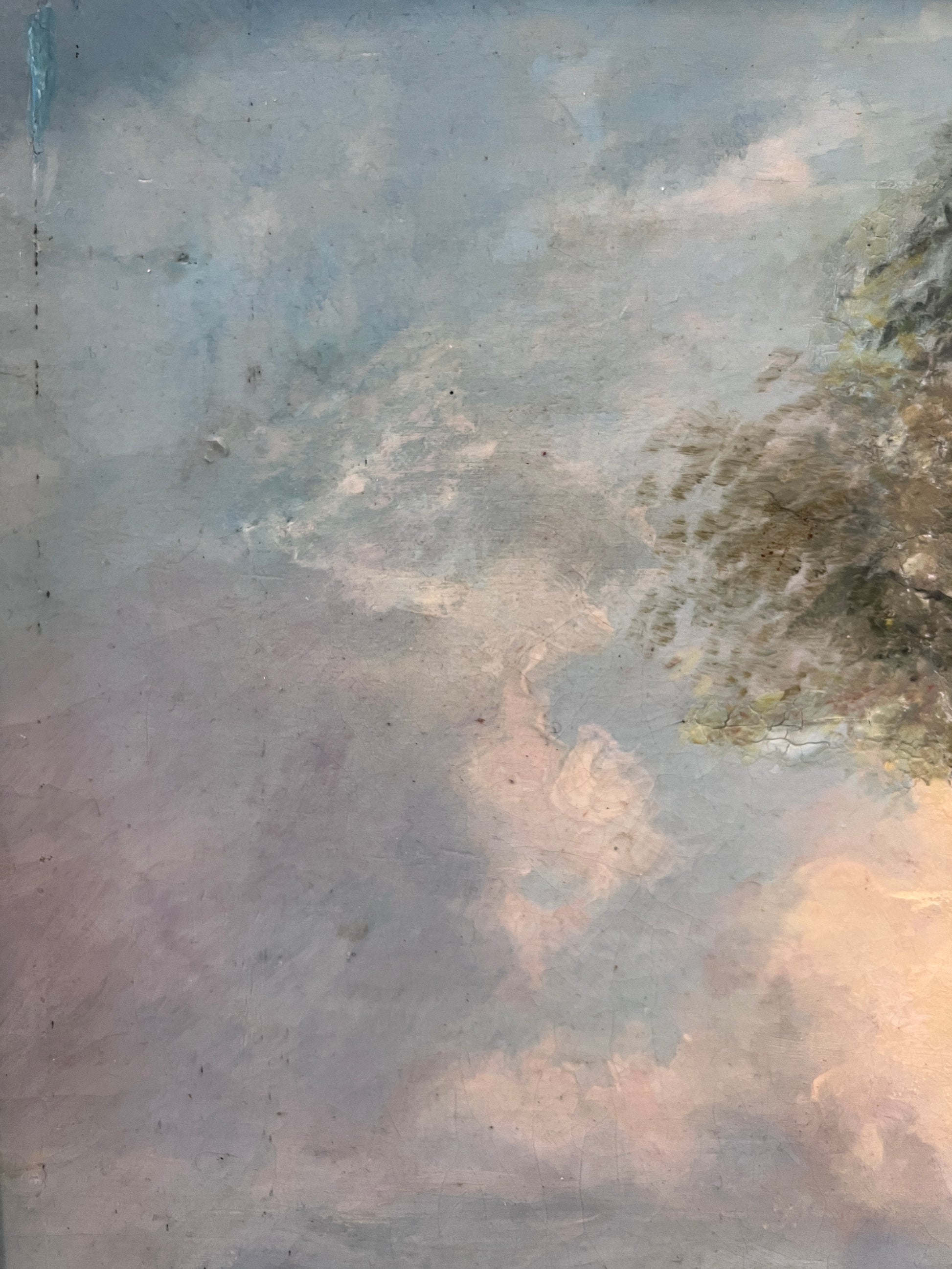 Consistent with age. Areas of historic restoration including scattered inpainting, minor paint losses primarily along the edges, visible craquelure, and canvas patches. These characteristics are typical for authentic 19th-century works and do not detract from the overall visual presence.Â