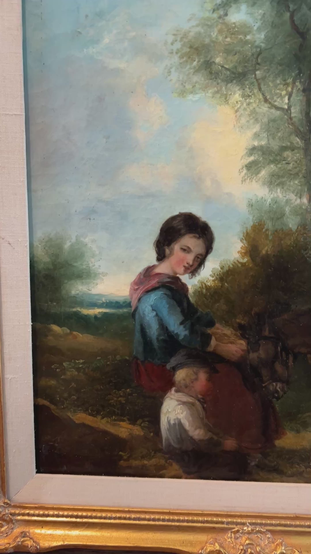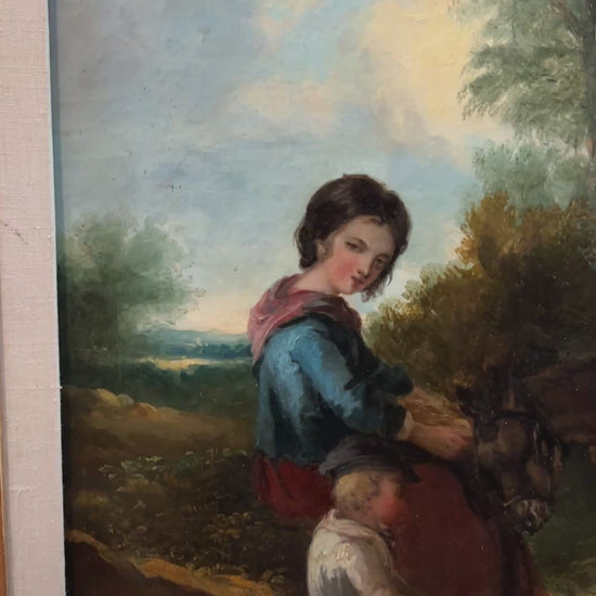 Attributed to European School (United Kingdom), 19th century. While the signature is illegible, the style, subject matter, and technique are consistent with British and broader European rural genre painting of the mid-to-late 1800s. Such works were often created by academically trained artists influenced by Romantic and early Realist traditions, emphasizing moral sentiment, family life, and pastoral settings.