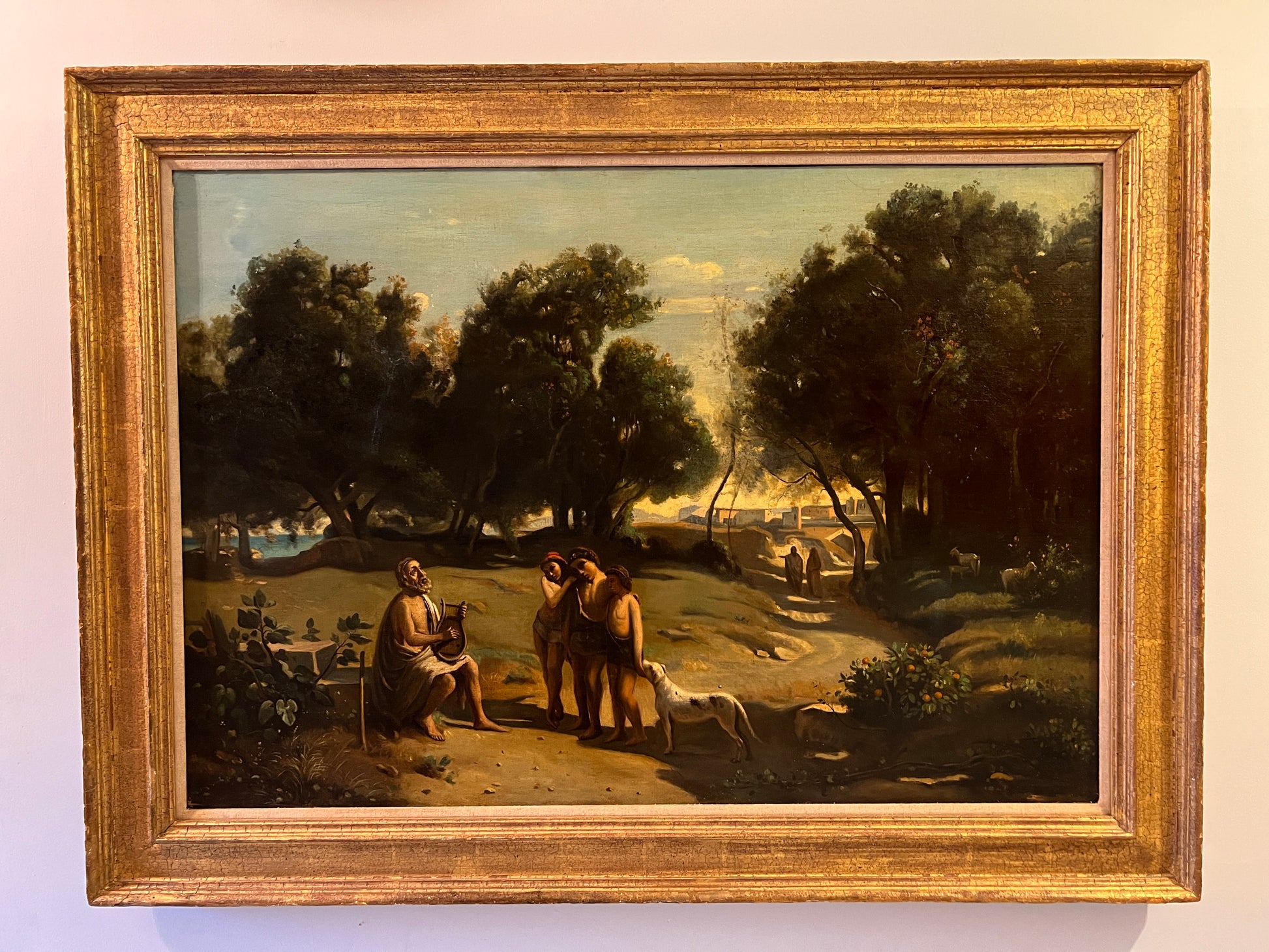 This captivating 19th-century neoclassical oil on canvas depicts the legendary Greek poet Homer playing his lyre beneath a canopy of ancient trees. Seated barefoot on a simple stool and draped in classical robes, Homer becomes the focal point of the scene, surrounded by three attentive youths and a loyal dog at his side.