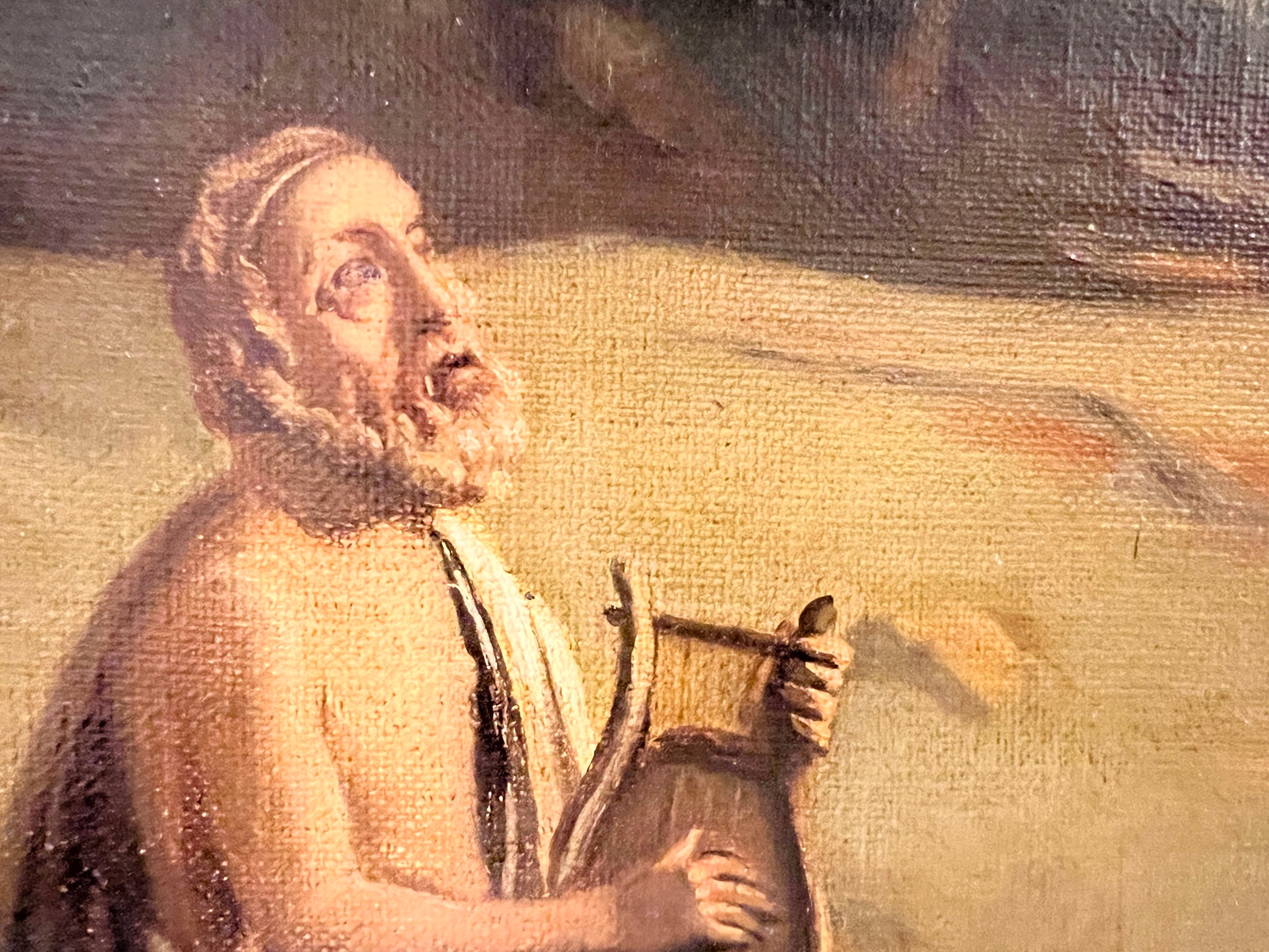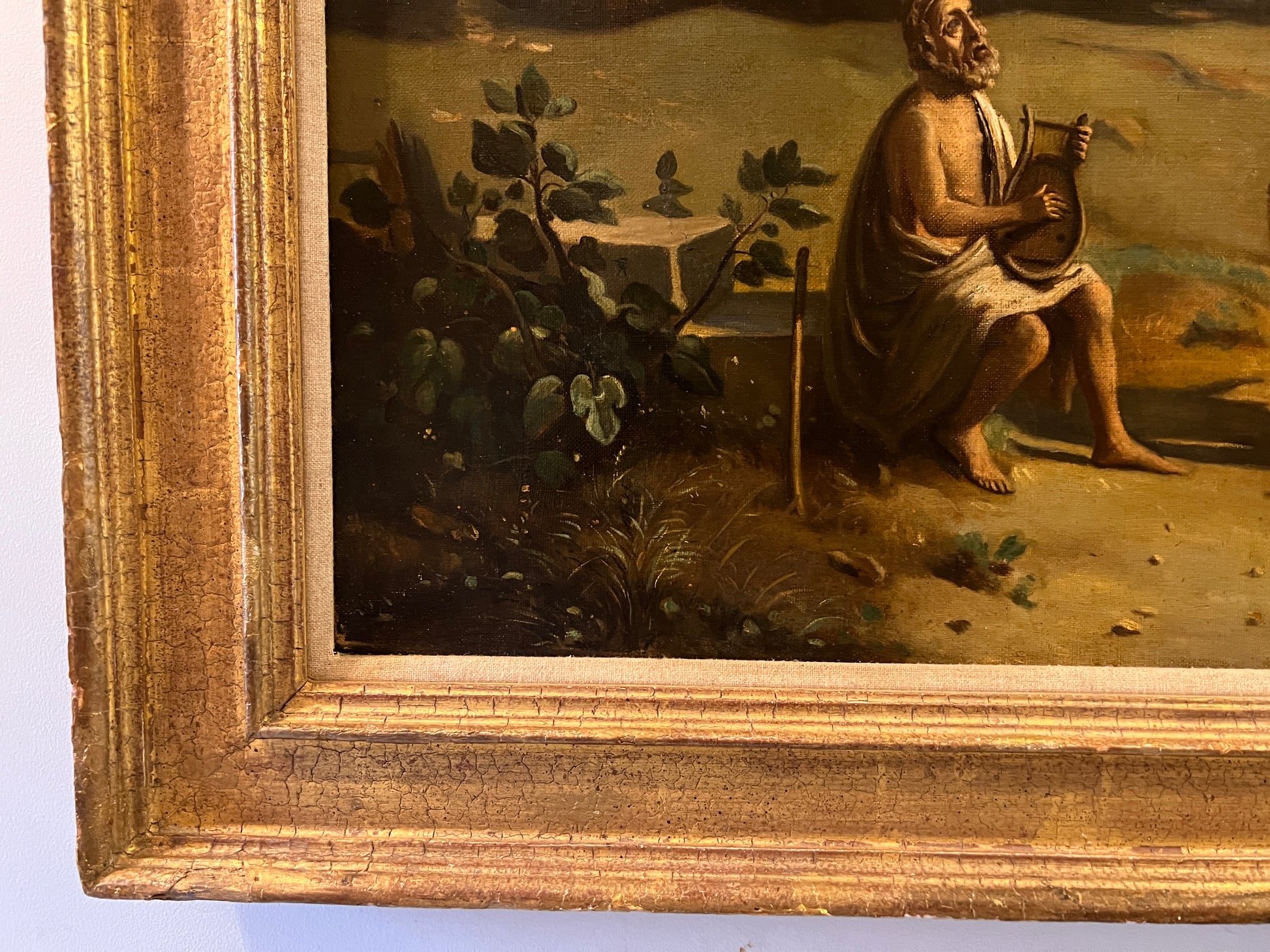 Antique 19C. Oil painting on canvas, neoclassical Scene, Homer playing his Lyre