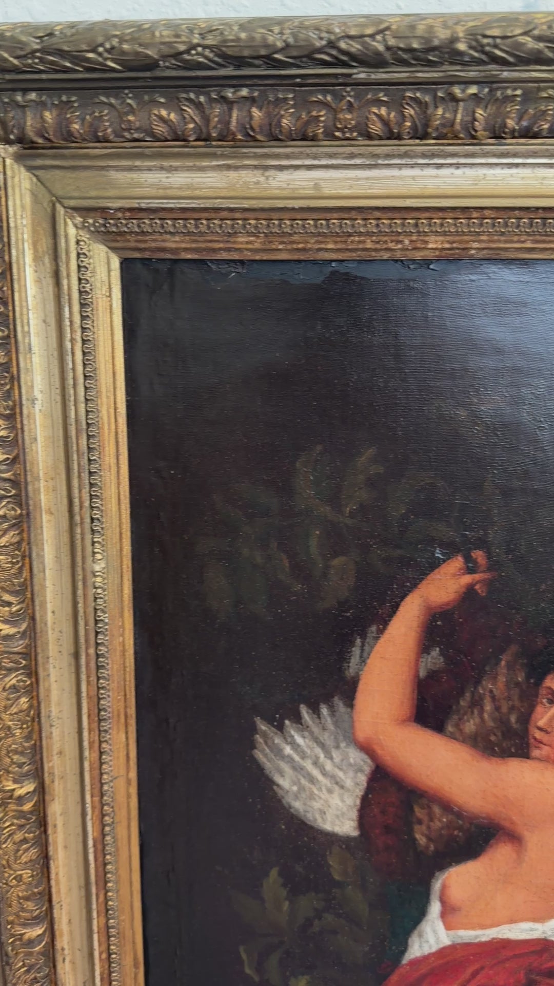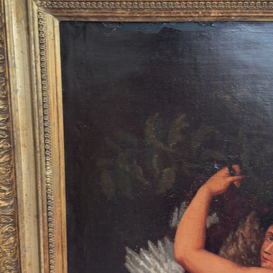 The surface shows a natural network of age-related craquelure, contributing to the authenticity and historical character of the work. The painting is housed in an imposing gilt wood frame with classical ornamentation, well suited to the scale and subject, and ready for display in a formal interior or curated collection of 19th-century academic art.