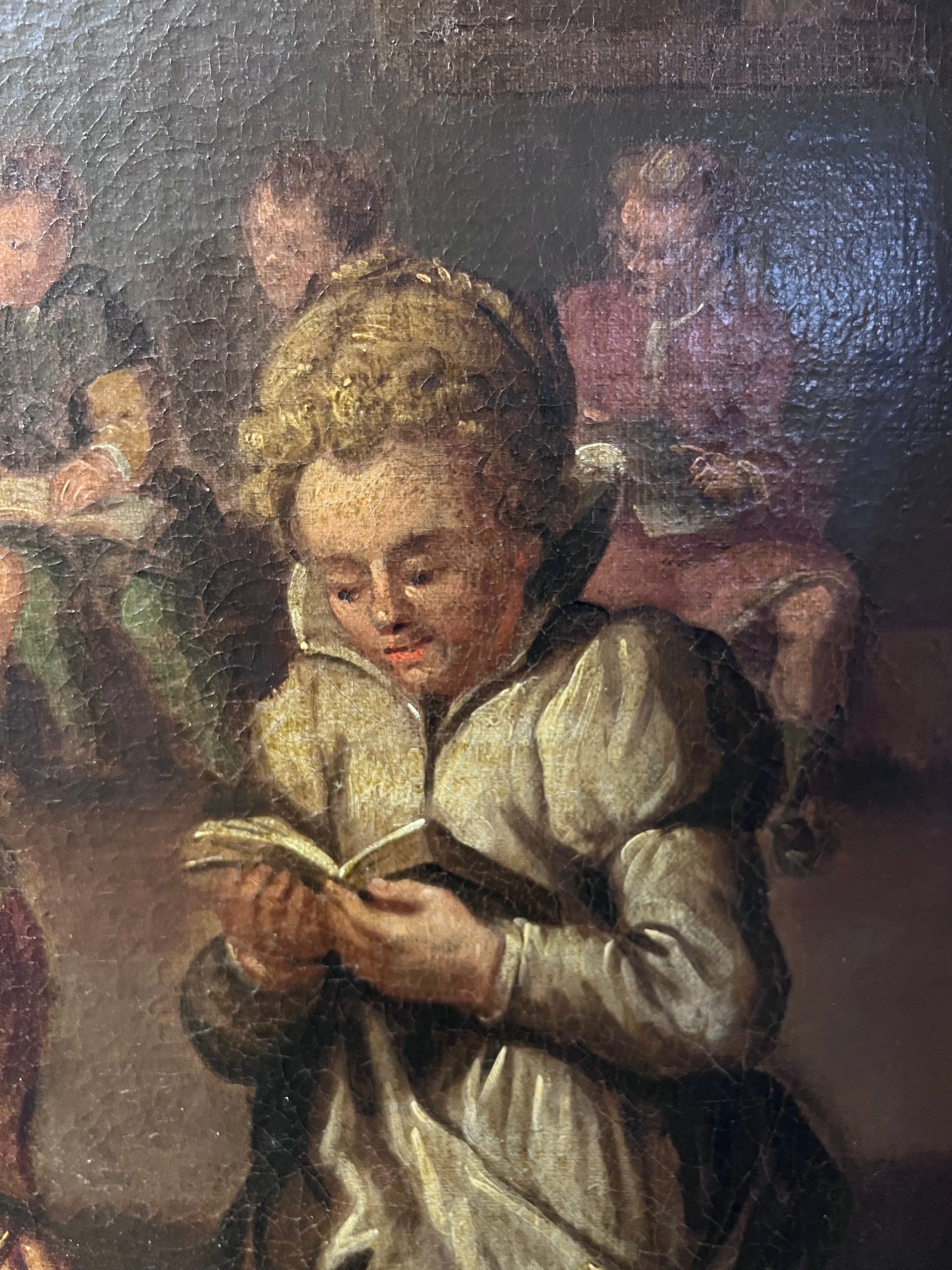 Executed with deep earth tones, soft lighting, and expressive detail, the scene brings warmth and subtle drama to an otherwise humble setting. From the careful folds in the garments to the individualized faces of the children, this piece reflects a painterly discipline reminiscent of Ostade’s intimate depictions of peasant life.