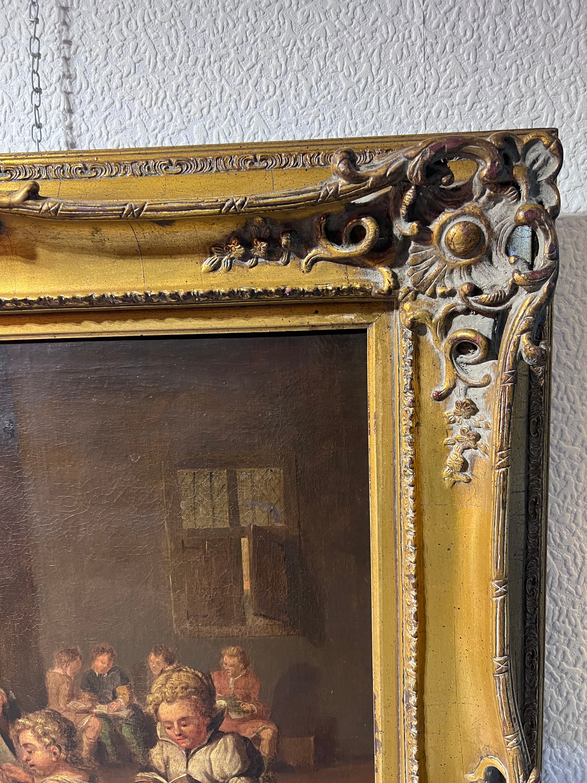 Offered in an elaborately carved and gilded antique frame with floral detailing and corner scrollwork. The frame complements the warm palette and genre theme beautifully.