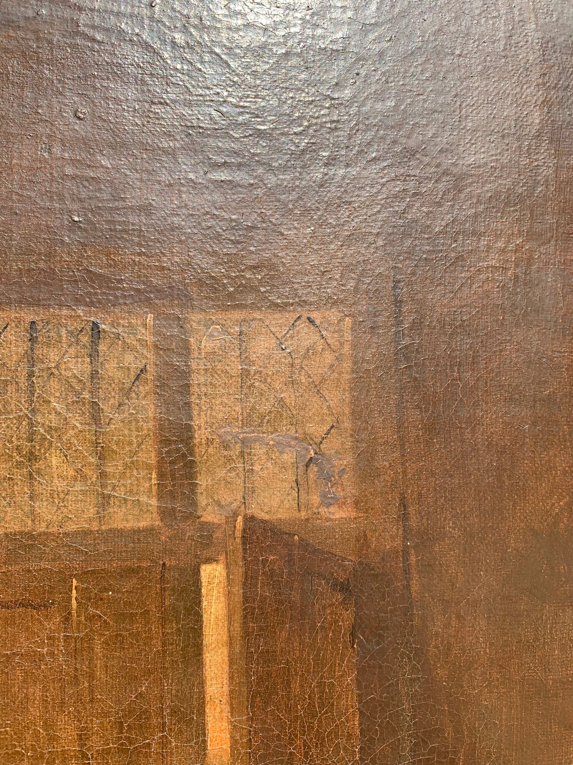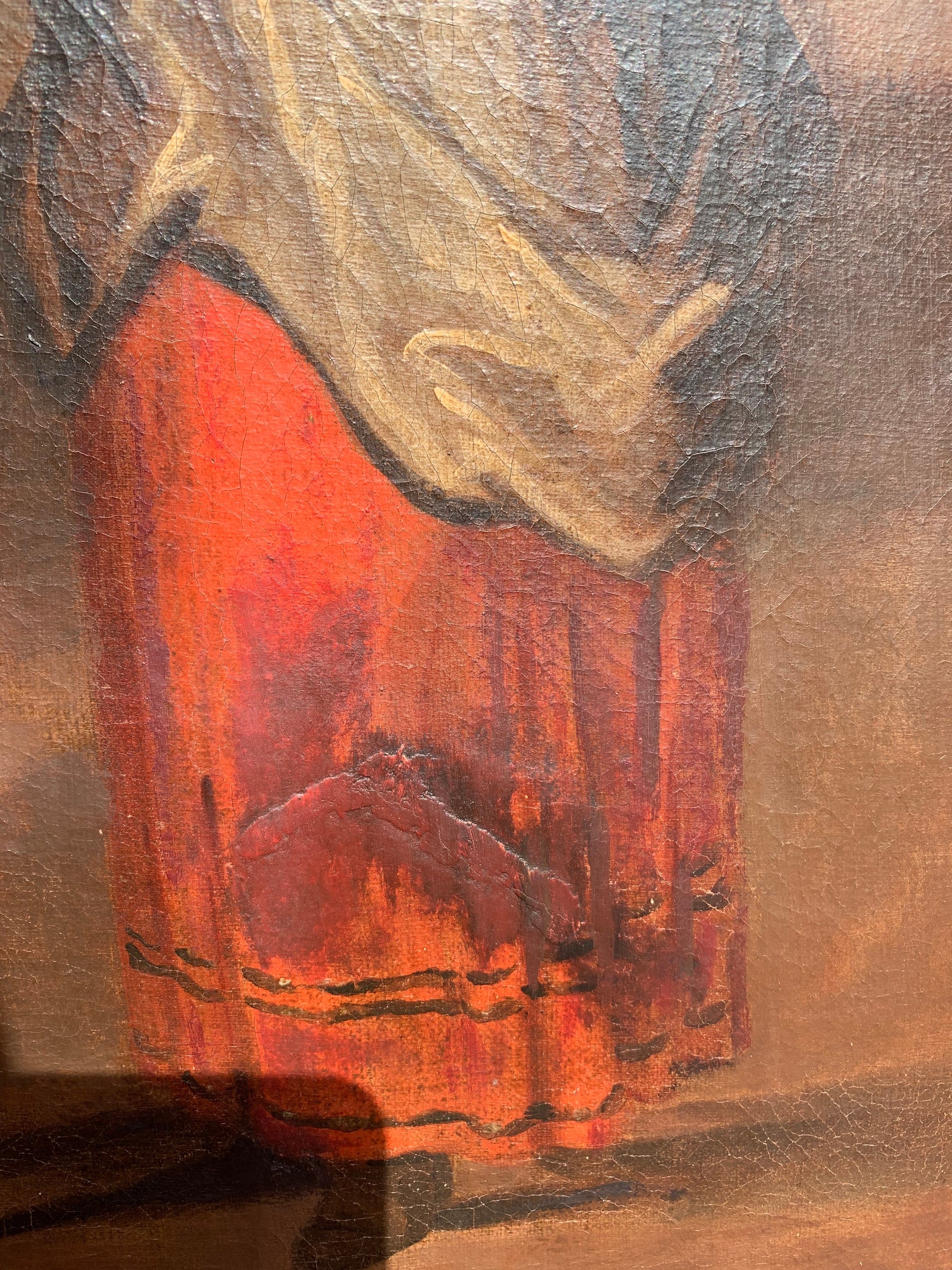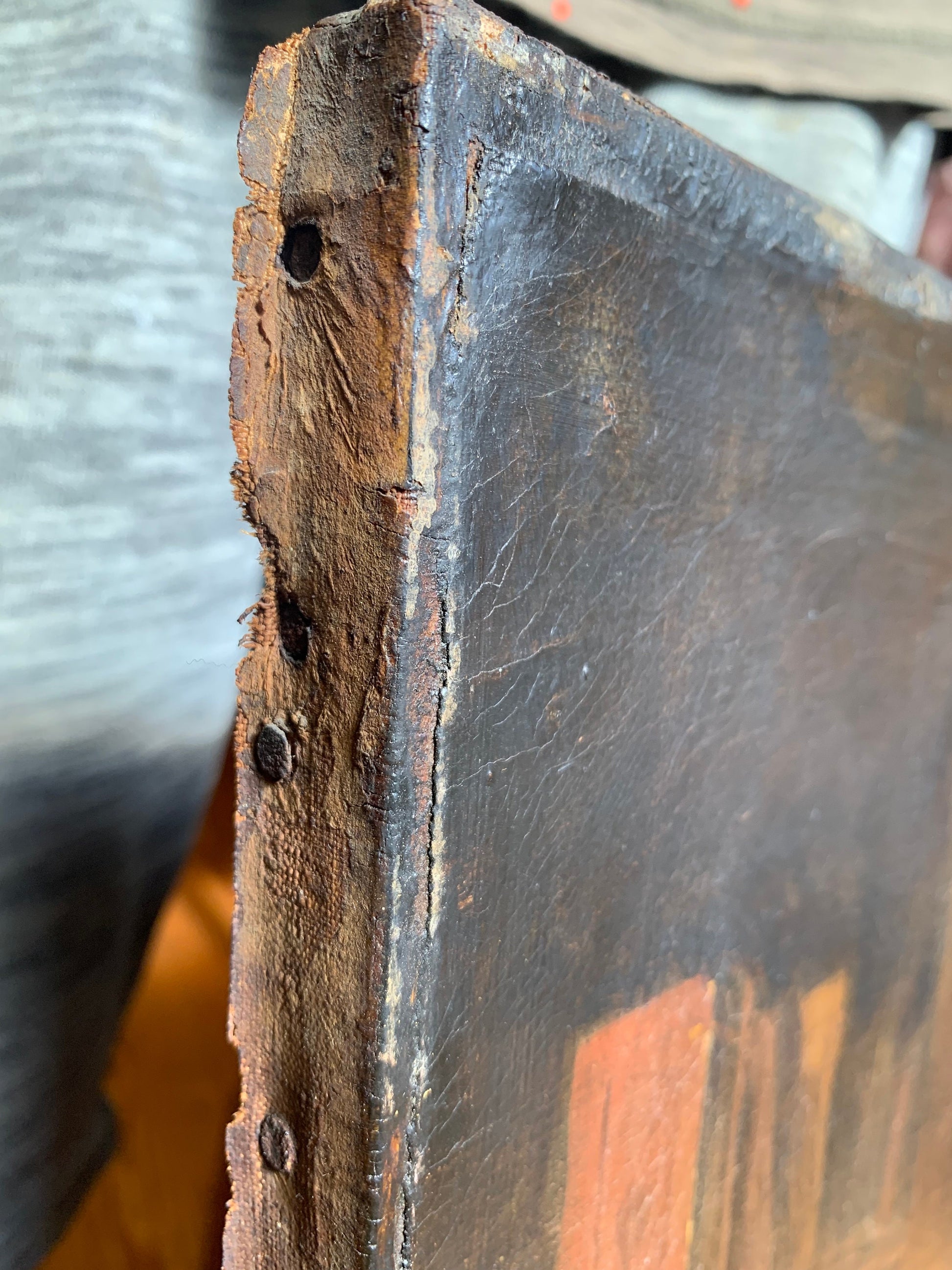 Painting:Â Stable overall with vibrant coloration. Minor craquelure consistent with age. One past puncture repair visible on the reverse (white patch).