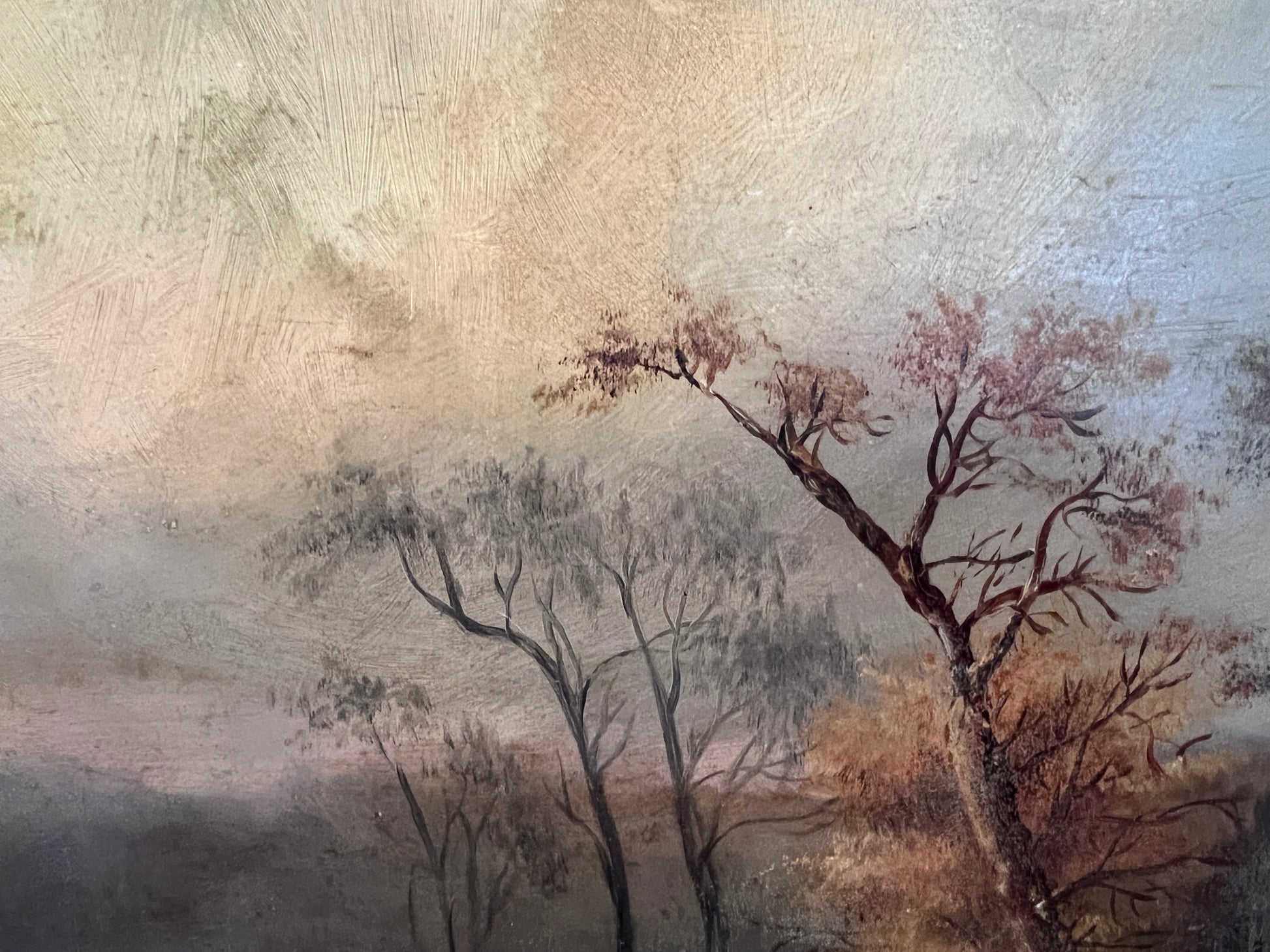 This serene antique Dutch oil painting portrays a tranquil winter landscape, where a rustic cabin nestles beneath bare trees by a frozen pond. The misty horizon and muted tones of gold, brown, and gray create an atmosphere of calm solitude, typical of 19th-century Dutch tonalism. The delicate brushwork captures the stillness of the season — the quiet air, the reflection of pale light on snow, and the subtle depth of the countryside fading into the mist.