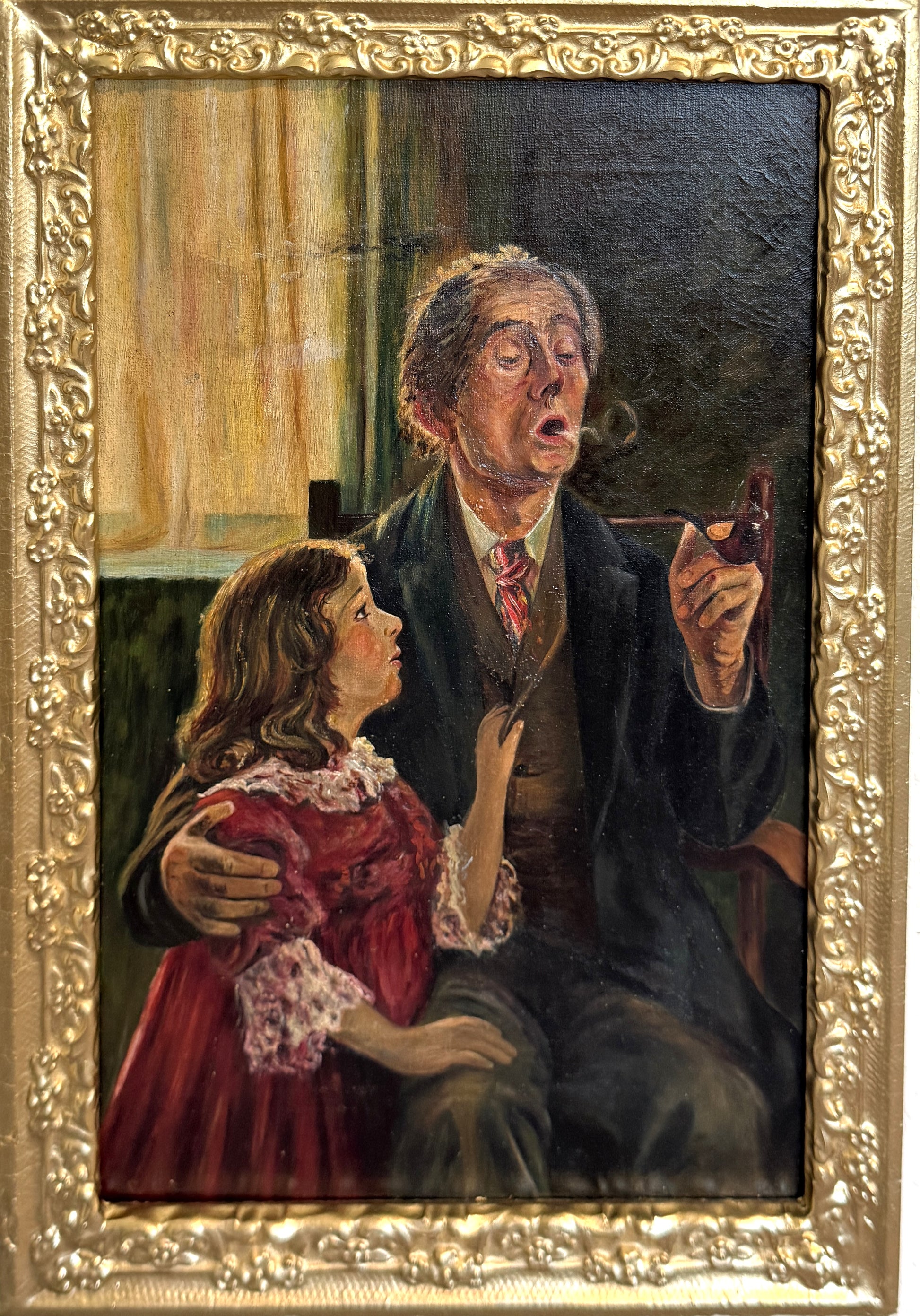 Antique Oil Painting Genre Scene Man With Pipe Child Interior Gilt Frame