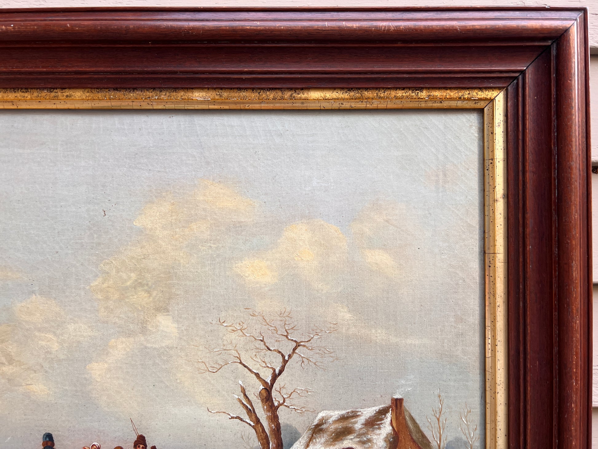 Vintage oil painting on canvas, Winter Landscape, Village, figures. Framed