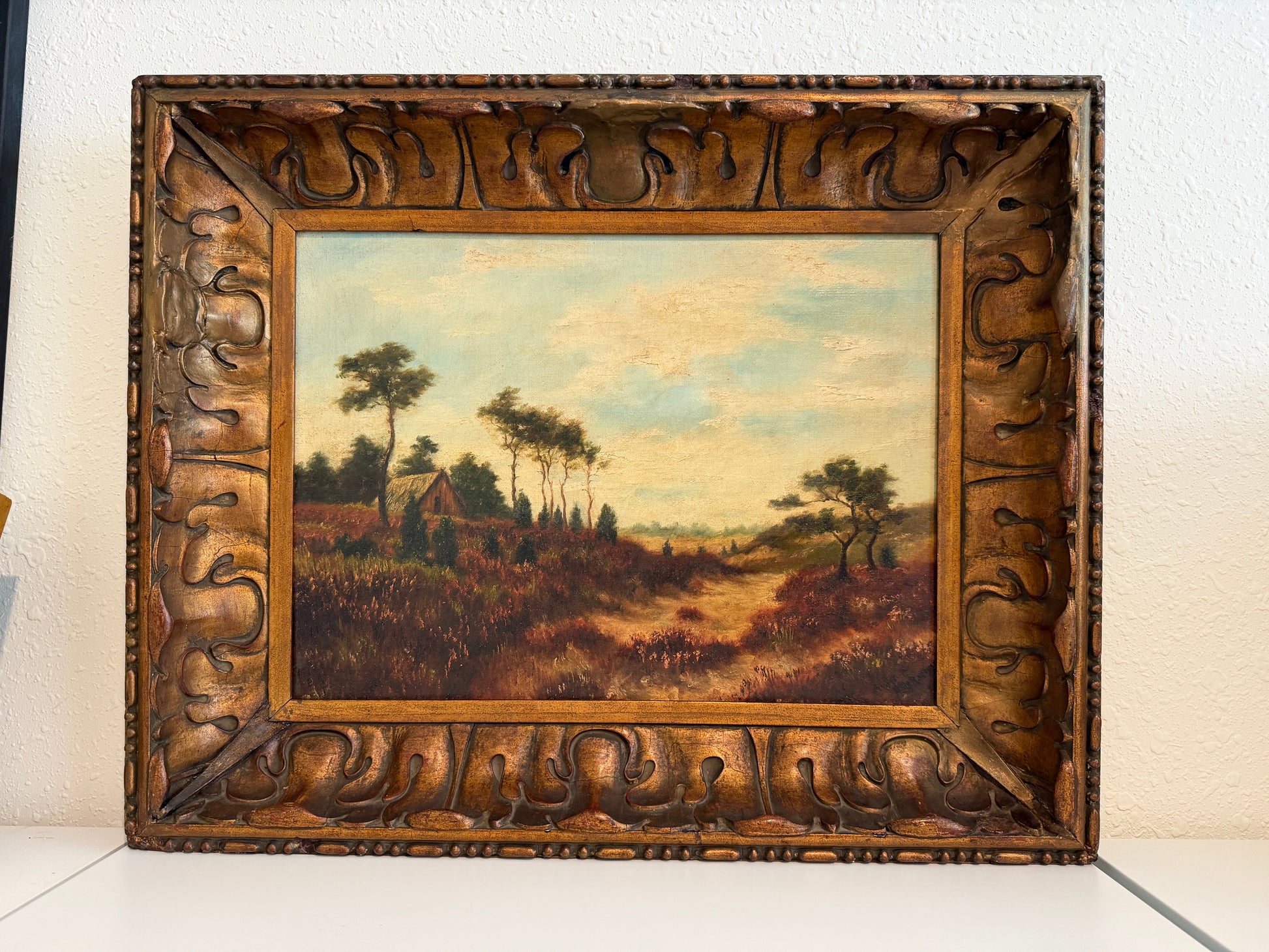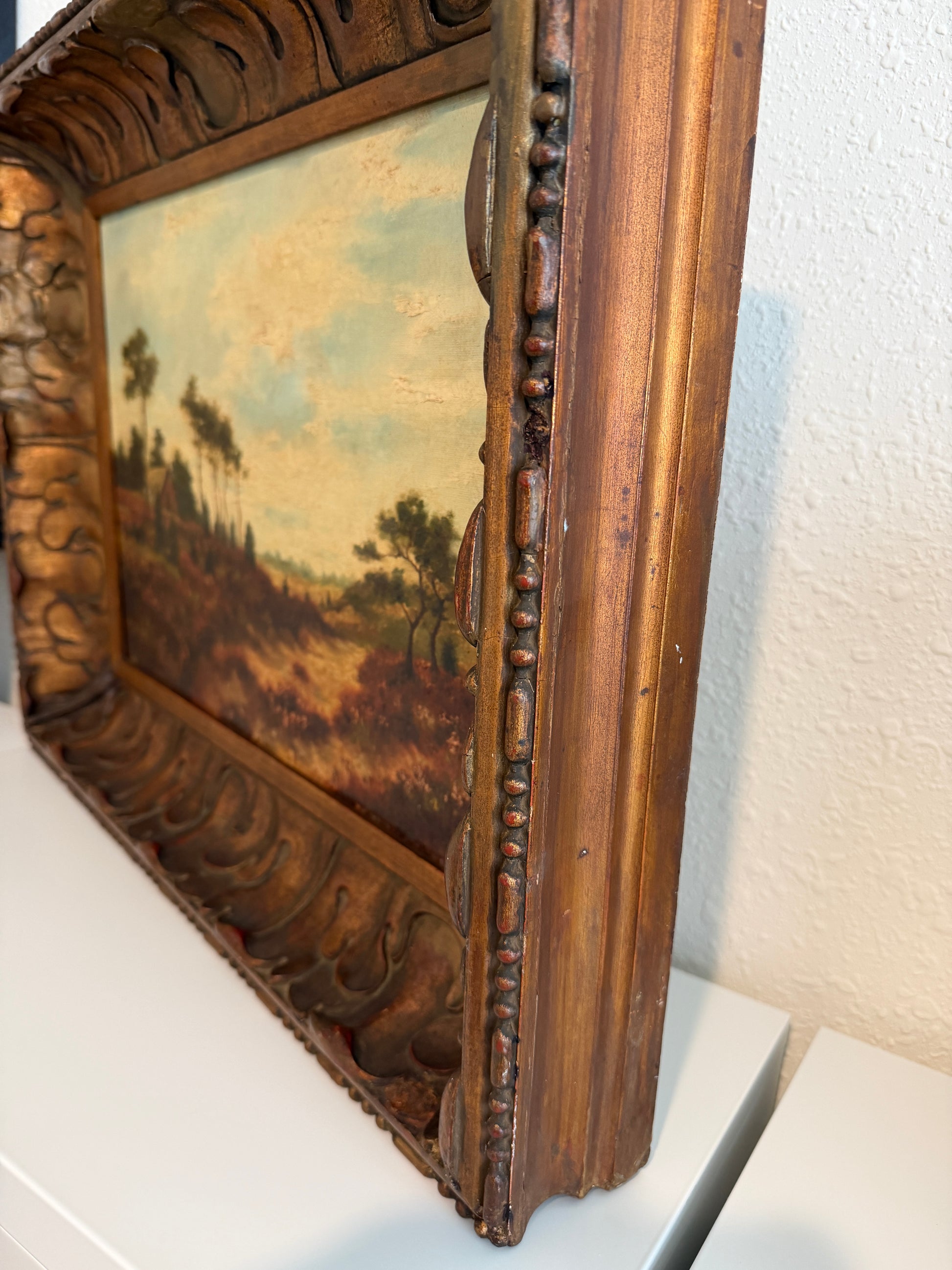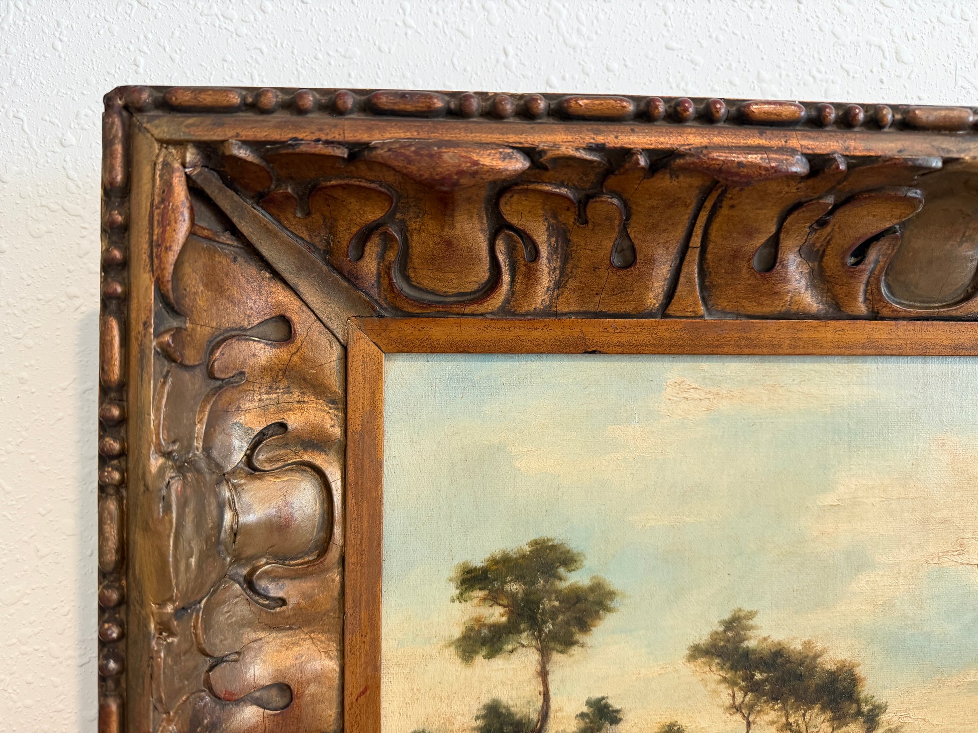 The canvas has been professionally relined at some point in its history, a common conservation practice for works of this period, helping to ensure structural stability and longevity. The painting is presented in a richly carved antique wooden frame with warm gilt tones that beautifully complement the landscape.