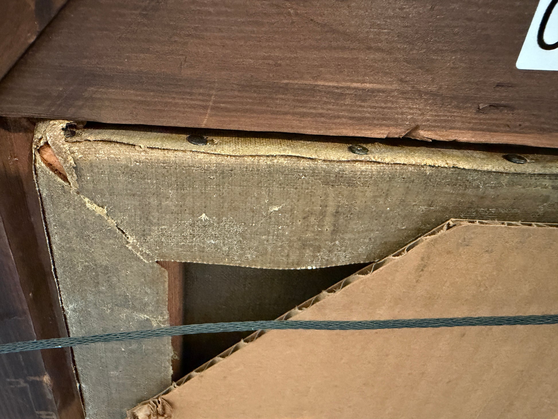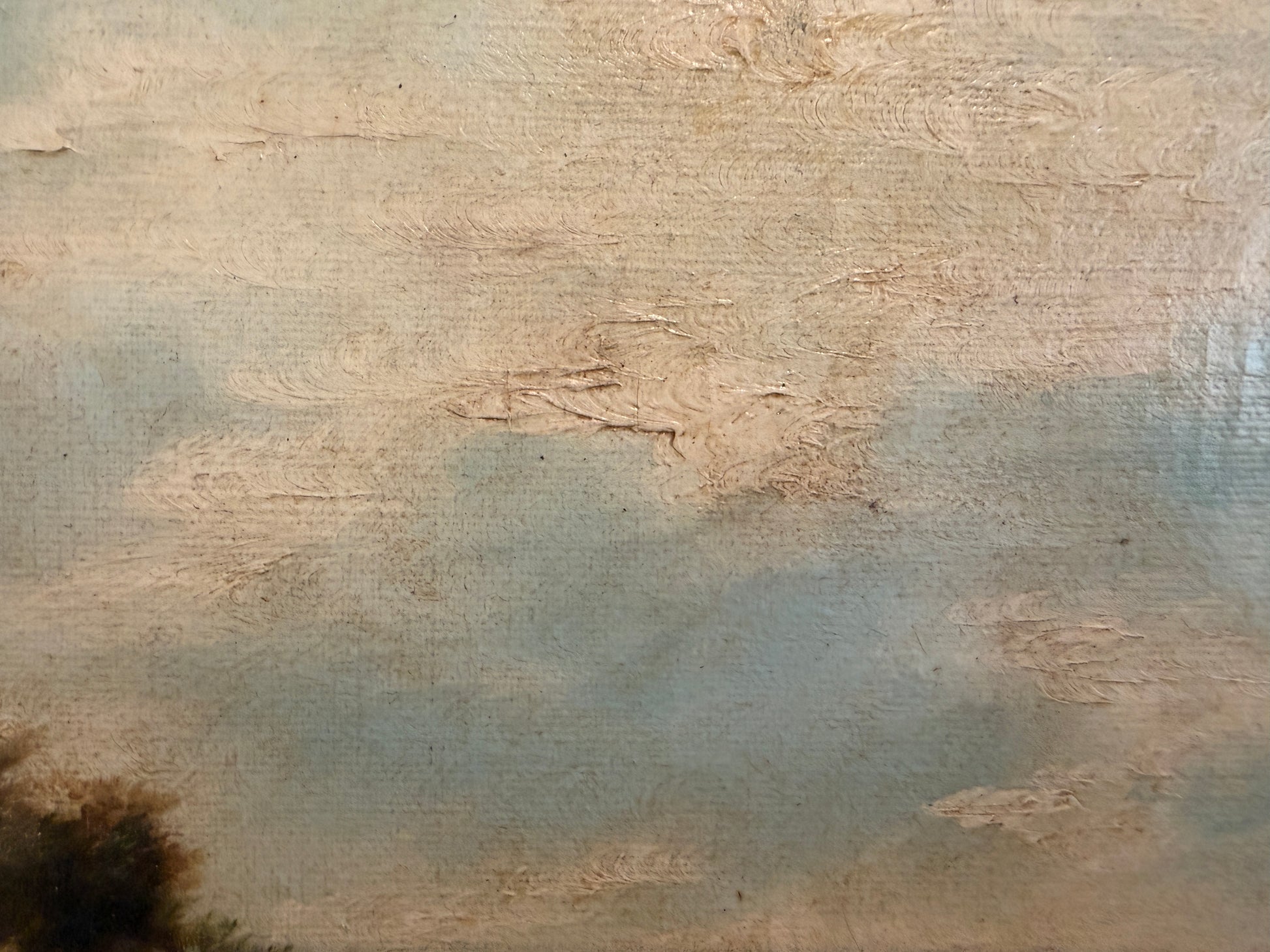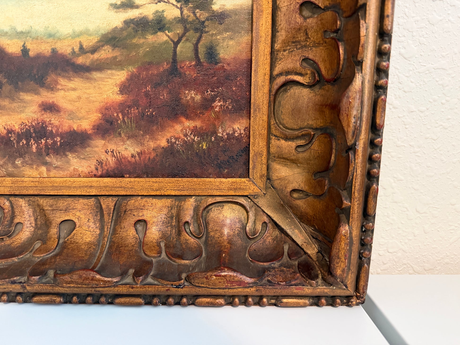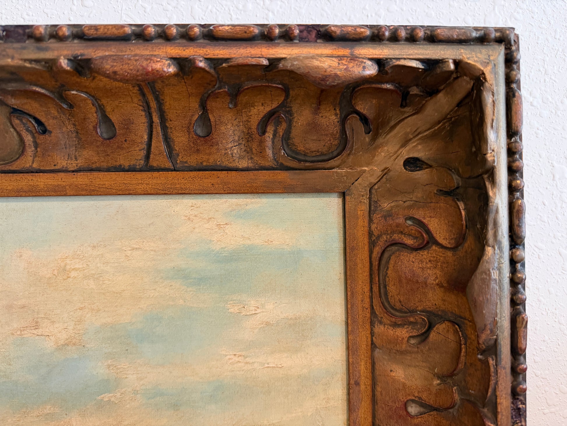 The canvas has been professionally relined at some point in its history, a common conservation practice for works of this period, helping to ensure structural stability and longevity. The painting is presented in a richly carved antique wooden frame with warm gilt tones that beautifully complement the landscape.