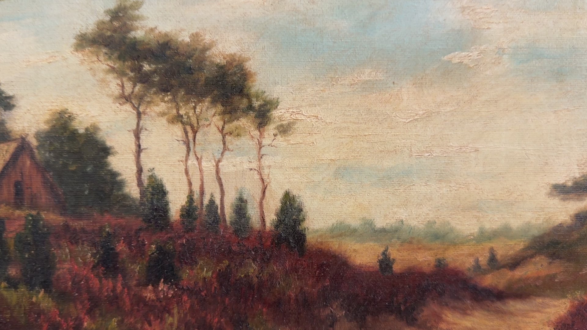 This charming late 19th century English School oil painting depicts a tranquil rural landscape with a rustic cottage nestled among tall trees and rolling heathland. A winding sandy path leads the viewer gently through warm-toned grasses toward the distant horizon beneath a softly atmospheric sky. The earthy palette of ochres, browns, and muted greens reflects the character of traditional Victorian pastoral landscapes.