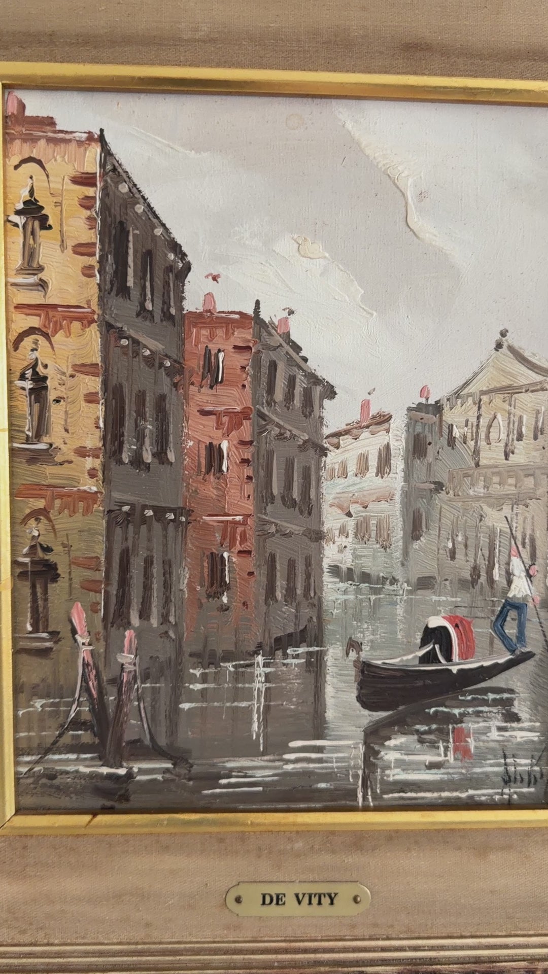 Original vintage oil painting on canvas by Italian artist Antonio De Vity (1901–1993) depicting a romantic Venetian canal scene with a gondolier navigating through historic buildings along the quiet waterway. The composition captures the timeless atmosphere of Venice with warm architectural tones, soft reflections in the canal, and expressive brushwork characteristic of De Vity’s European cityscape paintings.