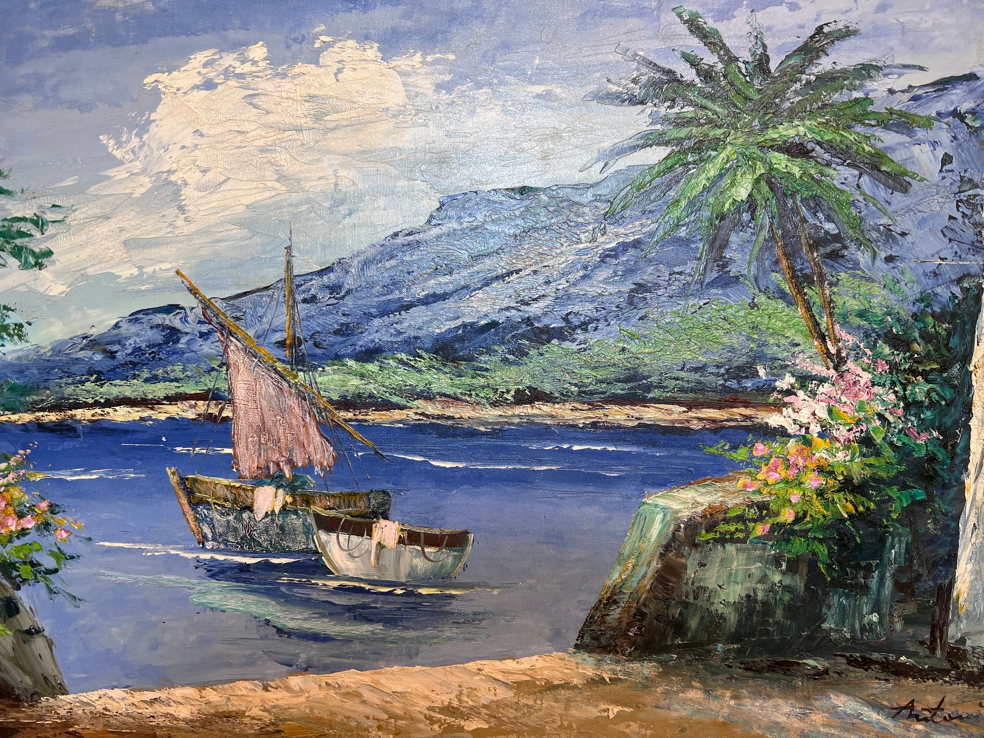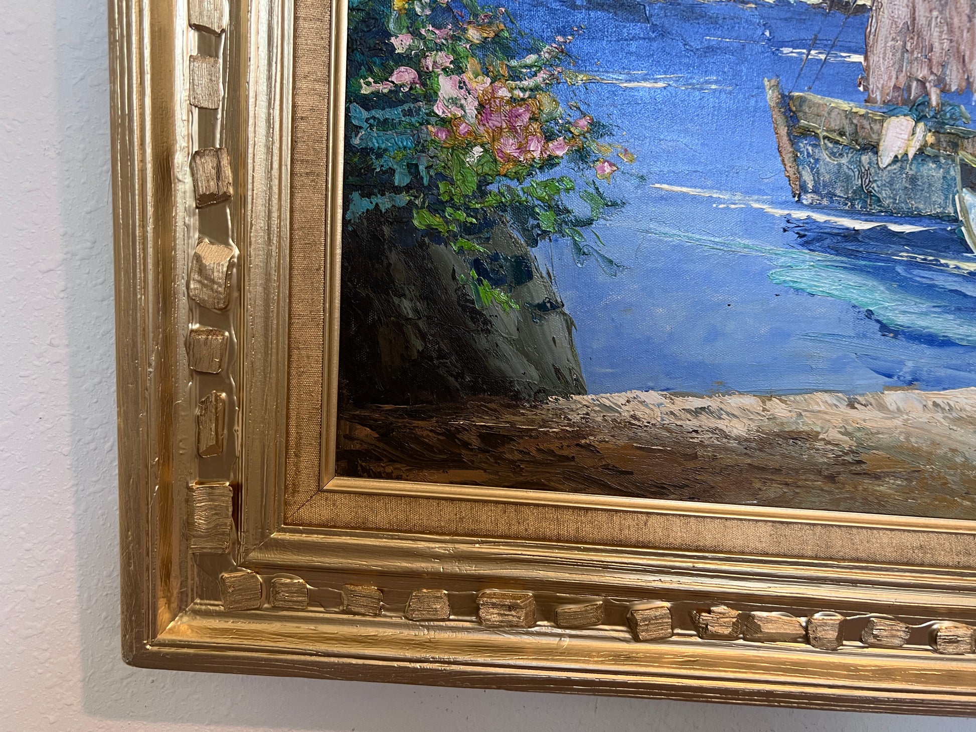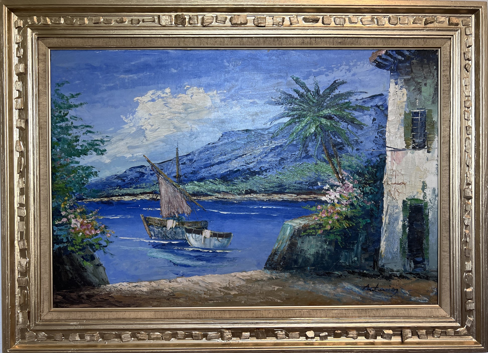 This vibrant original oil painting on canvas by listed artist Antoniou depicts a charming Mediterranean coastal scene, complete with rustic sailboats drifting on tranquil blue waters, a classic stucco villa, lush palm trees, and distant mountains under a brilliant sky. The artist’s use of bold, expressive brushwork and rich, sunlit color captures the warmth and vibrancy of coastal life. A floral garden in bloom and the glistening shoreline enhance the idyllic, timeless atmosphere.