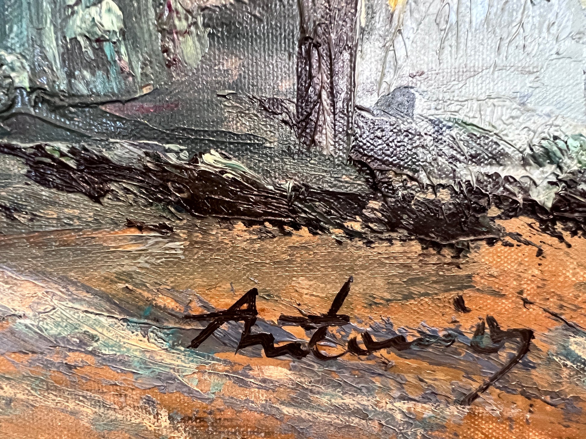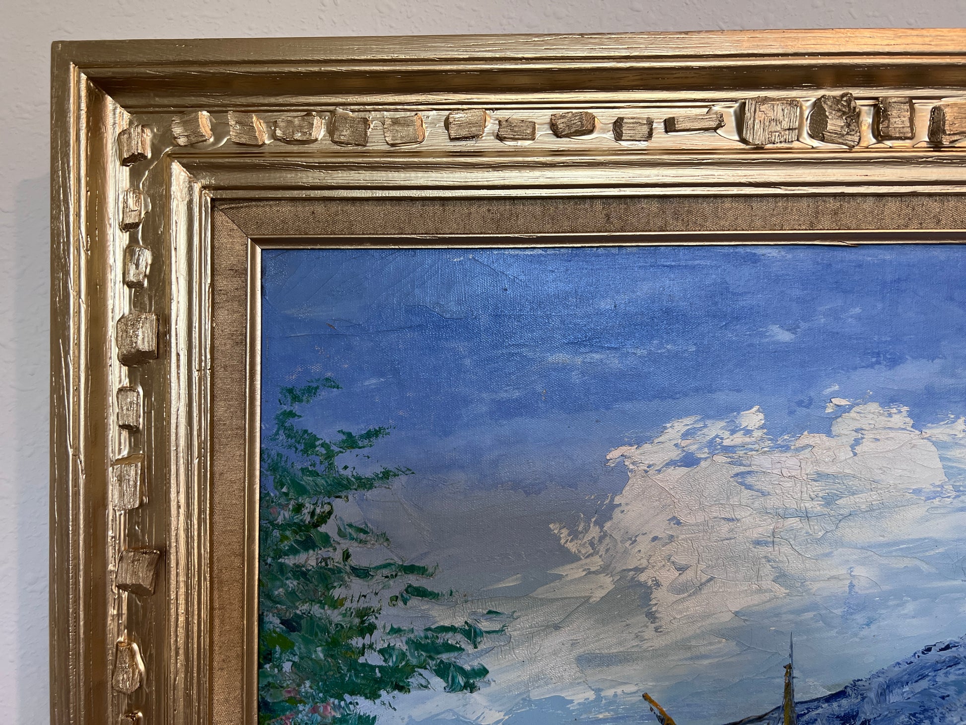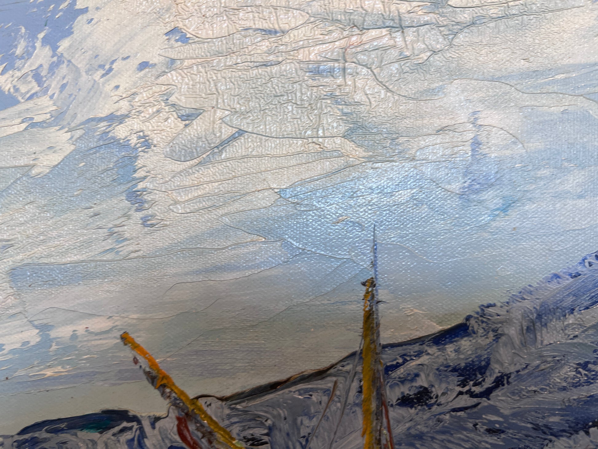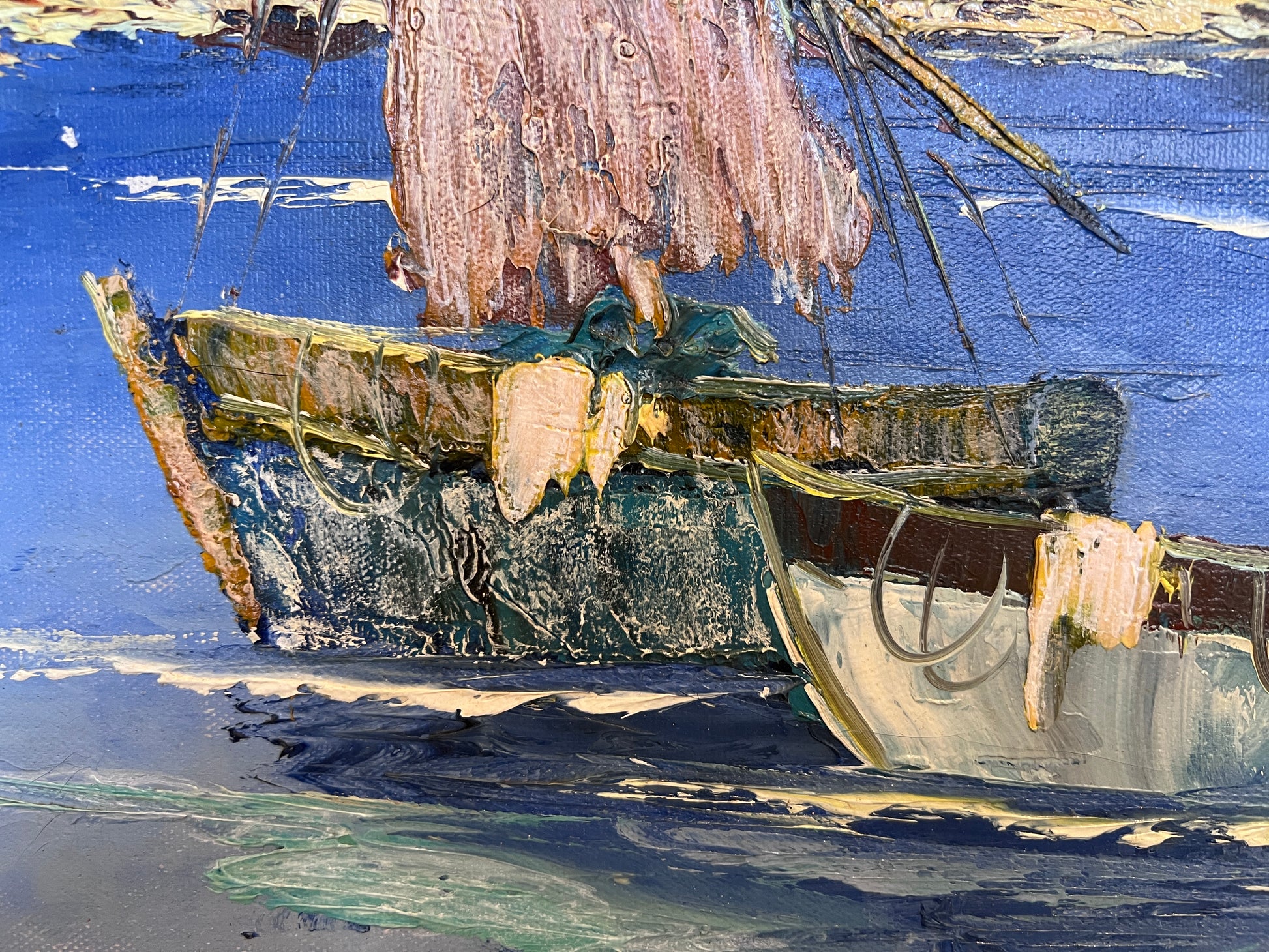This vibrant original oil painting on canvas by listed artist Antoniou depicts a charming Mediterranean coastal scene, complete with rustic sailboats drifting on tranquil blue waters, a classic stucco villa, lush palm trees, and distant mountains under a brilliant sky. The artist’s use of bold, expressive brushwork and rich, sunlit color captures the warmth and vibrancy of coastal life. A floral garden in bloom and the glistening shoreline enhance the idyllic, timeless atmosphere.