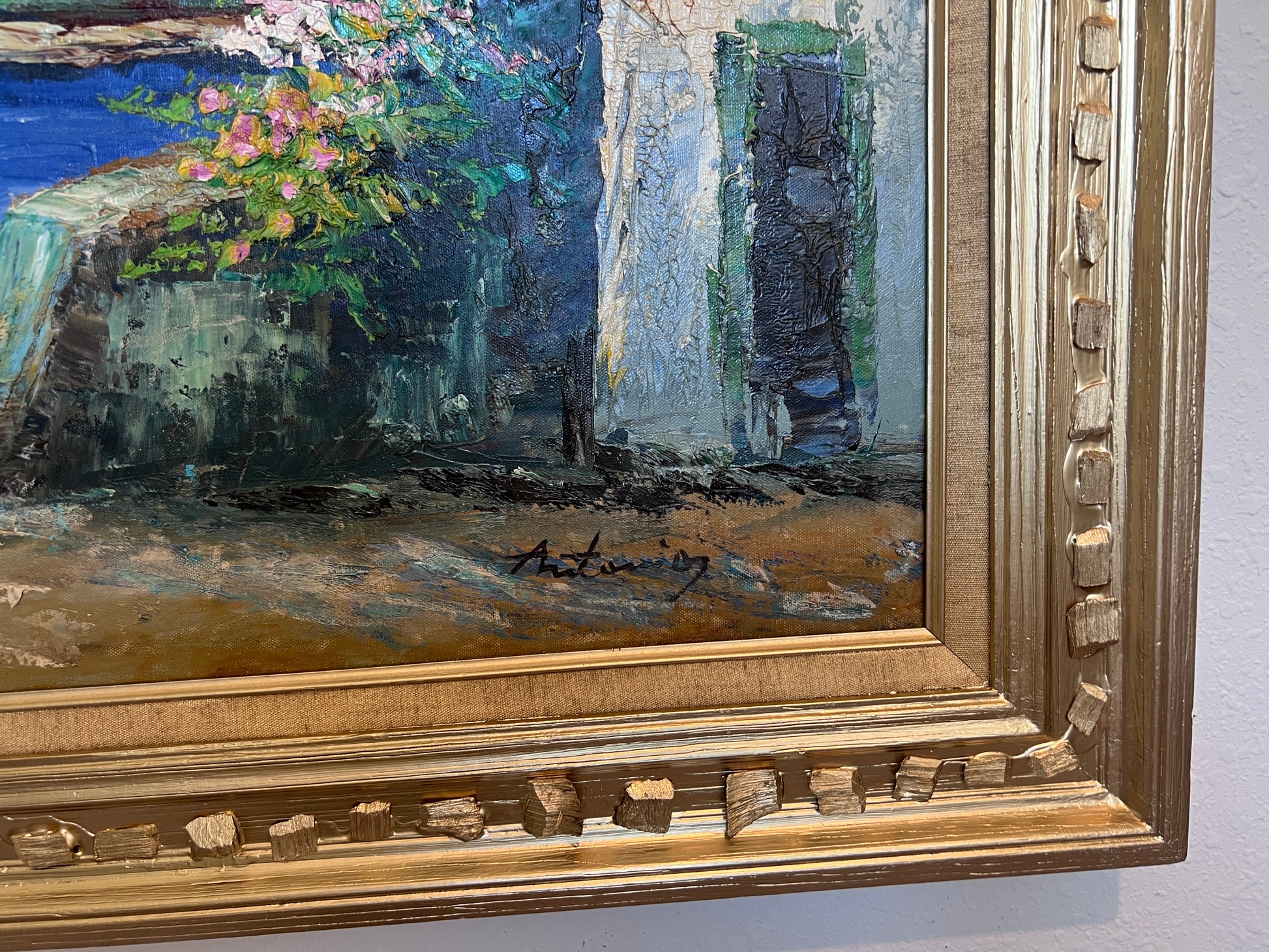 The painting is signed "Antoniou" in the lower right corner and presented in a heavy gold-tone carved wood frame that adds elegance and depth to the composition. This piece makes a perfect focal point for coastal, Mediterranean, or vintage-inspired interiors.