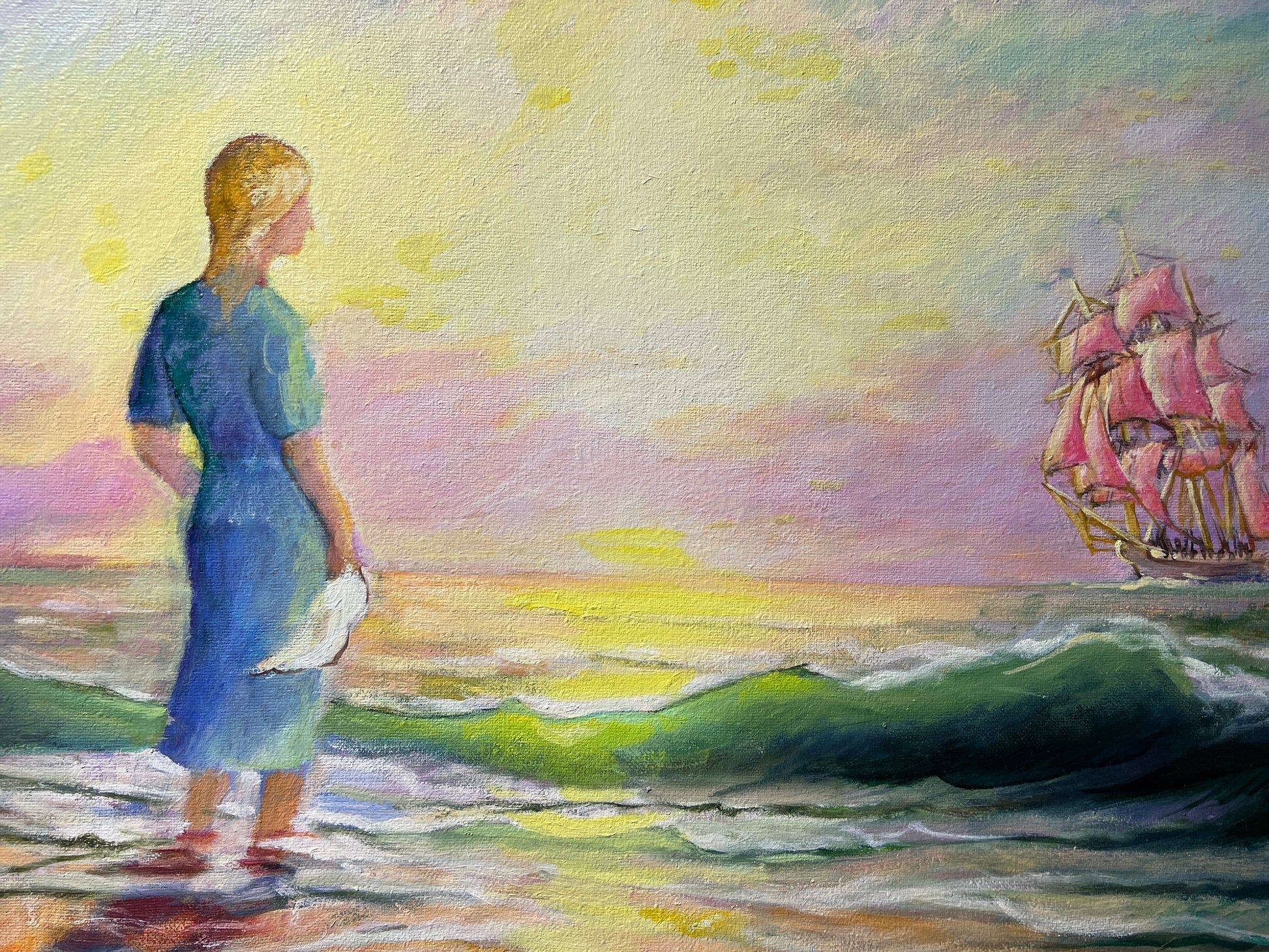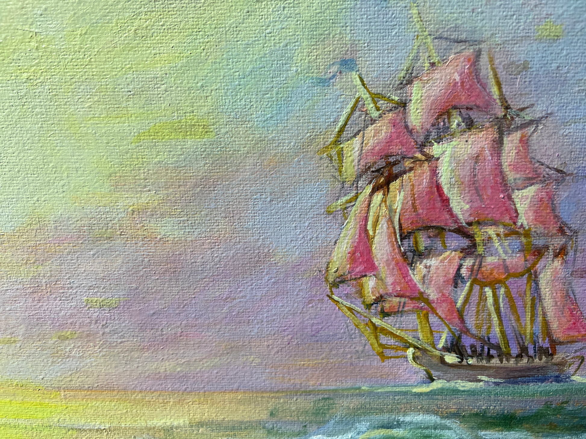 This is an original signed oil painting on canvas by Russian artist N.I. Dobritsin, titled "At Dawn", dated 2017. The painting beautifully illustrates a romantic scene inspired by Alexander Grin's beloved fairy tale Scarlet Sails.