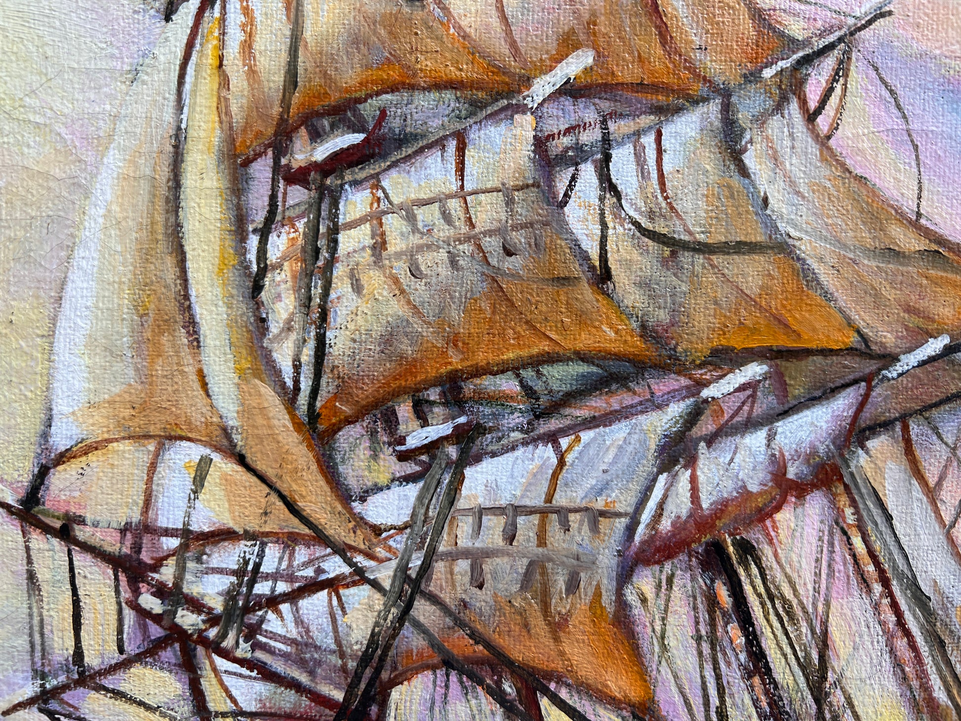 This dynamic original oil painting on canvas by Russian artist N.I. Dobritsin captures the raw energy of a sailing ship braving the high seas. Titled "Through the Storm" and dated 2019 on verso, the work features bold brushstrokes and vivid color contrasts, with deep ocean waves crashing beneath the vessel’s bow. The glowing sky blends warm sunset tones with cooler blue and lavender shades, creating a dramatic backdrop for the ship’s wind-filled sails.