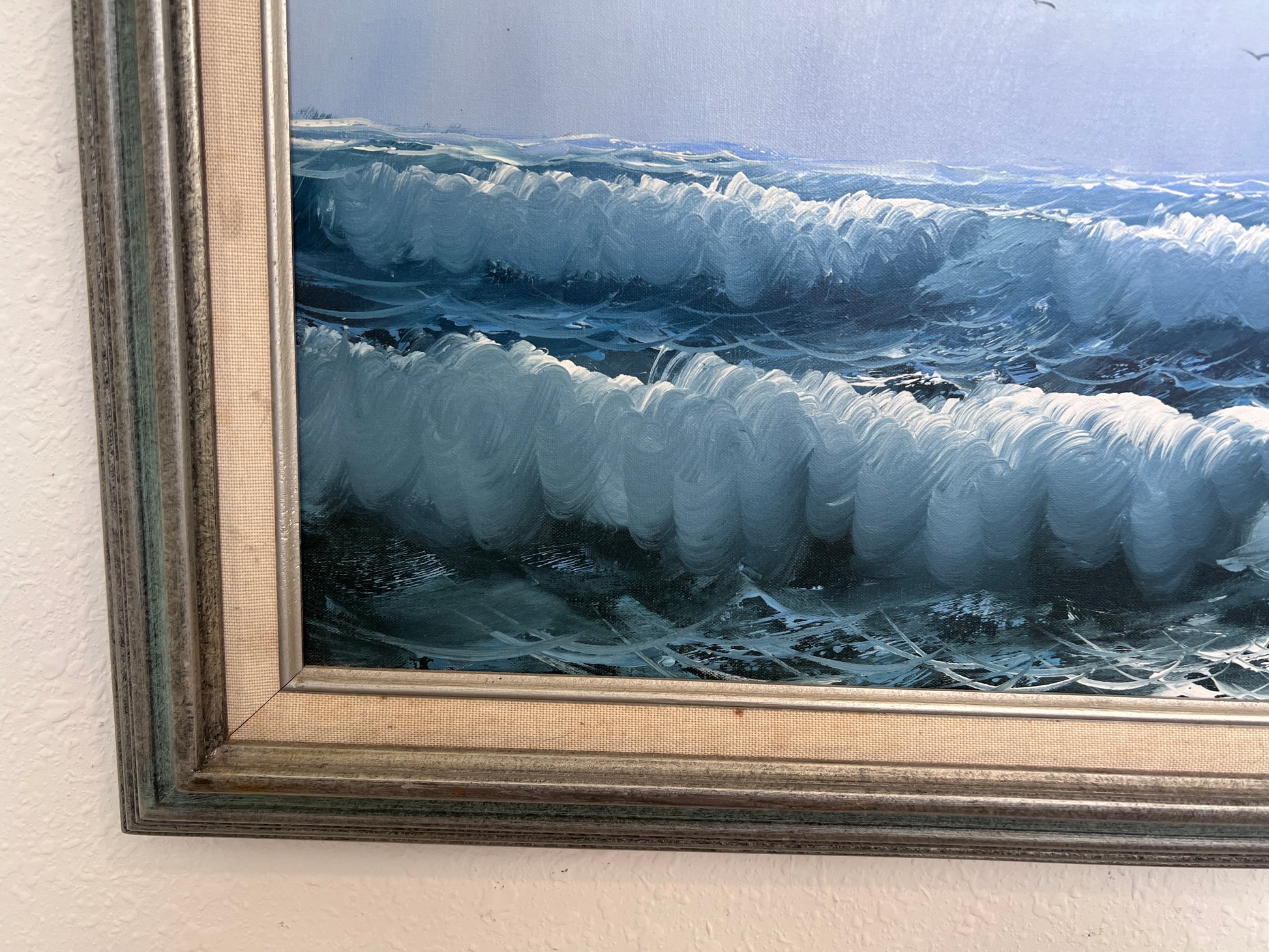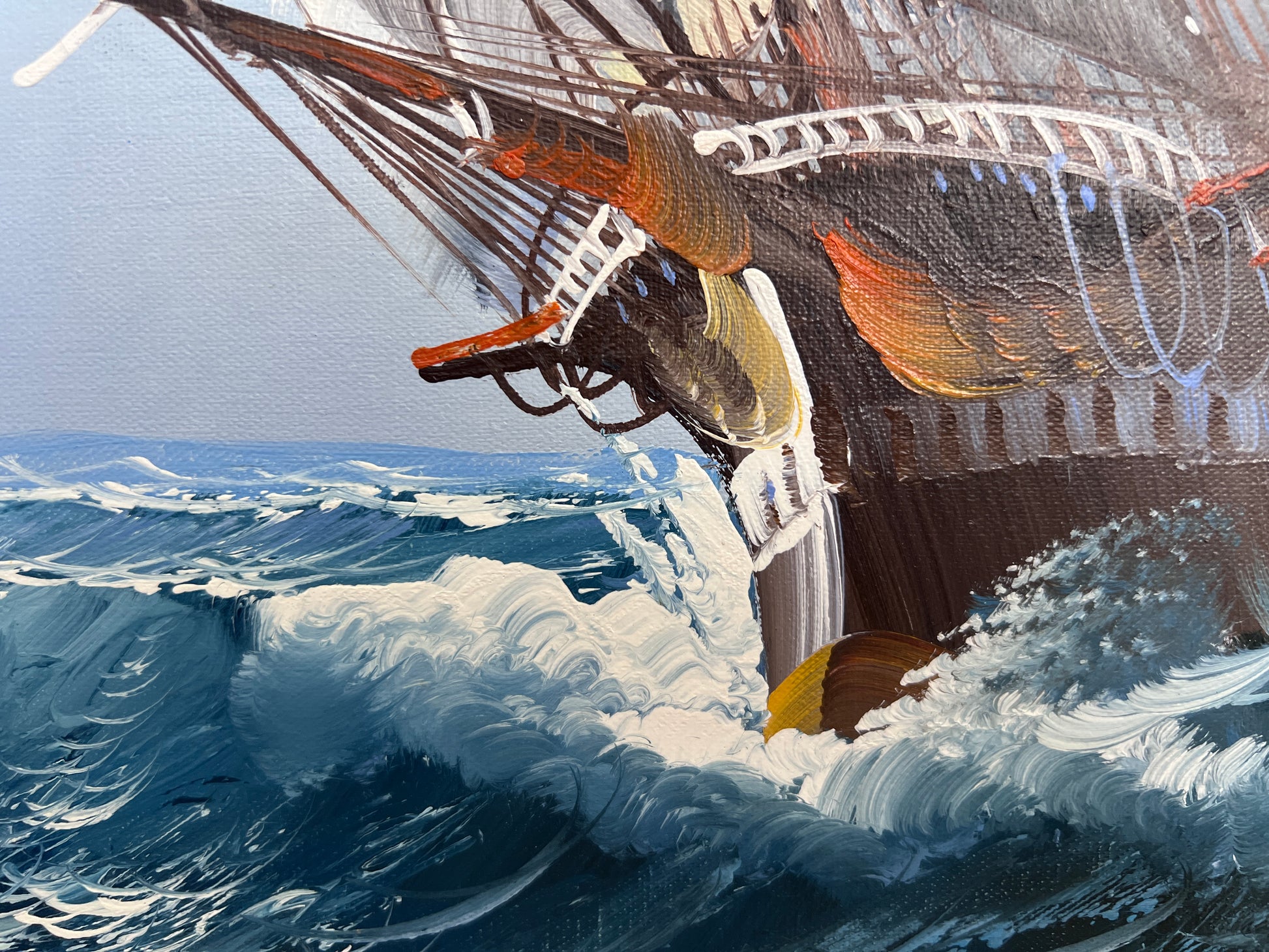 The artist’s confident brushwork and vibrant palette give this piece energy and depth. Seagulls dot the sky, and a second vessel sails in the distant horizon, adding balance and narrative to the seascape. This is a timeless representation of nautical strength and the power of nature.
