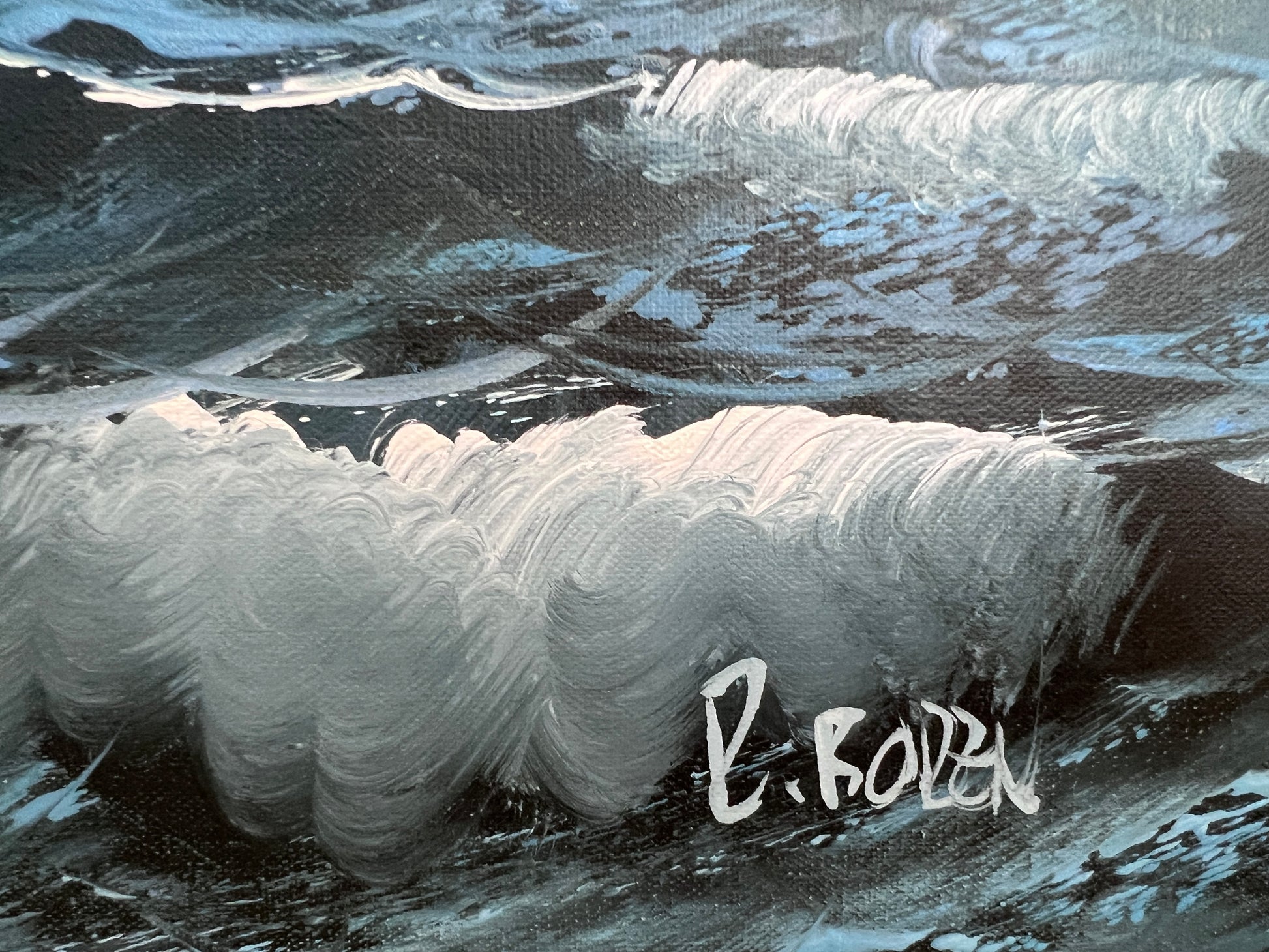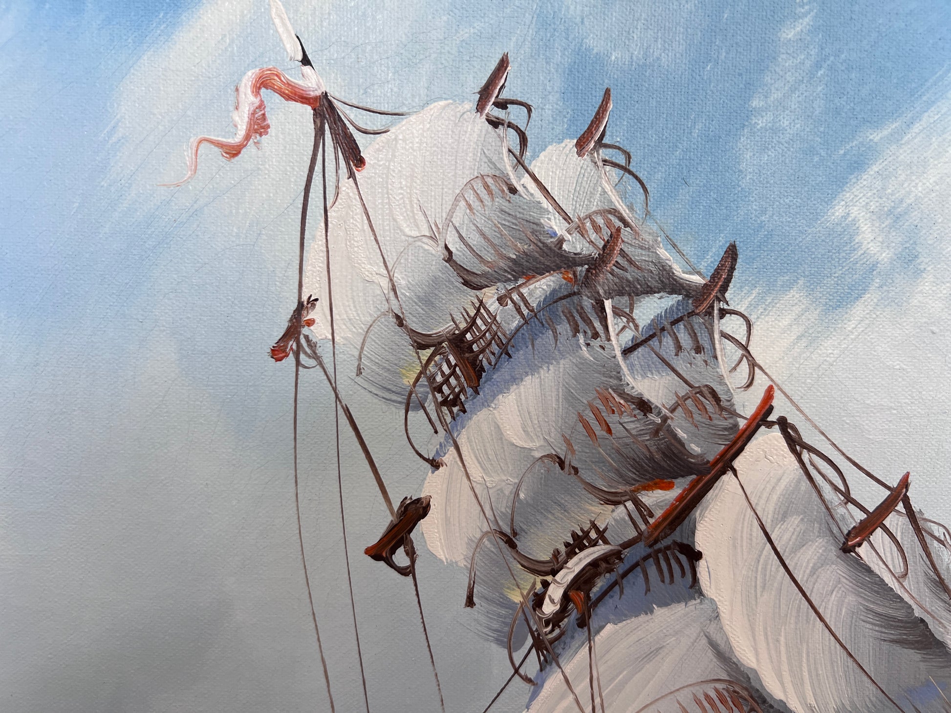 his is a stunning original oil painting on canvas by renowned seascape artist R.Boren, known for his dramatic depictions of maritime scenes. The artwork showcases a majestic tall ship navigating choppy ocean waves under a vivid blue sky scattered with soft clouds. The dynamic movement of the sea, the full white sails catching the wind, and the precise rigging details create an incredibly lifelike composition.