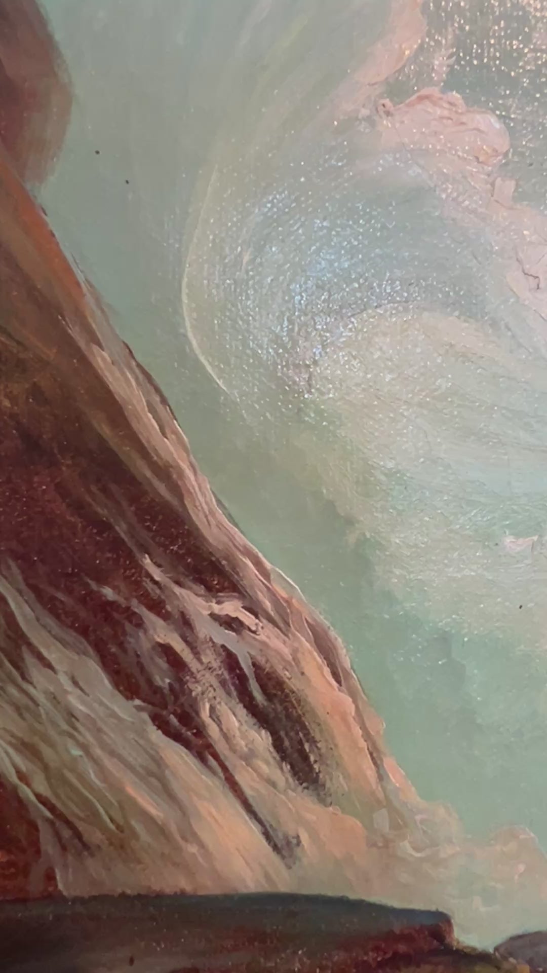 The painting’s composition masterfully balances texture and tone: the sharp geometry of the rocks contrasts with the fluid, swirling water, while subtle pastel reflections suggest the interplay of light and depth. Presented in an elegant antique-style gold frame, this artwork brings both tranquility and grandeur to any setting.
