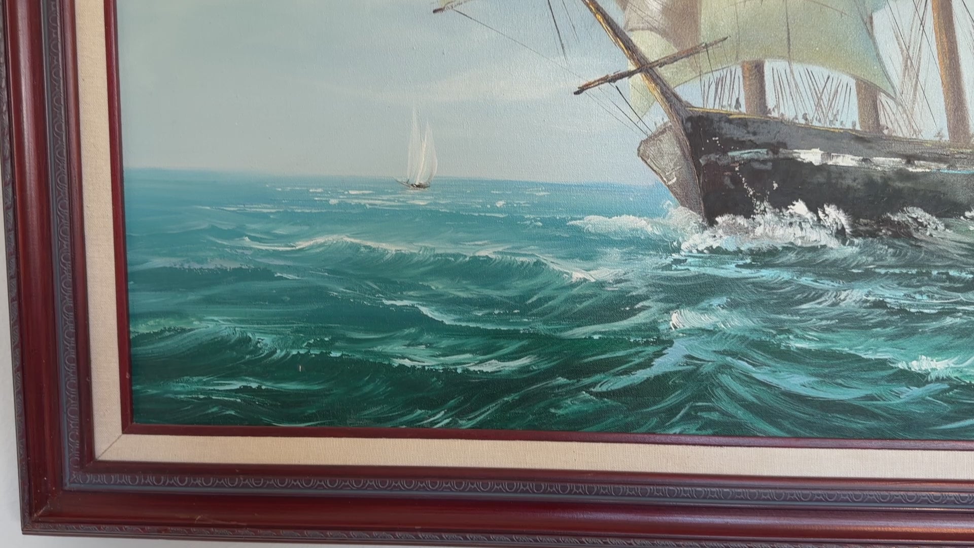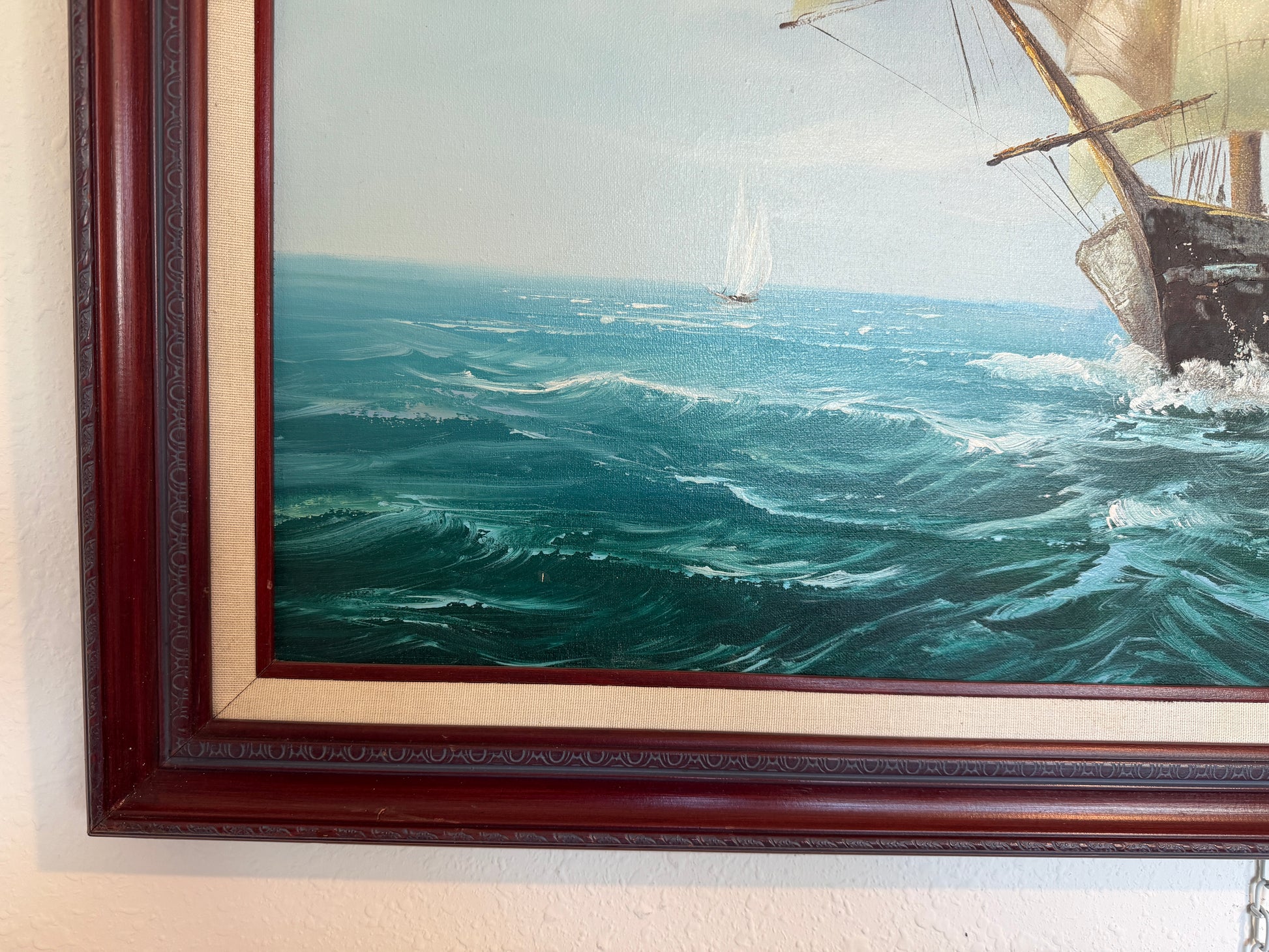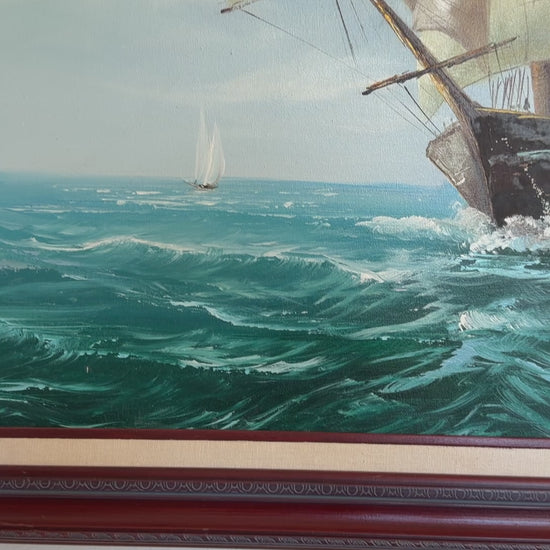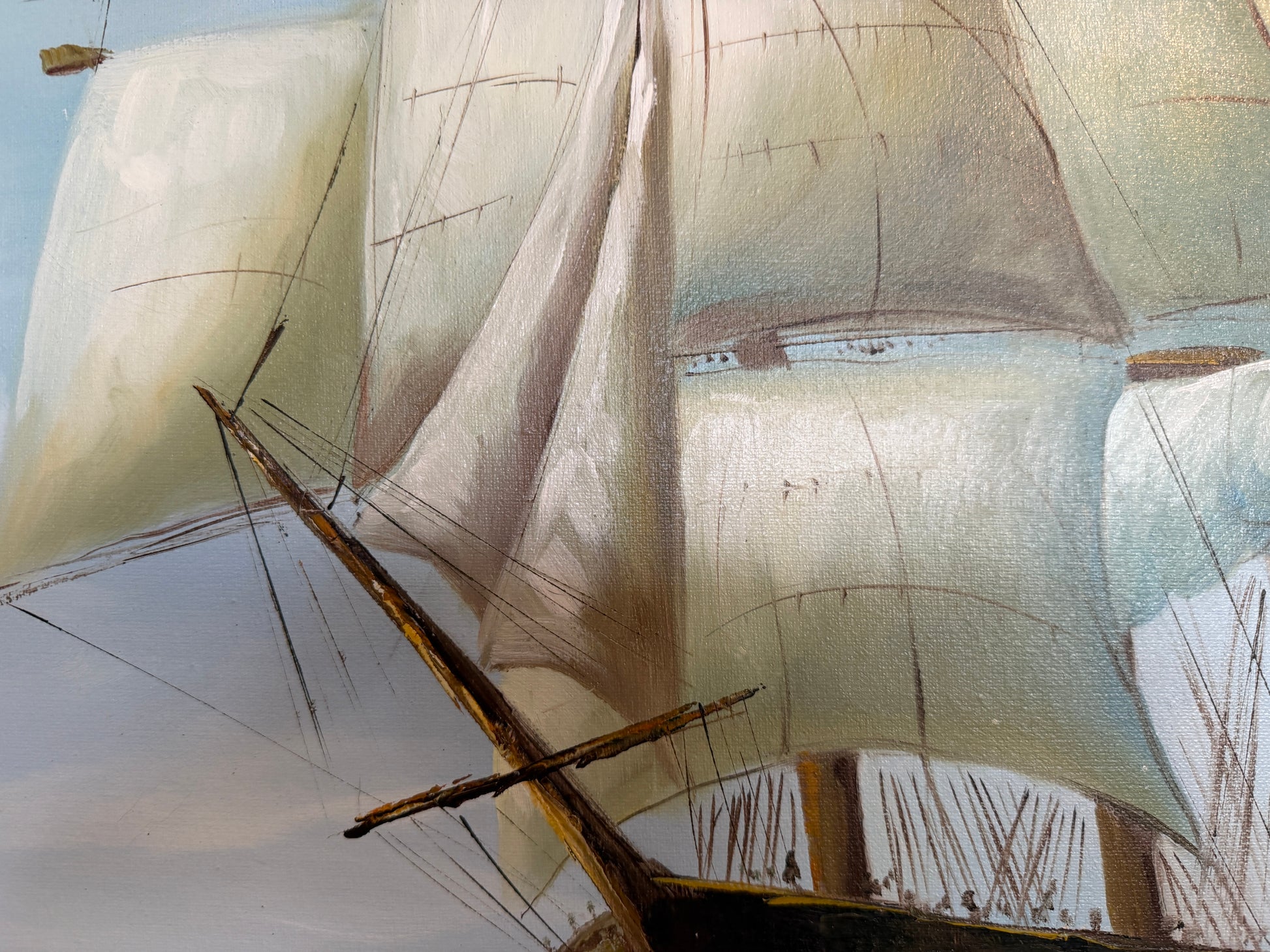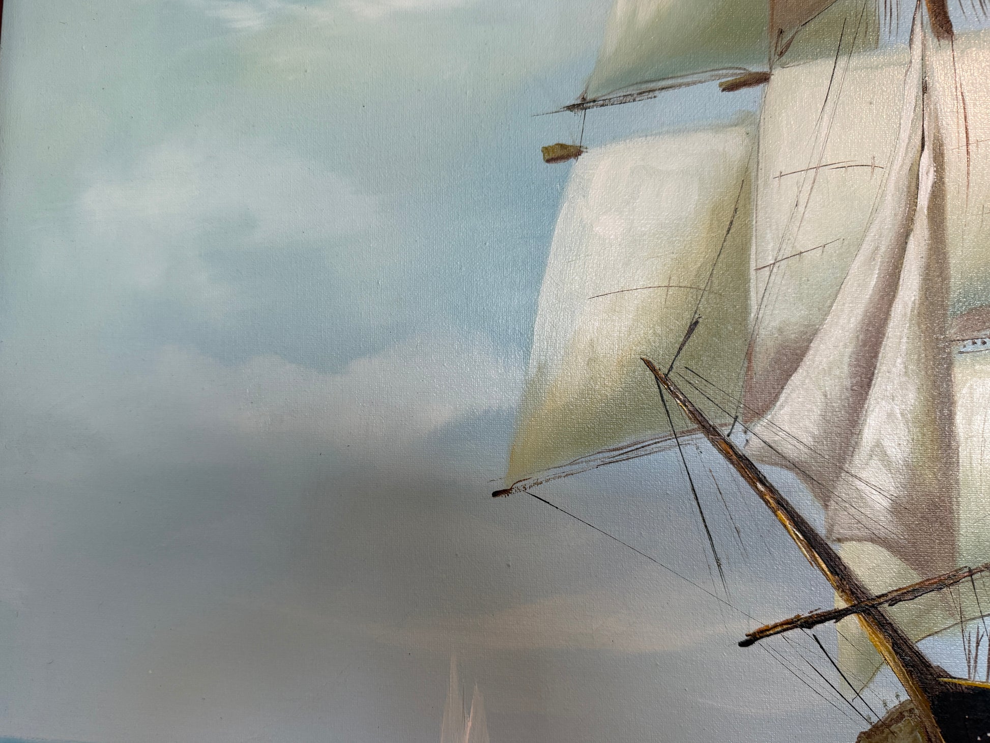 The color palette blends cool ocean blues and greens with warm sail tones, creating depth and atmosphere while guiding the eye toward the ship’s powerful forward motion. Smaller vessels in the distance enhance the sense of scale and open horizon, reinforcing the painting’s authentic maritime character. This work is well suited for coastal, nautical, or classic interiors and serves as a strong focal point in any room.