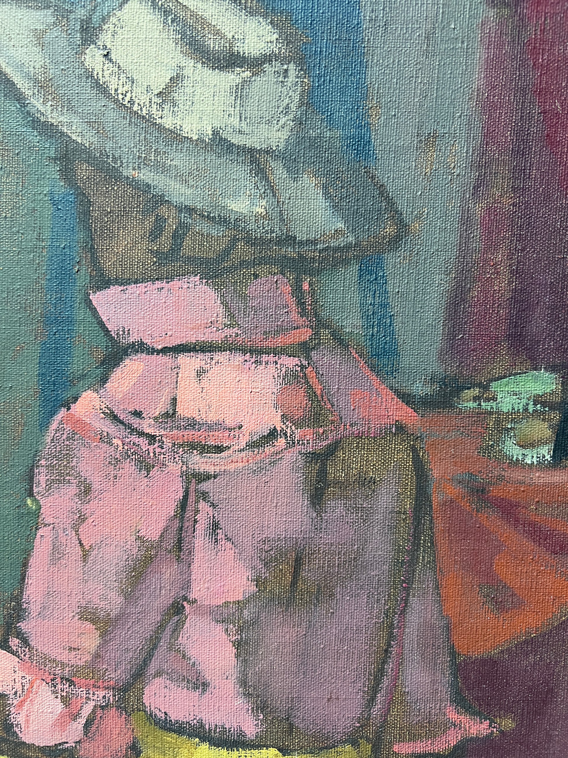 This is a one-of-a-kind vintage oil painting on canvas depicting two figures in an interior scene, rendered in a bold, expressive style. One figure, dressed in a pink shirt and yellow pants with a wide-brim hat, sits in the foreground, while another reclines above in a relaxed pose. Rich earthy tones and muted pastels create a captivating, moody composition.