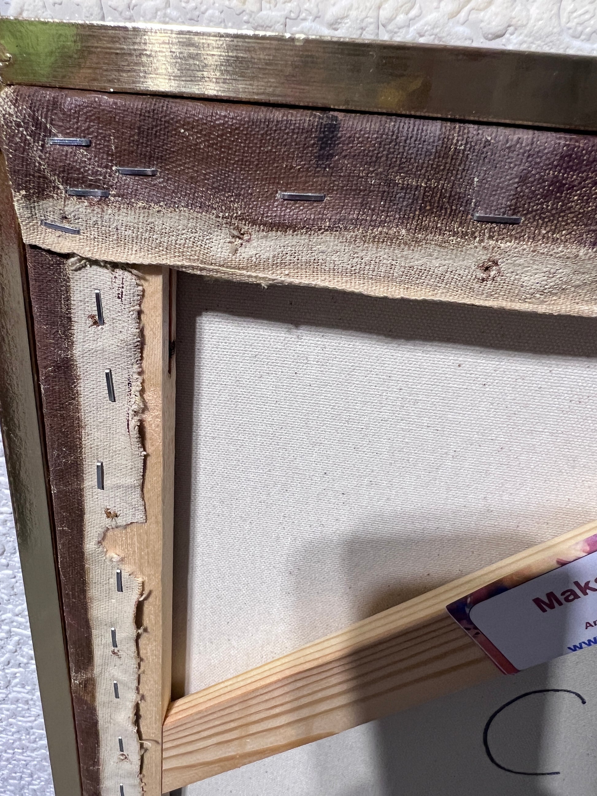The painting is presented in a modern gold frame, which complements the rustic and vintage charm of the piece.