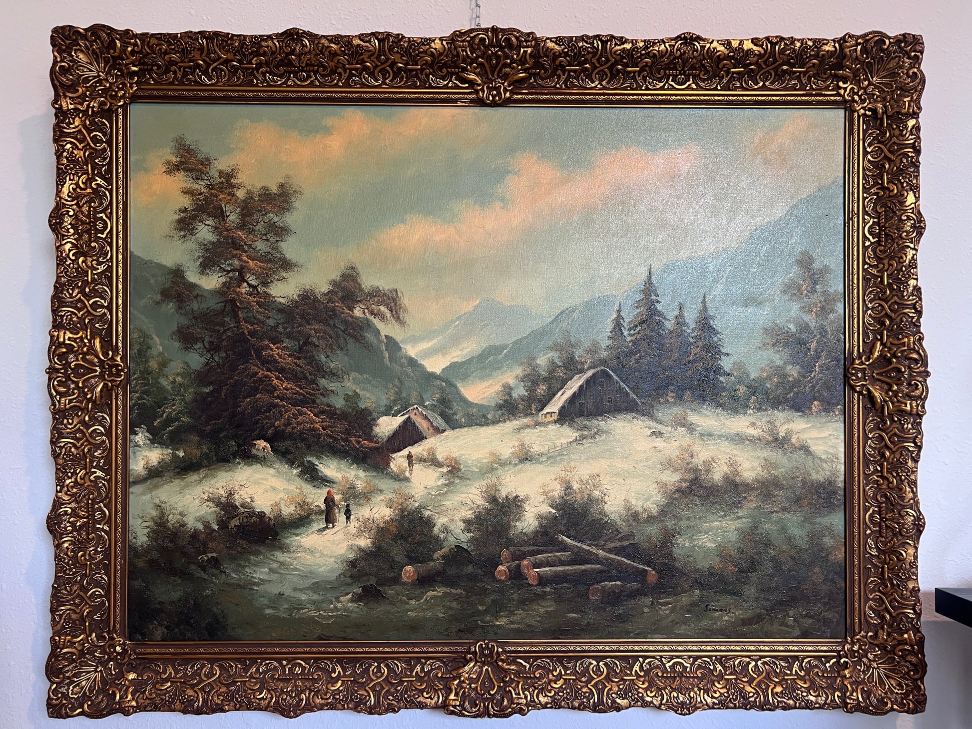 The ornate gold leaf frame complements the painting’s classical style, enhancing its timeless charm. This piece beautifully captures the stillness and beauty of rural life in winter, making it a wonderful addition to any traditional or vintage-inspired décor.