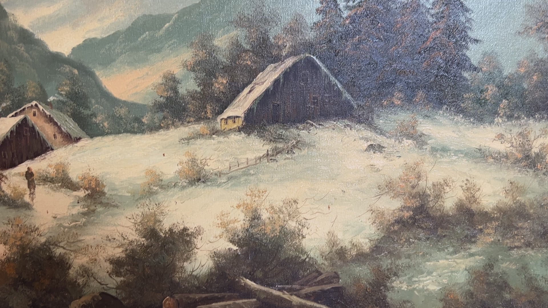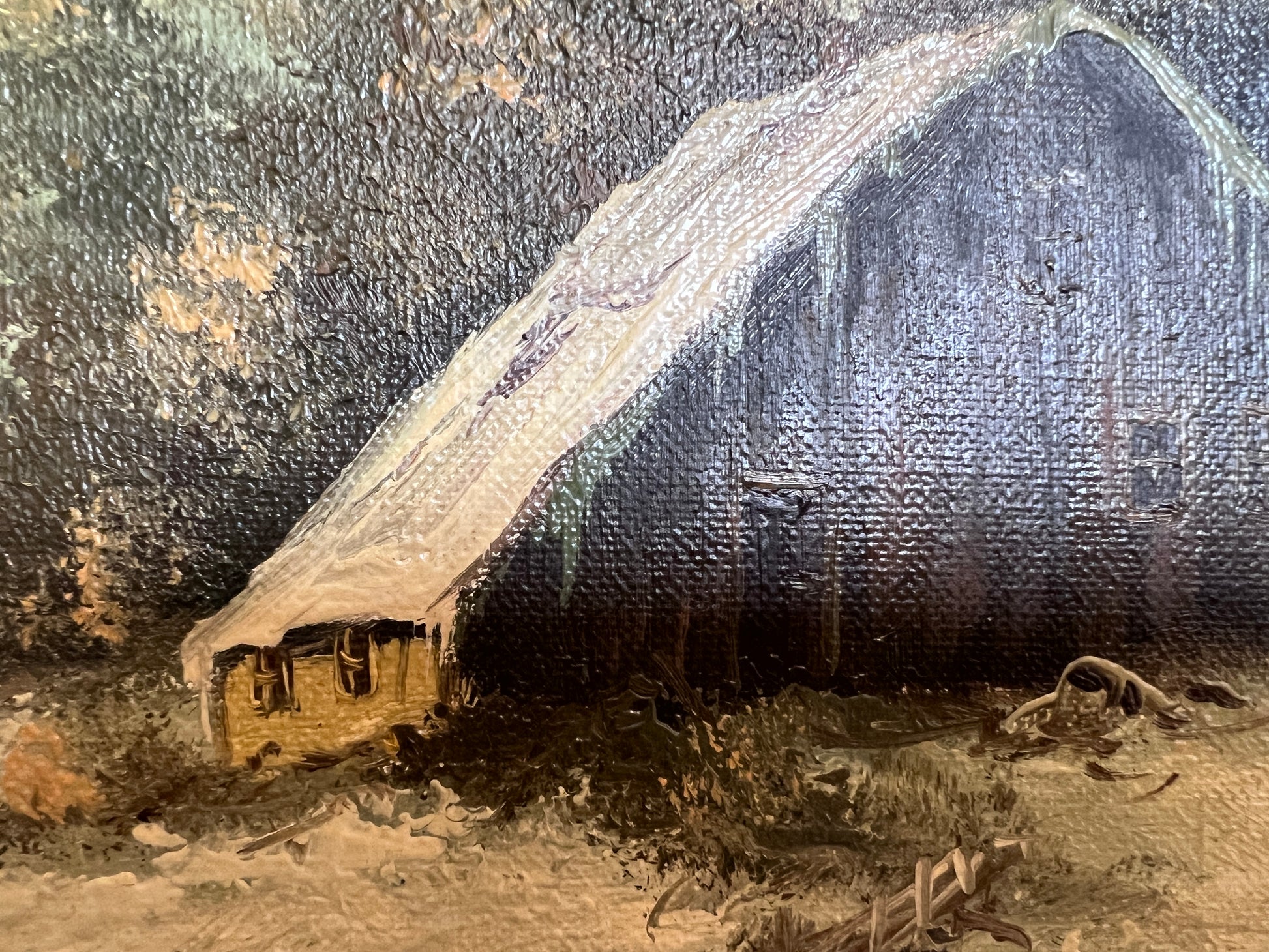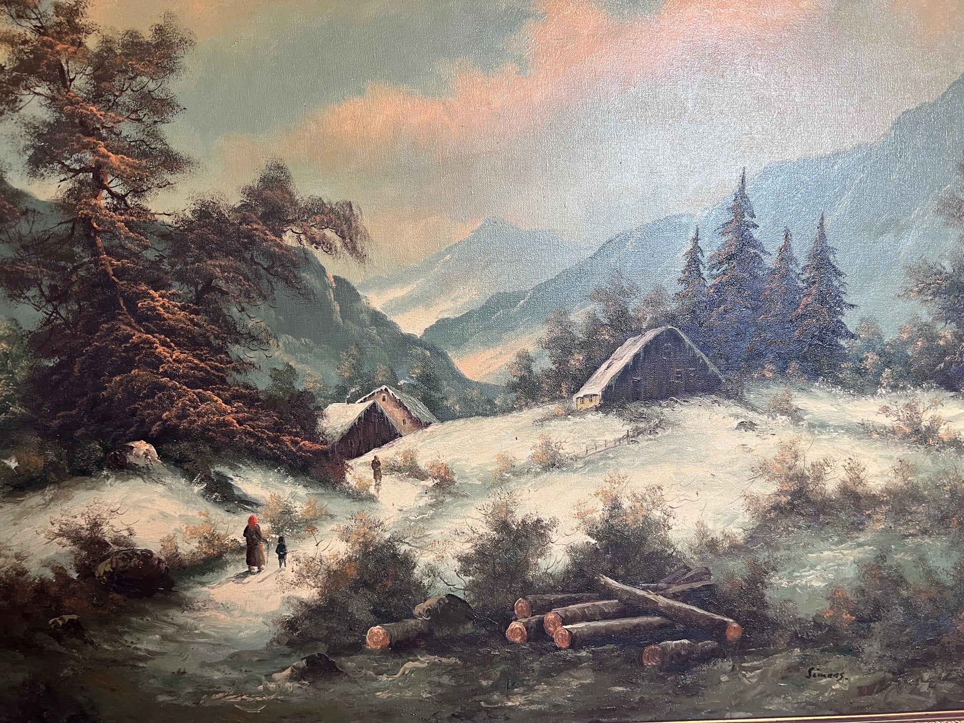 Up for sale is a vintage original Dutch oil painting on canvas depicting a serene winter landscape in a quiet mountain village. Two figures walk along a narrow, snow-covered path, bringing life and movement to the peaceful setting. Snow-dusted cottages nestle among tall evergreens and bare trees, while the sky glows in soft shades of blue and peach, suggesting an early morning or late afternoon scene.