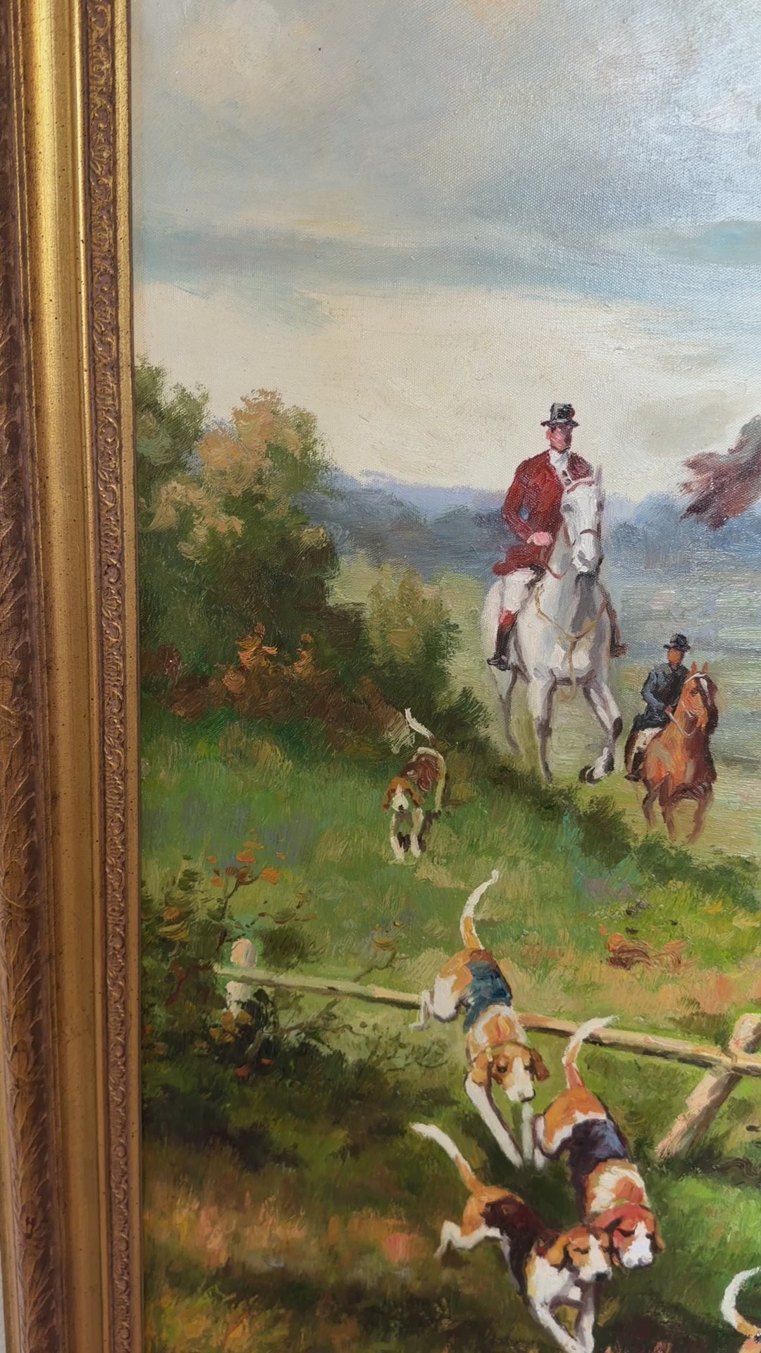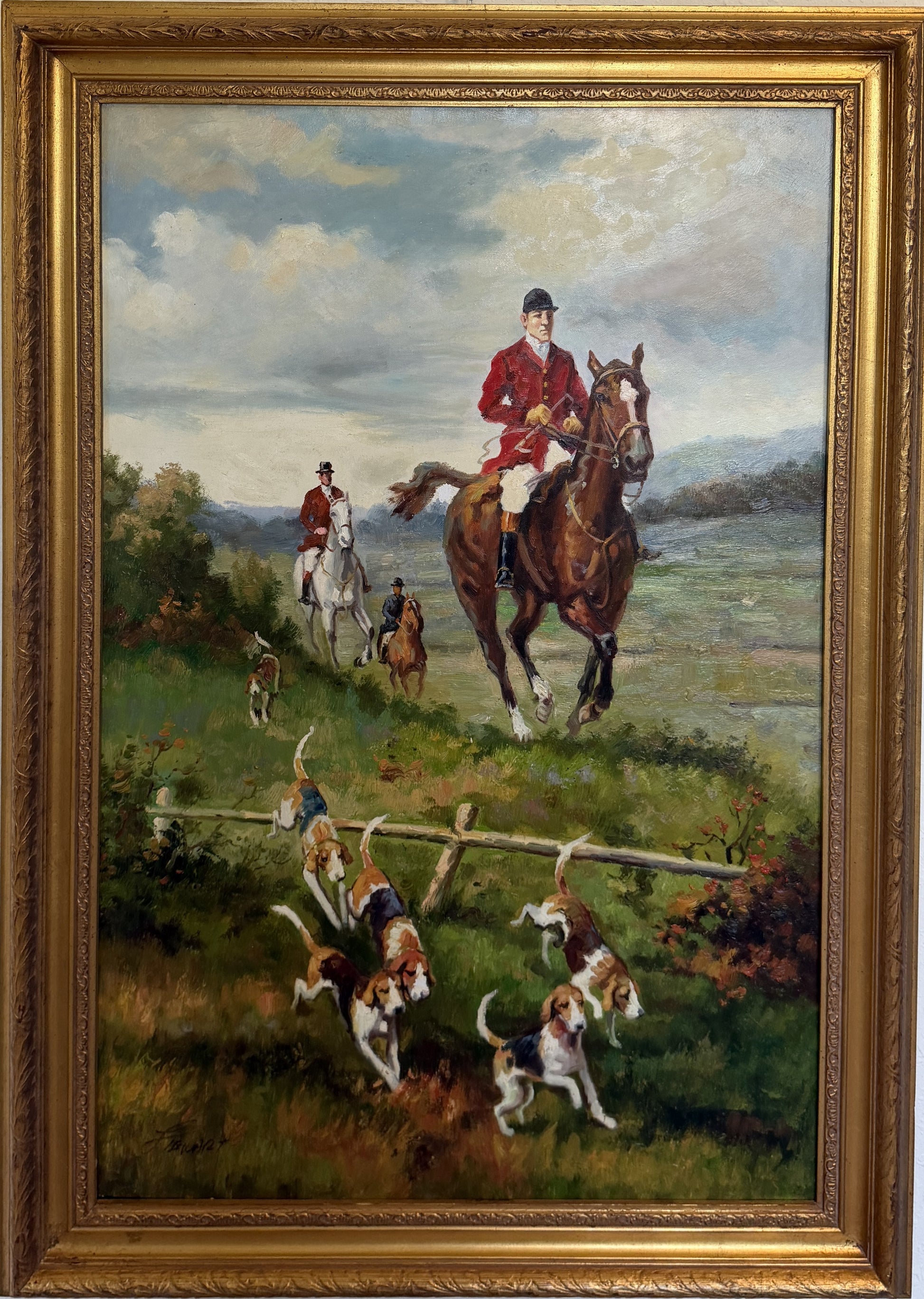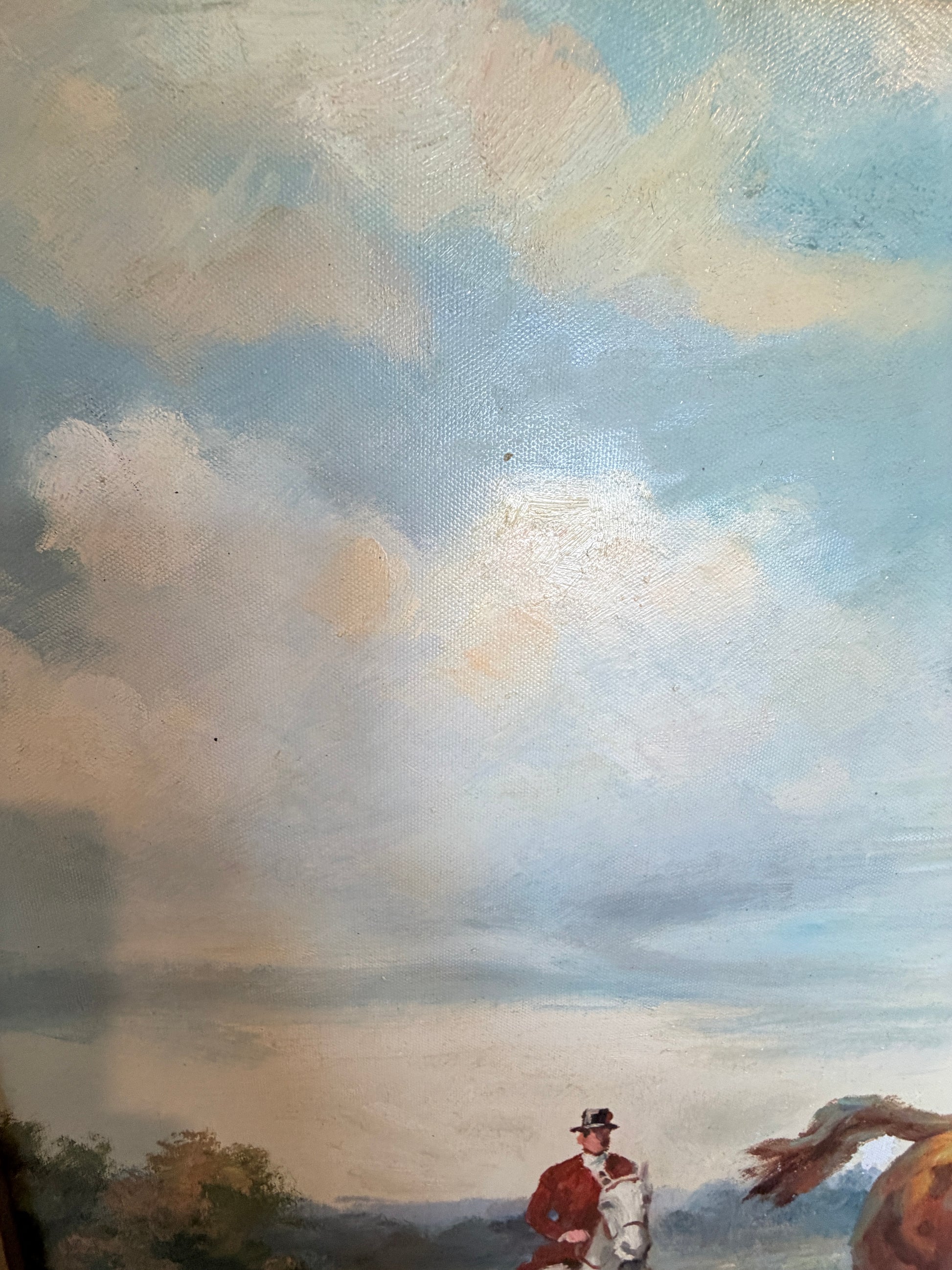 English Fox Hunting Scene Oil Painting on Canvas, Horses & Hounds, Signed
