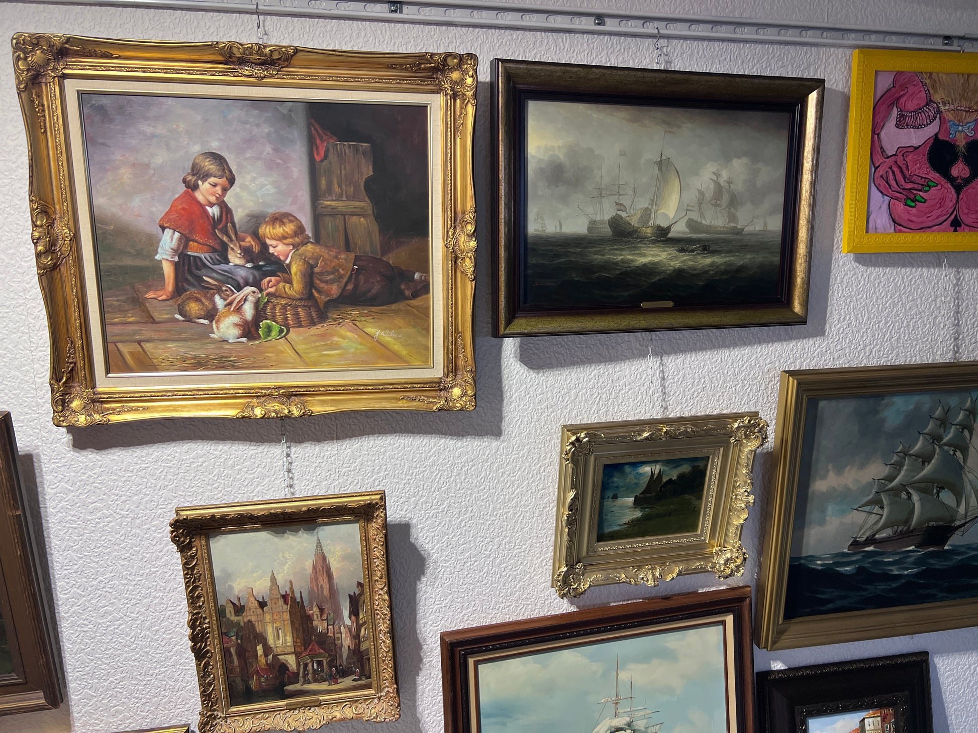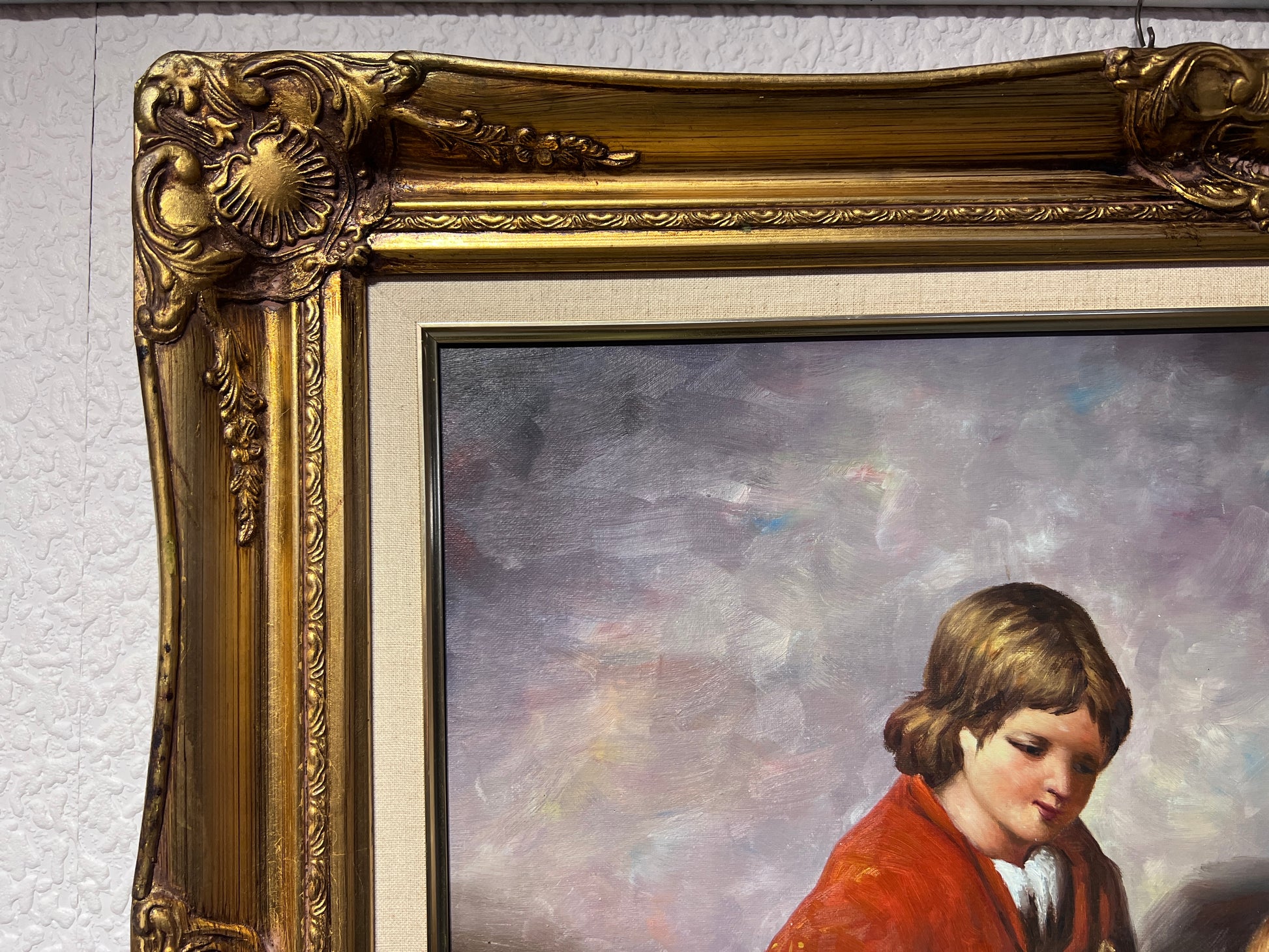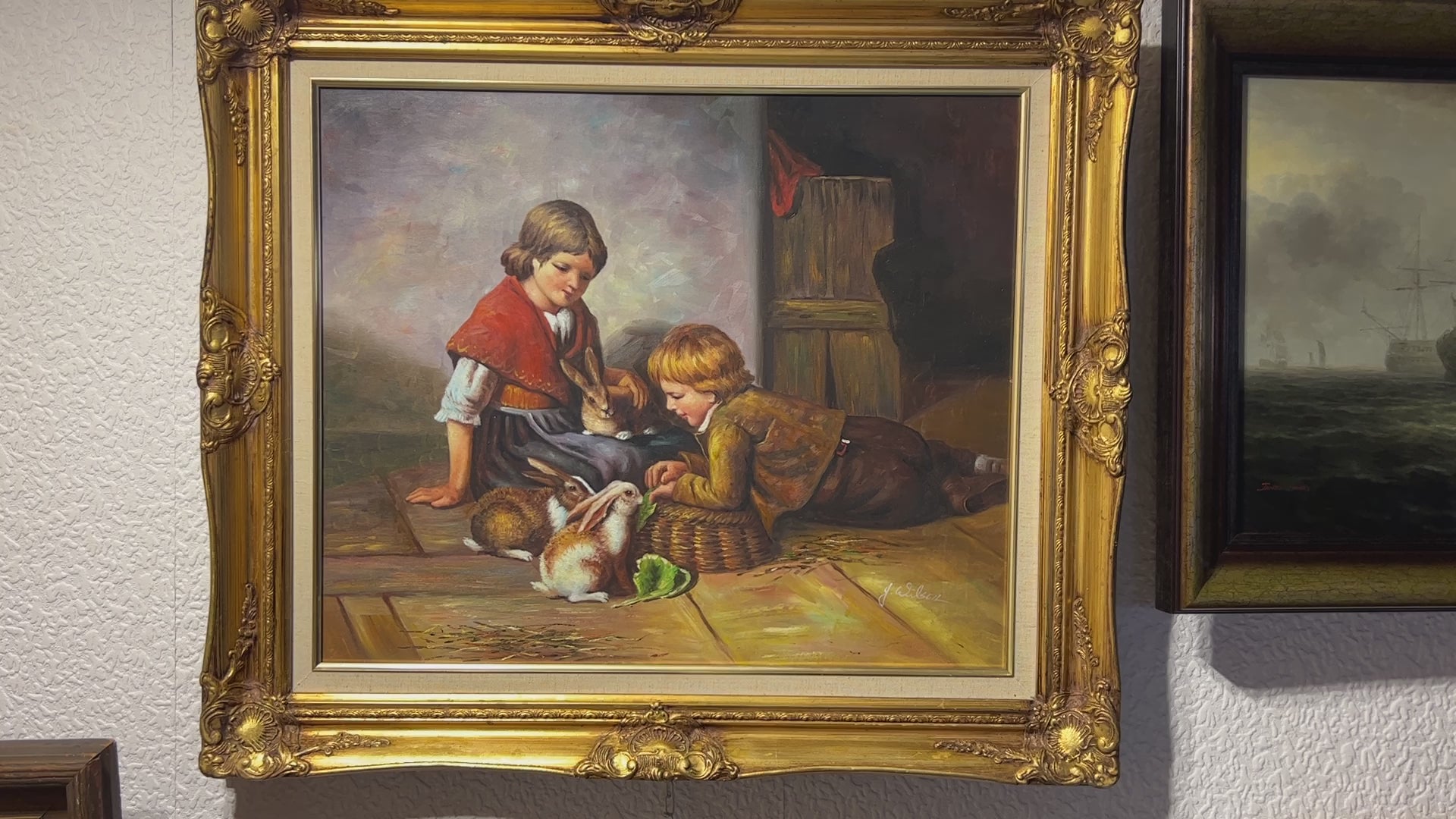 G.Wilson Vintage Oil painting on canvas, children playing with rabbit, framed