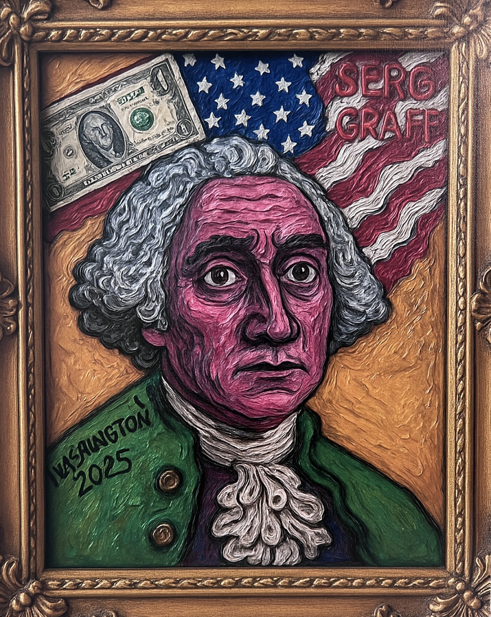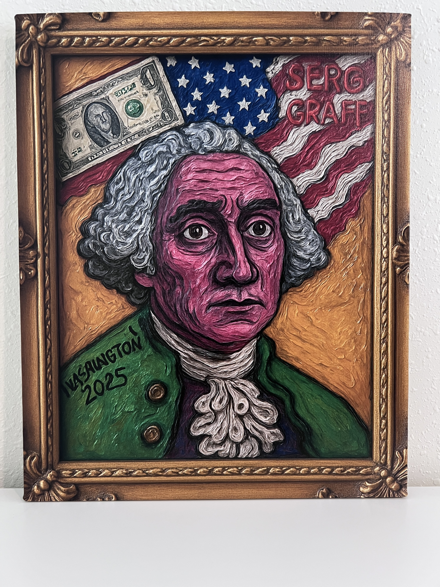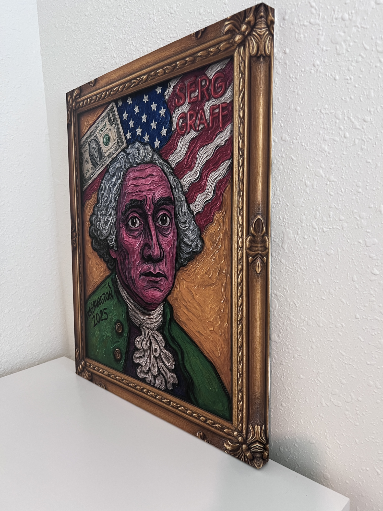 A bold, surrealist reimagining of George Washington by artist Serg Graff, this limited-edition print delivers a mix of political commentary and expressive pop art. The iconic portrait is twisted into an eccentric vision—Washington appears with a vivid pink hue, dollar bill, American flag, and flaming golden backdrop.