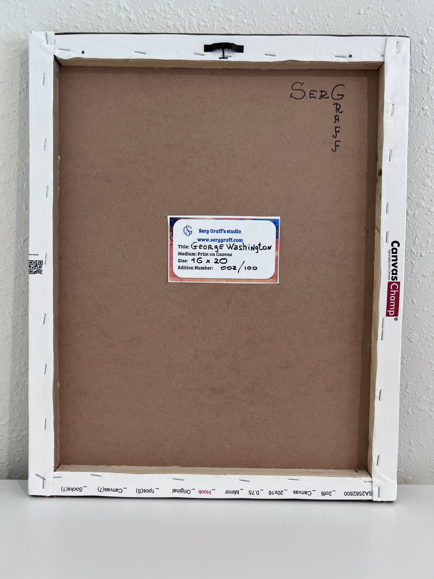 Measuring 20" x 16" and printed on high-quality canvas, this gallery-wrapped artwork ships unframed and comes with a signed Certificate of Authenticity (COA) marked Edition #002/100. Part of Graff’s modern Americana portrait series, this piece challenges the boundaries between tradition and irony.
