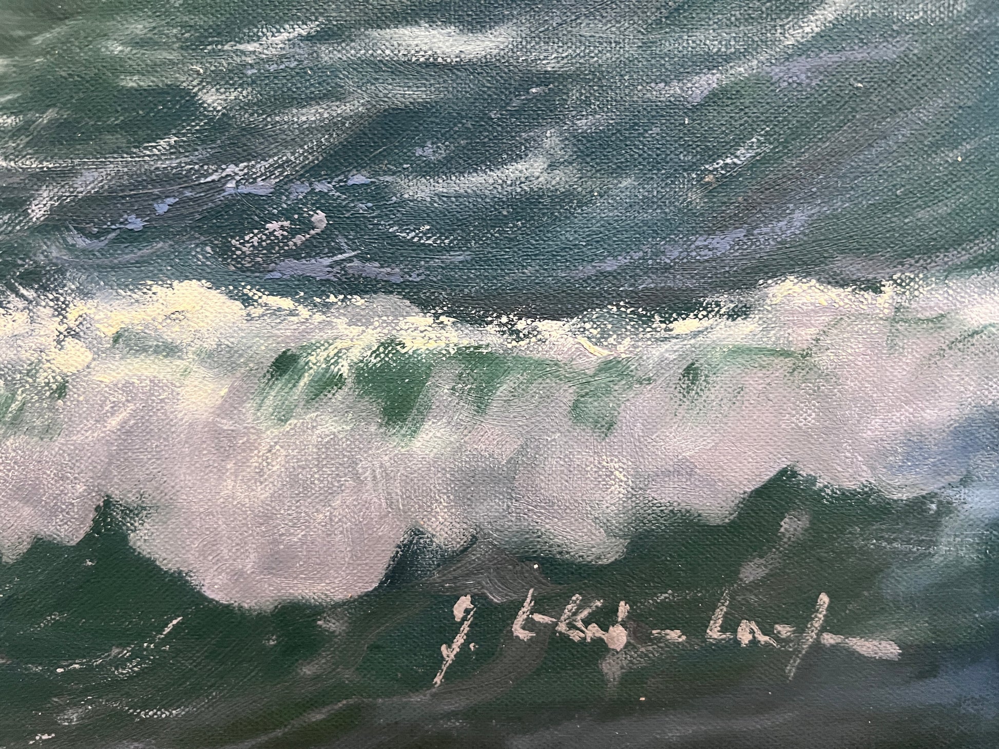 Stunning large vintage seascape oil painting by Gerhard Lukas Larsen (German, 1911–1965), celebrated for his dynamic maritime works and atmospheric coastal scenes. This impressive composition captures powerful waves crashing against rugged cliffs as the sun breaks through a veil of clouds, casting shimmering reflections across the ocean. Larsen’s signature brushwork brings the movement of the water to life, creating depth, drama, and a sense of natural grandeur.