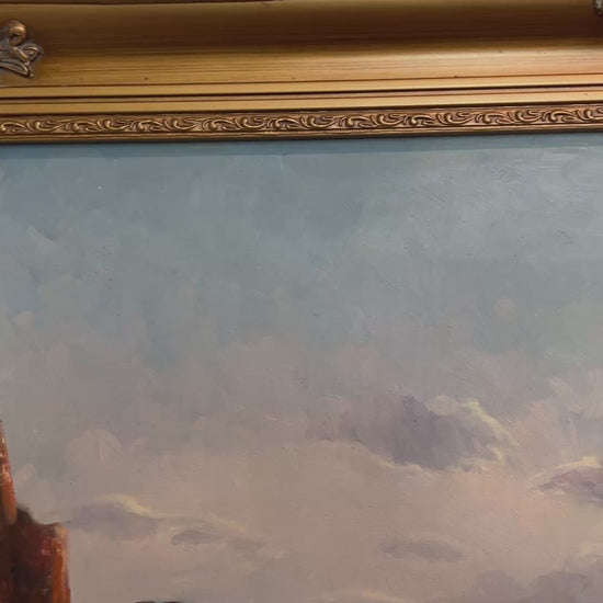 The palette of deep greens, soft blues, and warm light enhances the painting’s emotional impact, making it a perfect highlight for coastal homes, nautical-themed interiors, or collectors of mid-century European maritime art. The ornate gold frame complements the artwork beautifully and is ready to display.