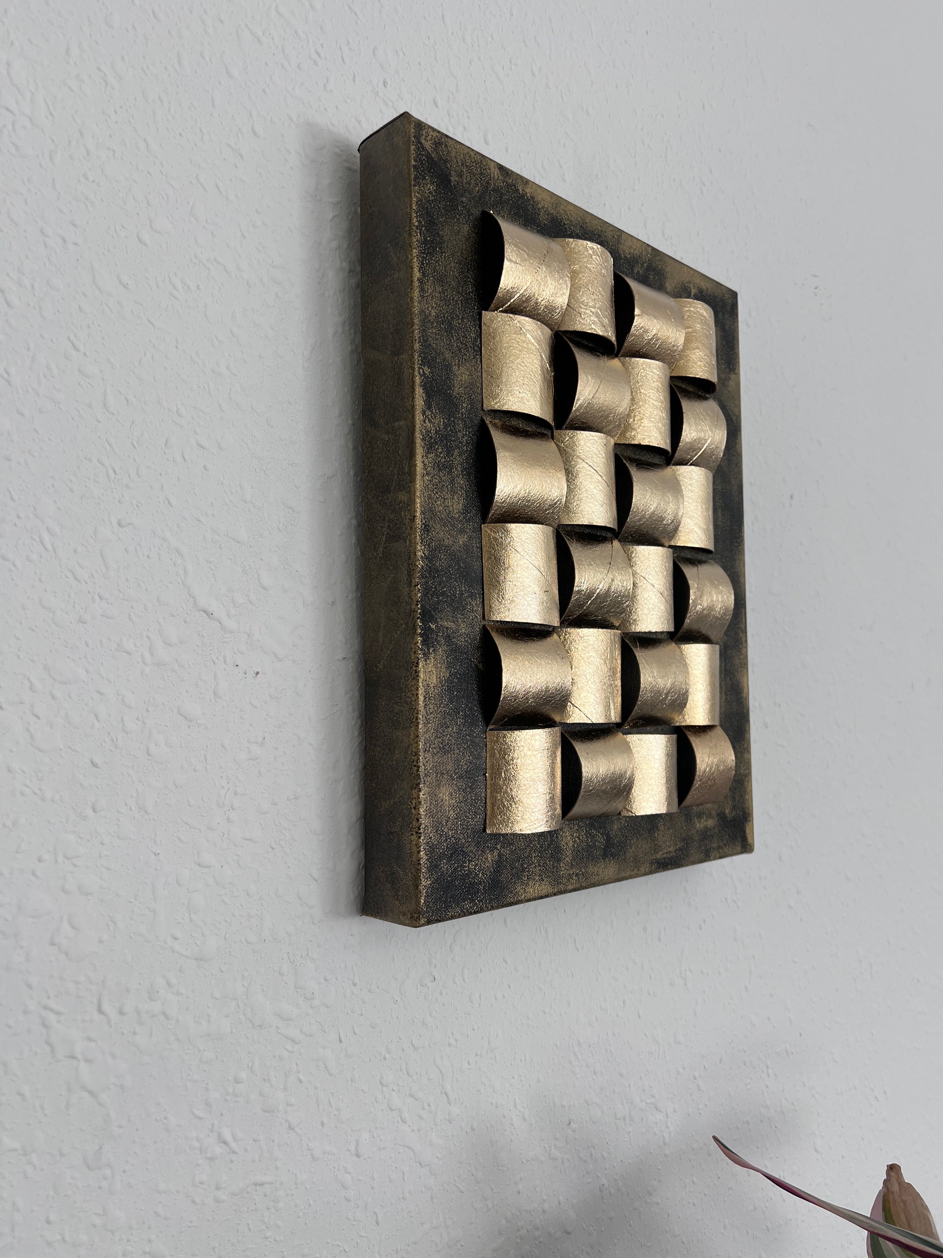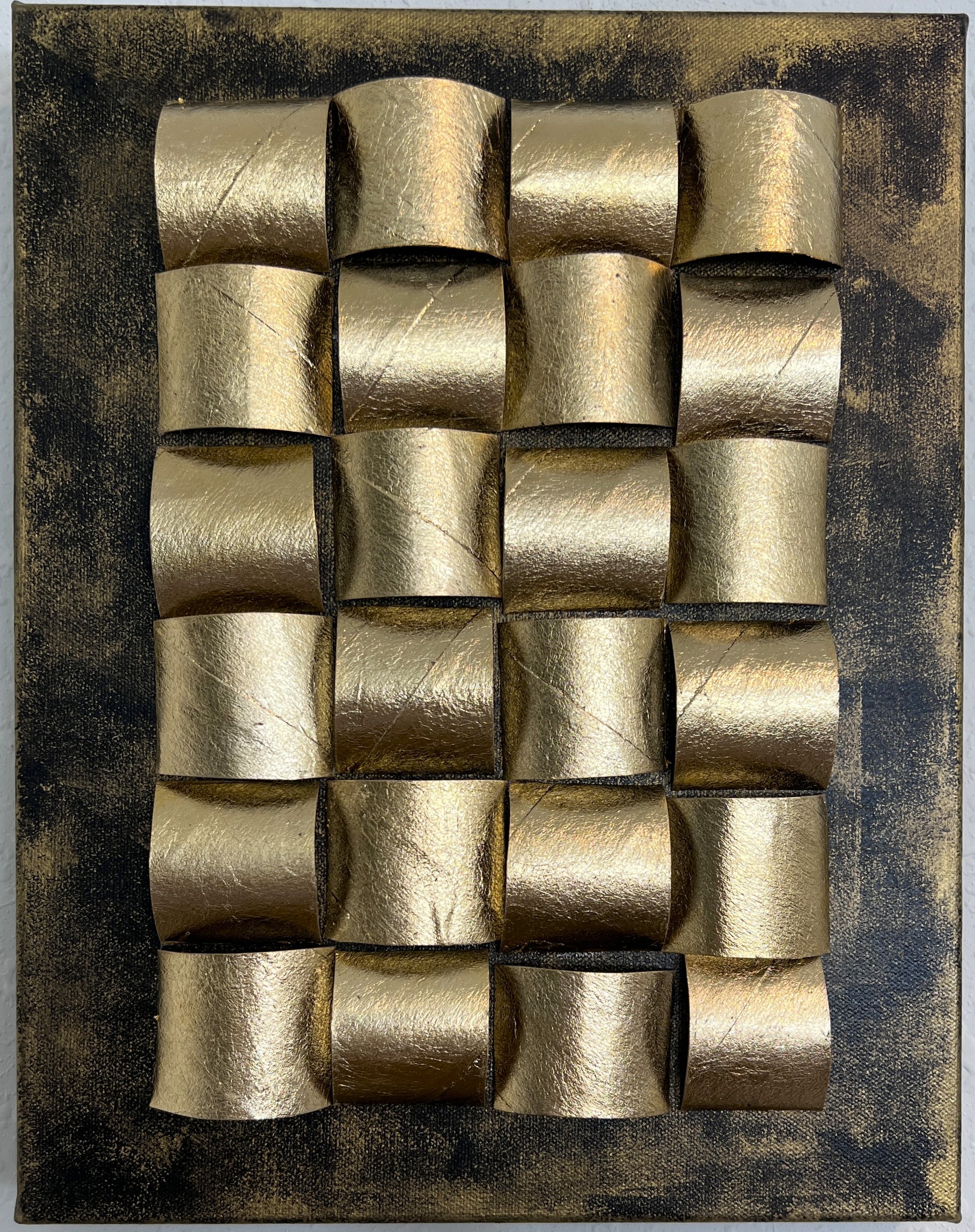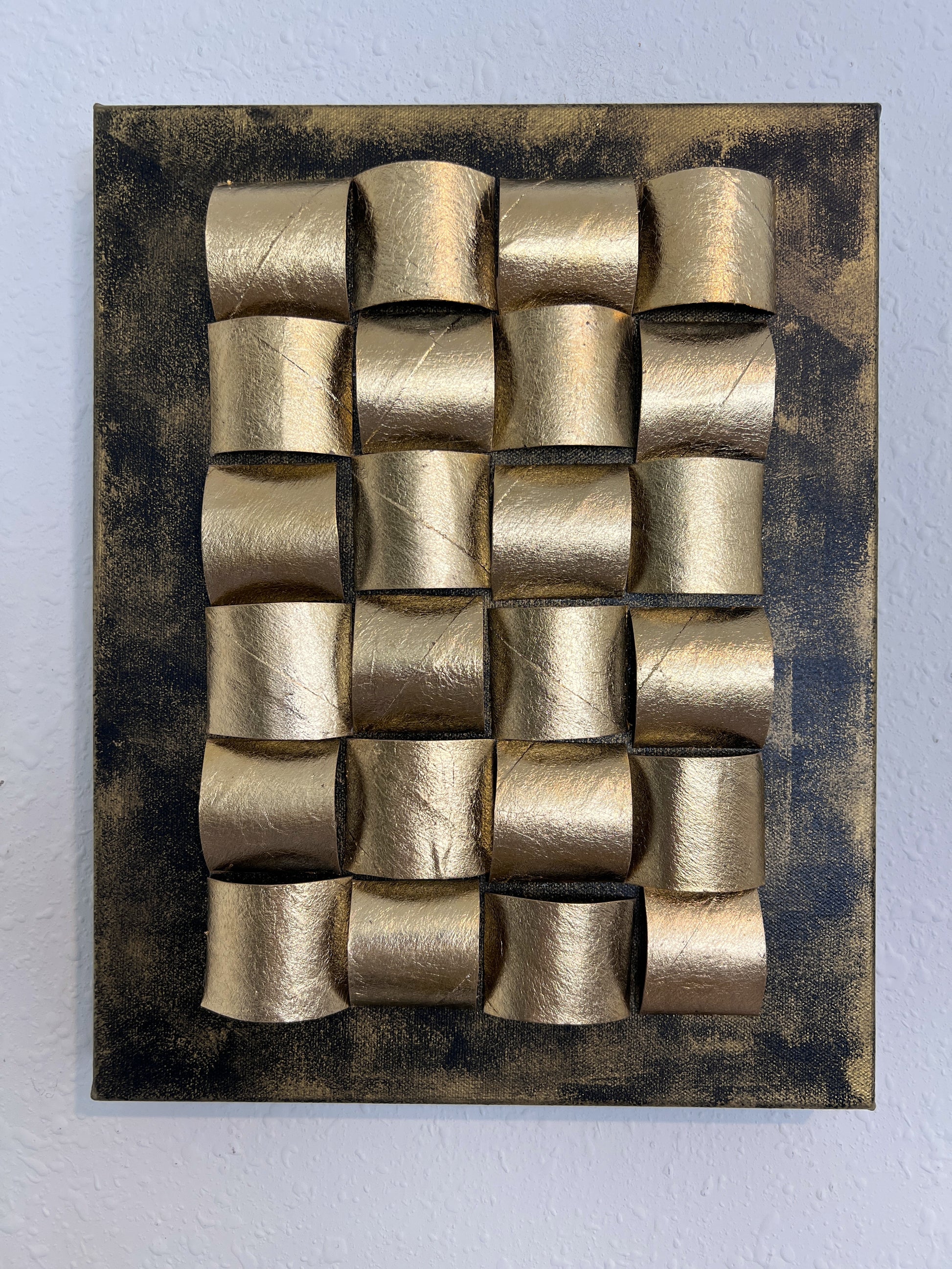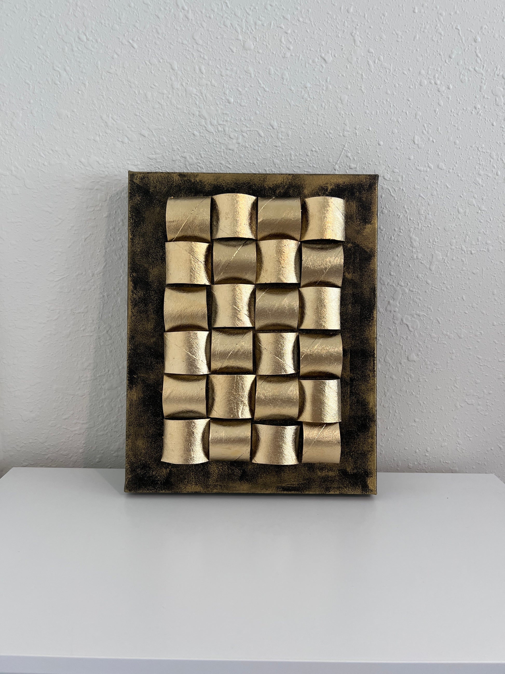 This striking mixed media wall artwork titled "Golden Folds" is an original creation by contemporary artist Alena Kalen. Crafted on canvas, the piece features an intricate sculptural composition of golden arcs, arranged in a rhythmic grid-like formation. The folded elements catch light at various angles, creating a sense of movement, balance, and tactile depth.