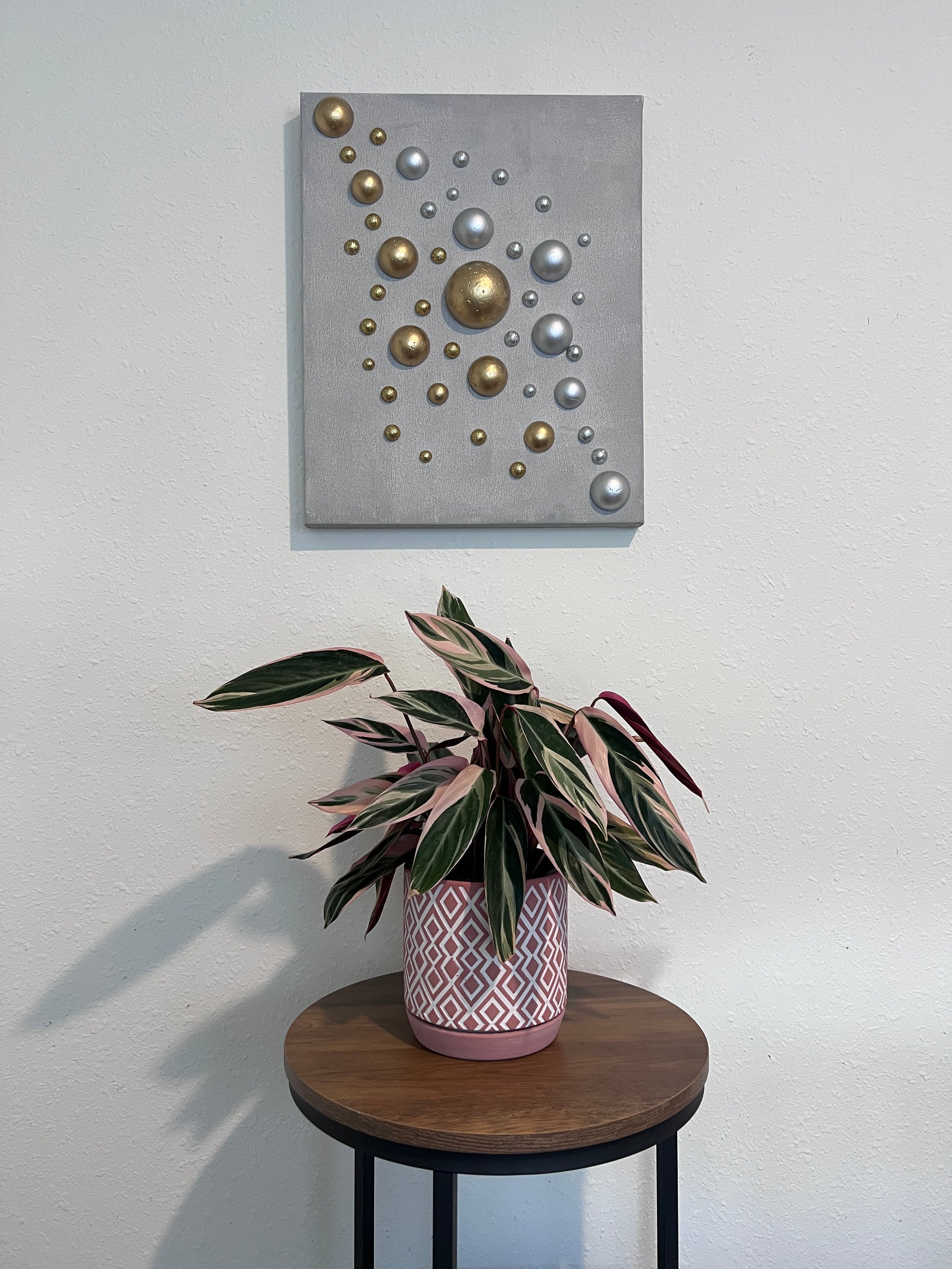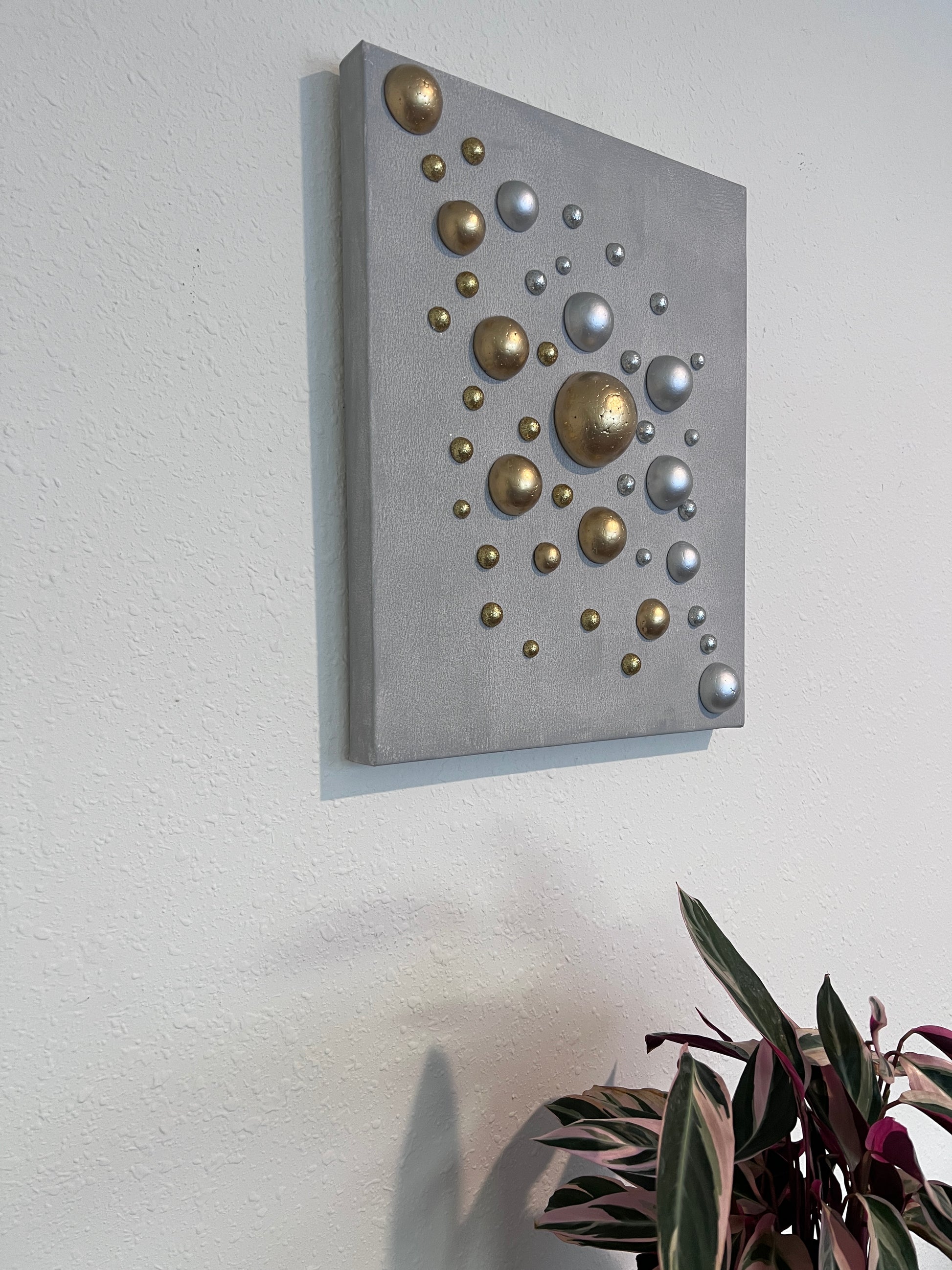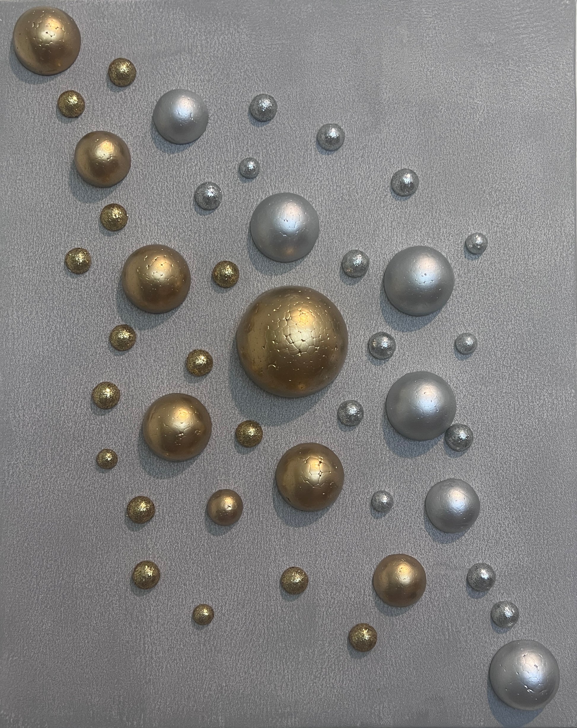 Arranged in a dynamic yet harmonious composition, the orbs vary in size and tone—from matte silver to radiant gold—evoking movement, depth, and cosmic stillness. The interplay of light and shadow across each rounded form enhances their dimensional presence, while the neutral backdrop offers a minimalist elegance. The result is a visually striking yet serene composition that reflects balance and the silent rhythm of space.