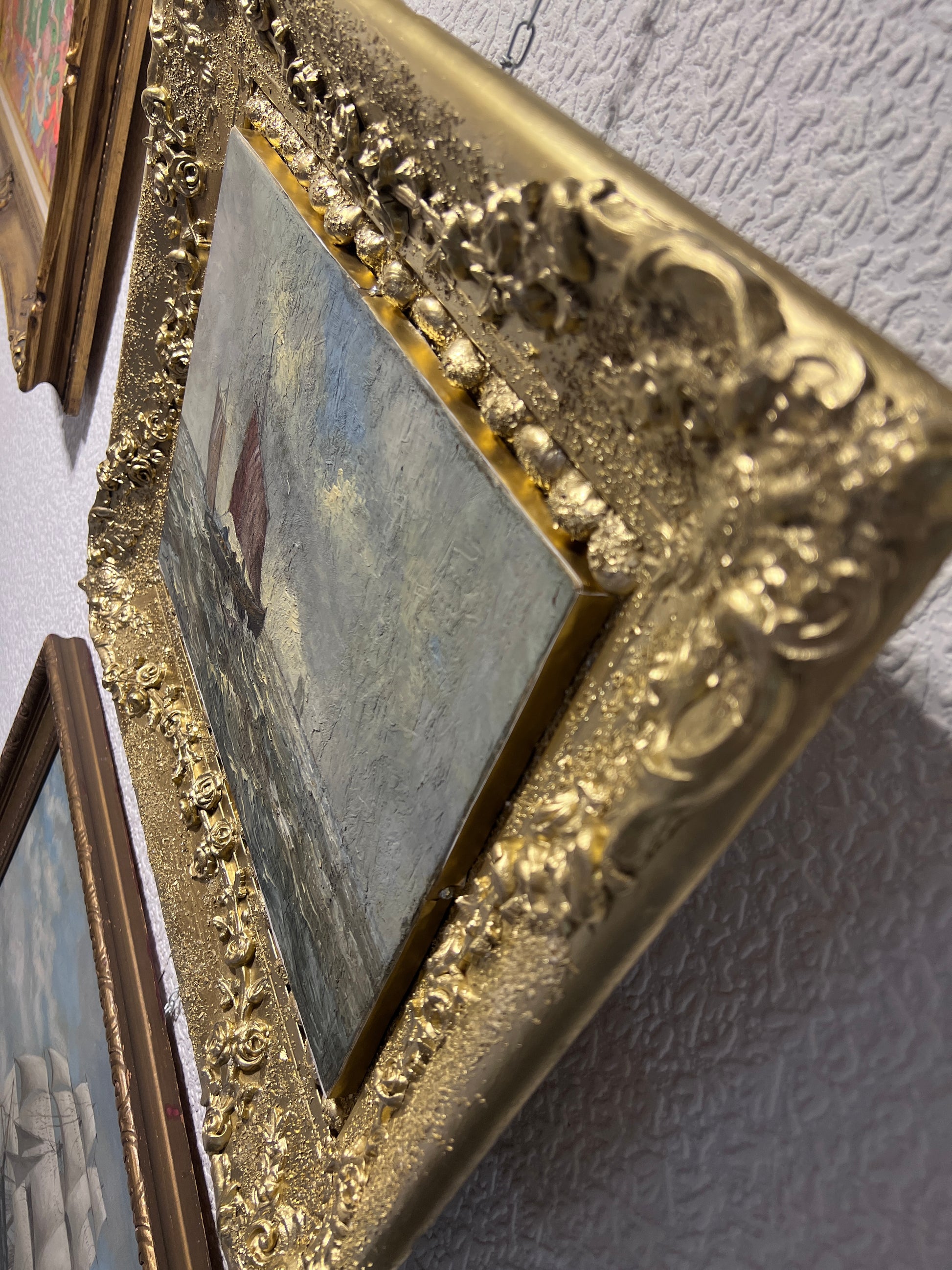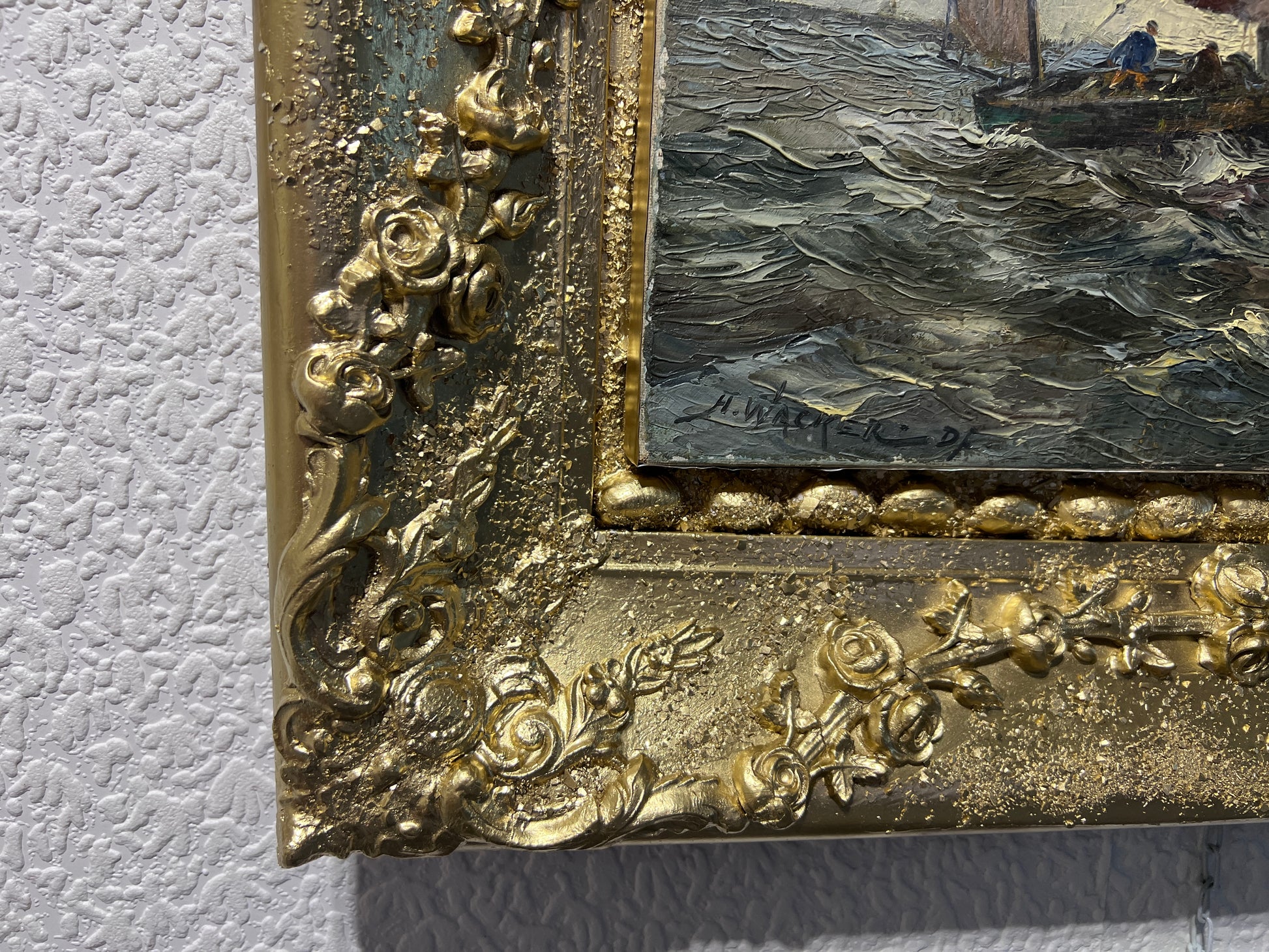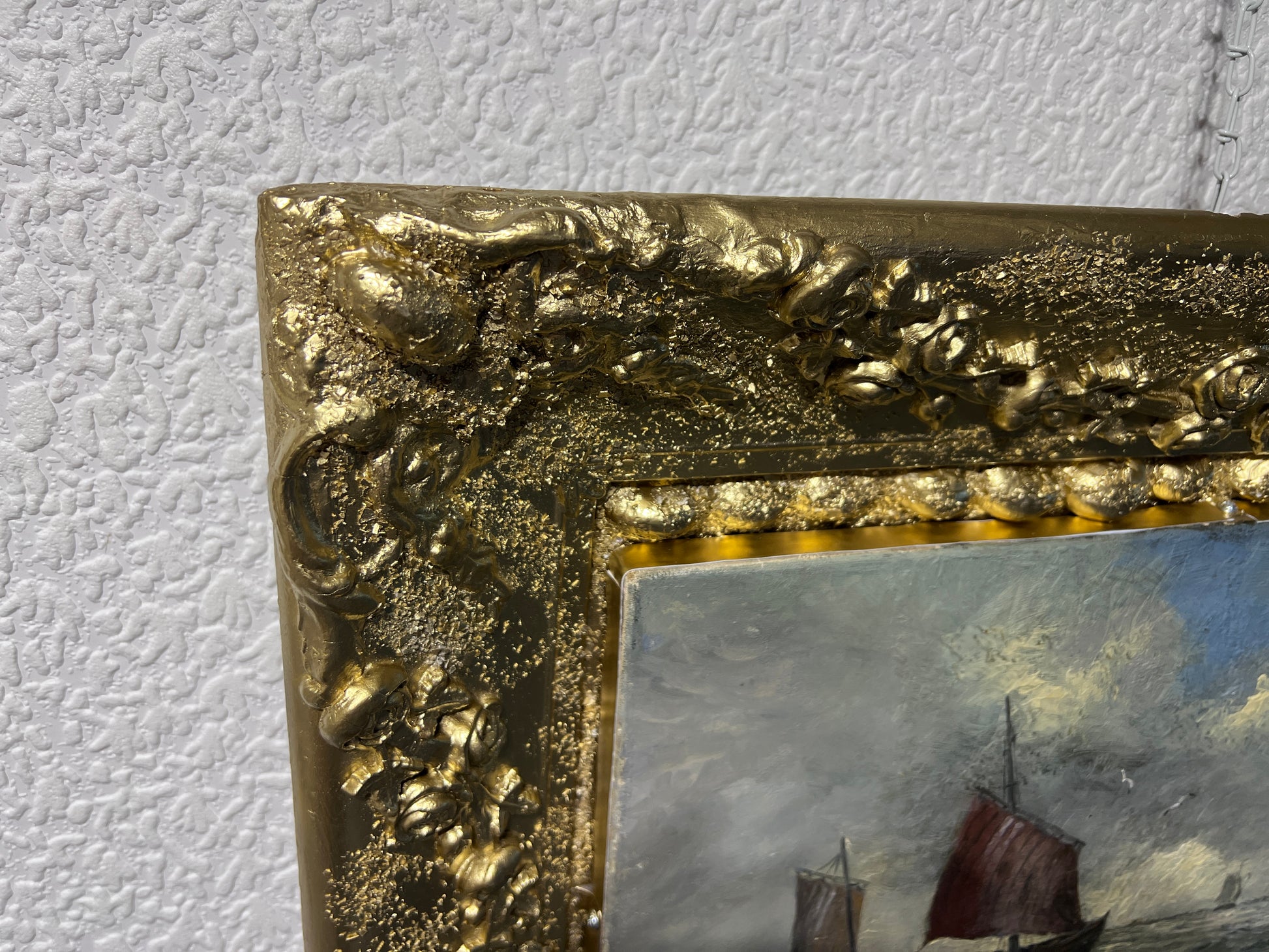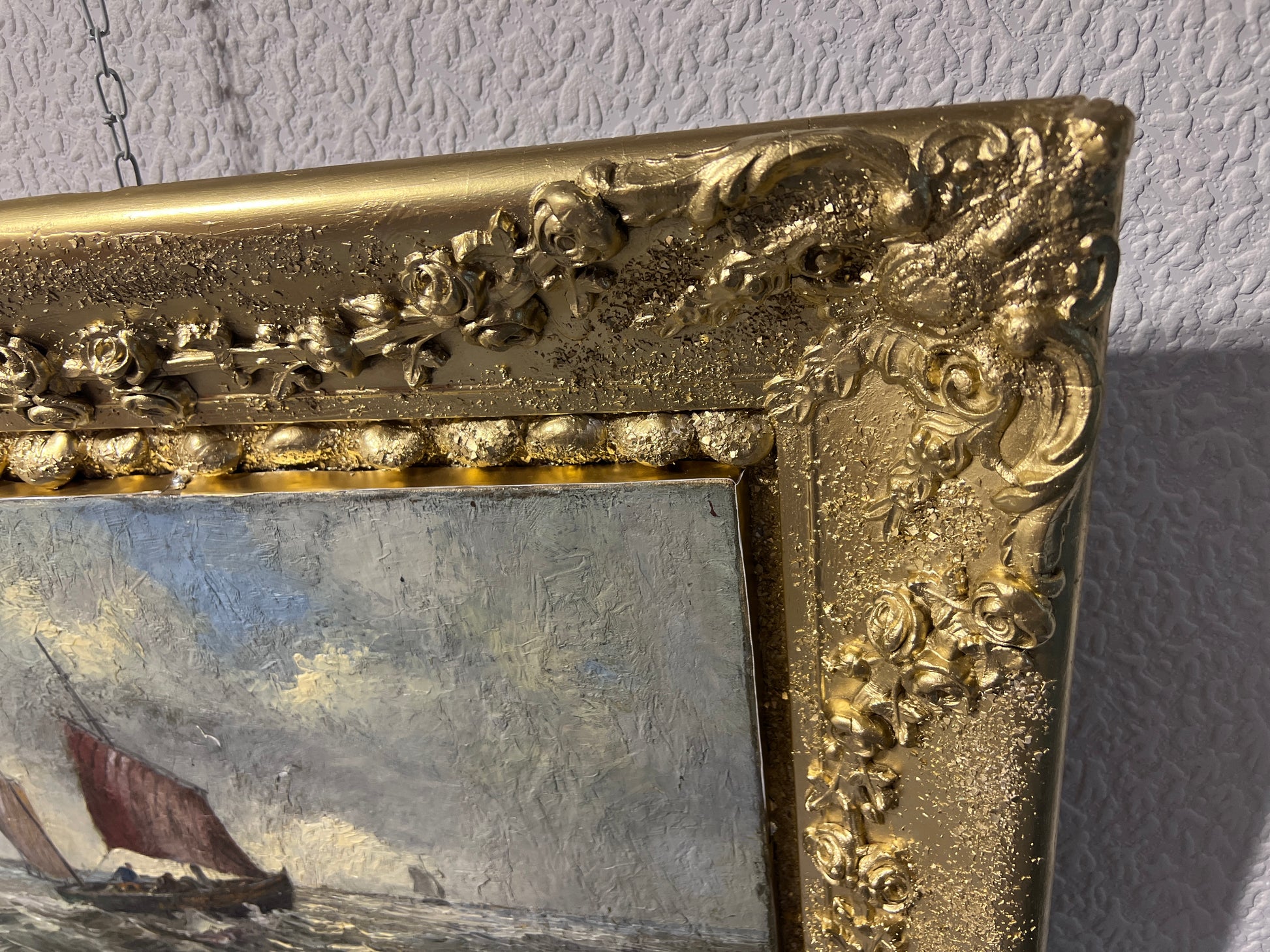🖼️ Frame: Gorgeous period ornate gold frame, hand-decorated with raised floral details, complementing the maritime subject beautifully. The final photo shows a contemporary white canvas added for support — the original back of the painting is visible in photo #3.