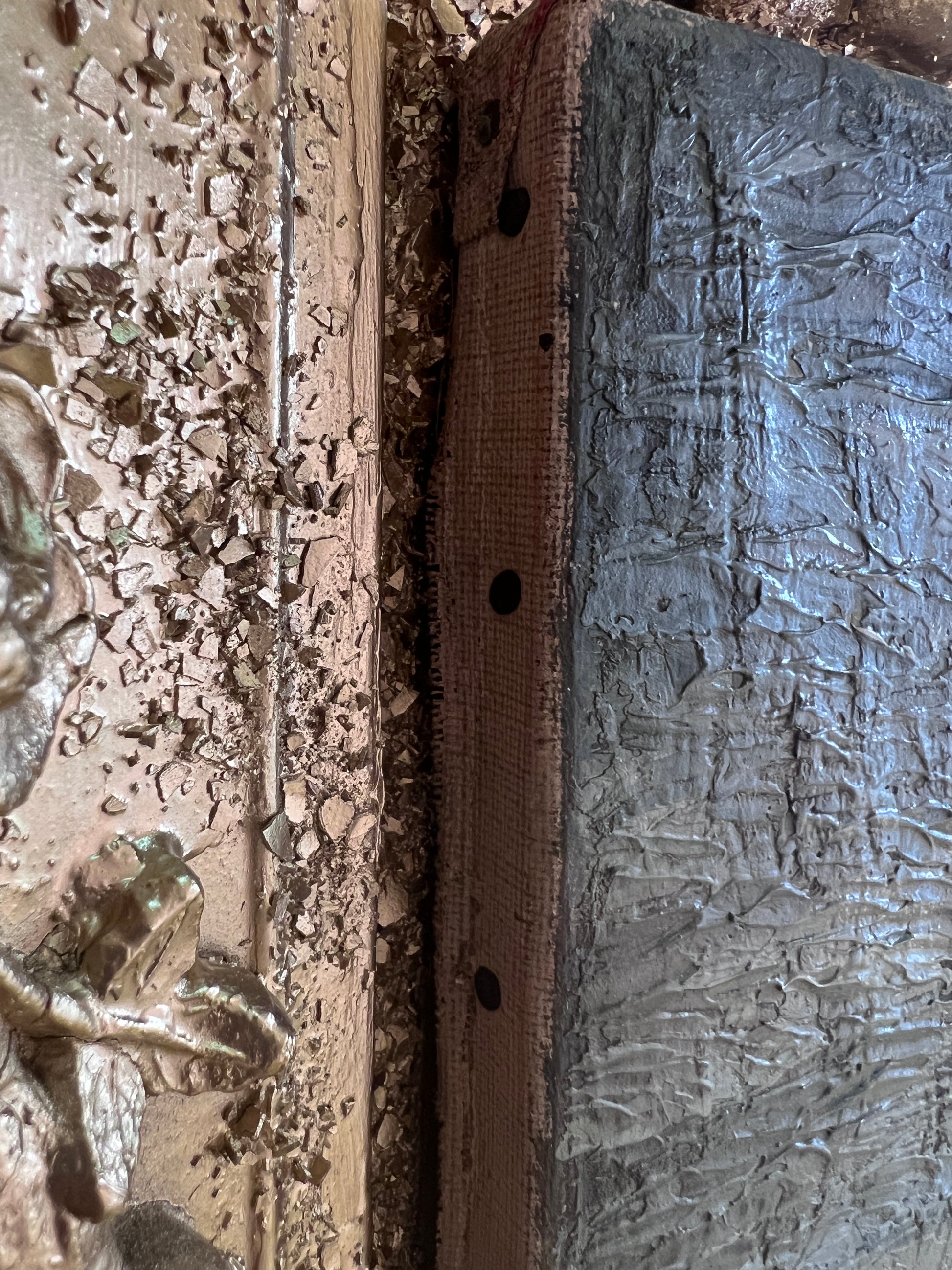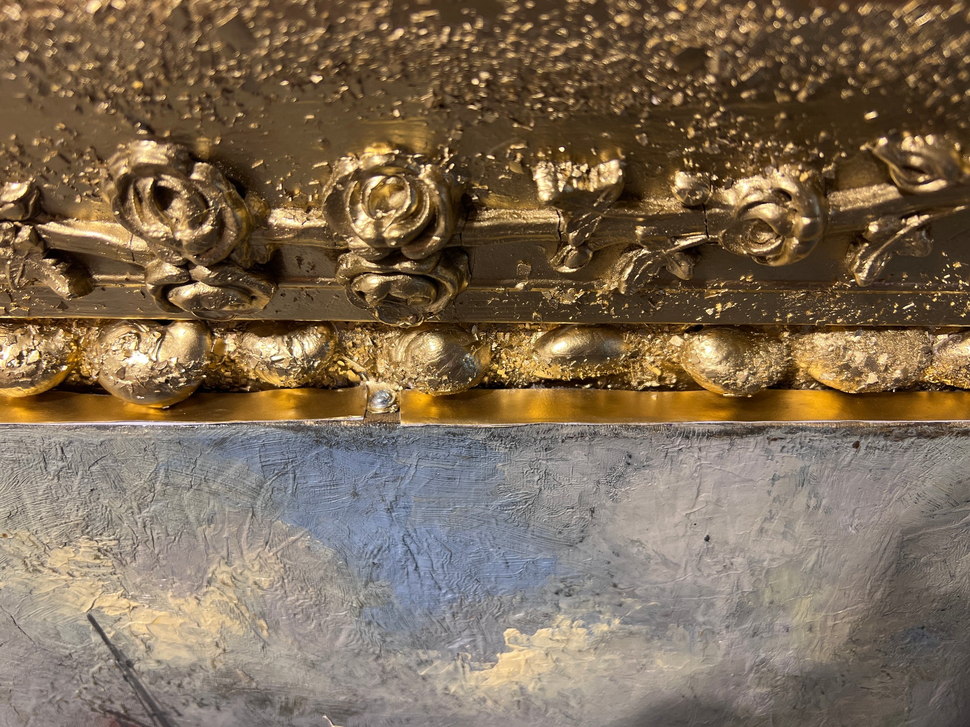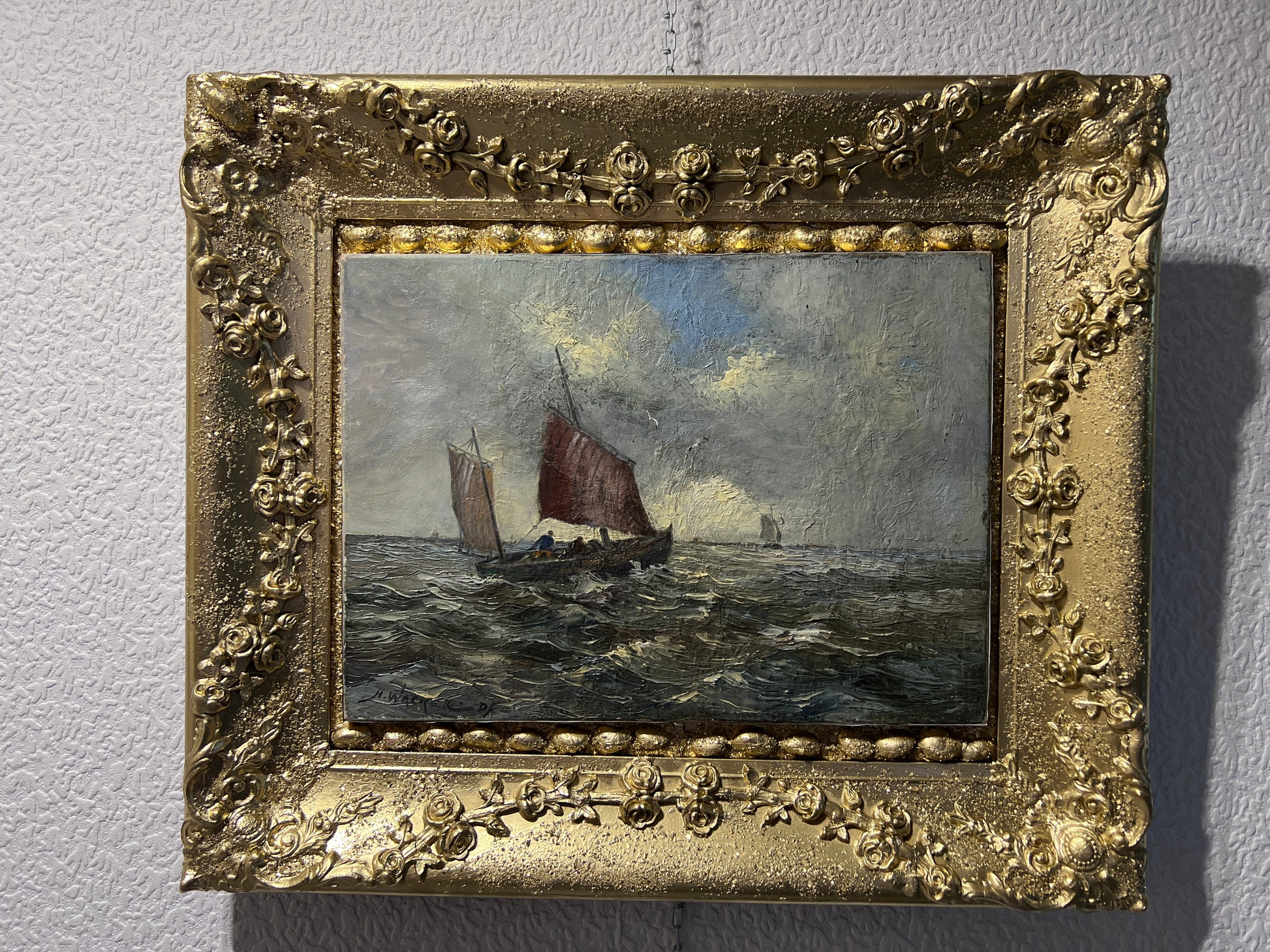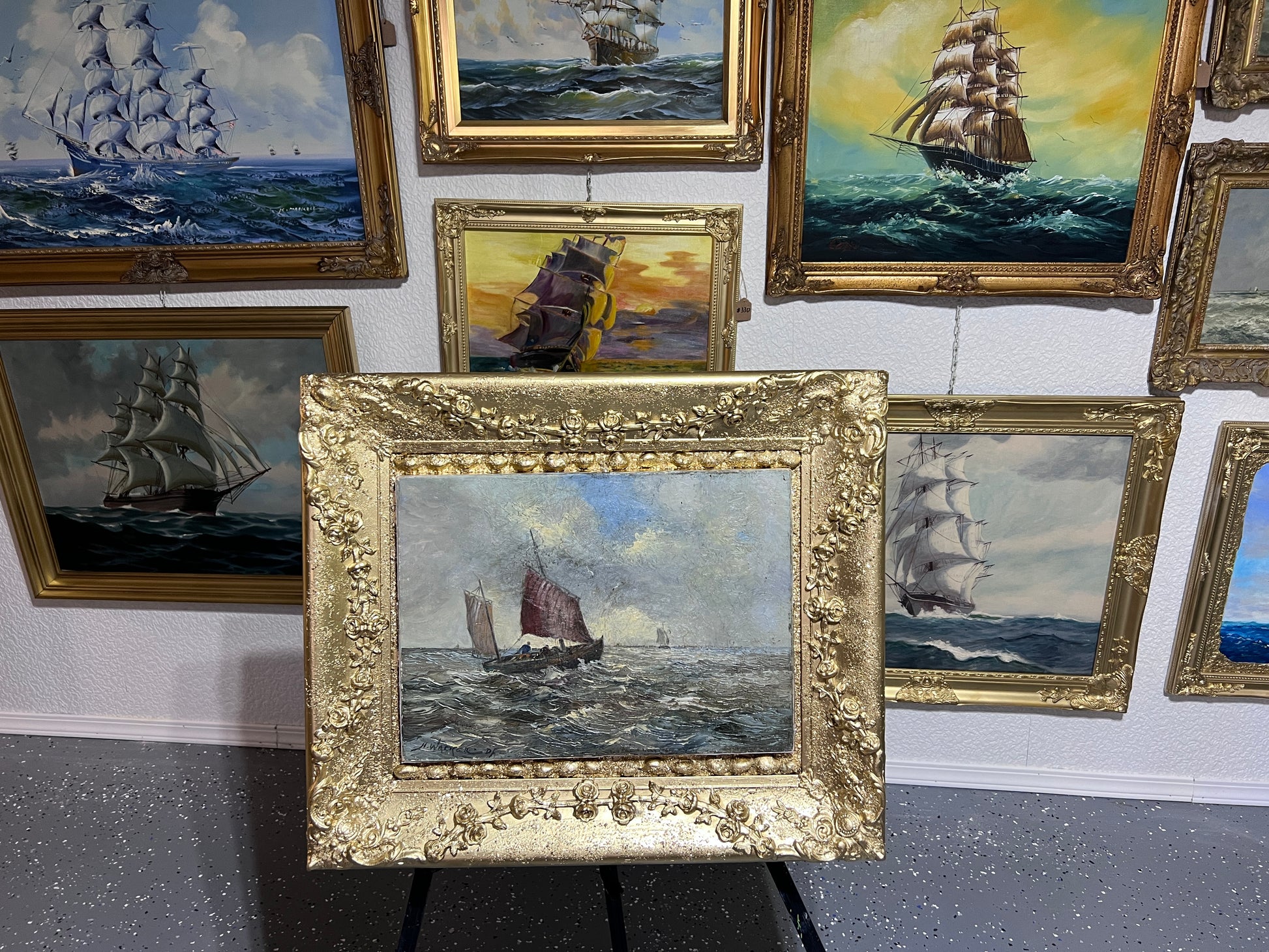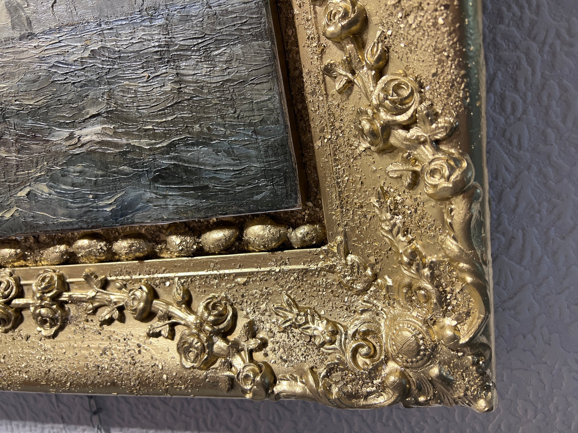 🖼️ Frame: Gorgeous period ornate gold frame, hand-decorated with raised floral details, complementing the maritime subject beautifully. The final photo shows a contemporary white canvas added for support — the original back of the painting is visible in photo #3.