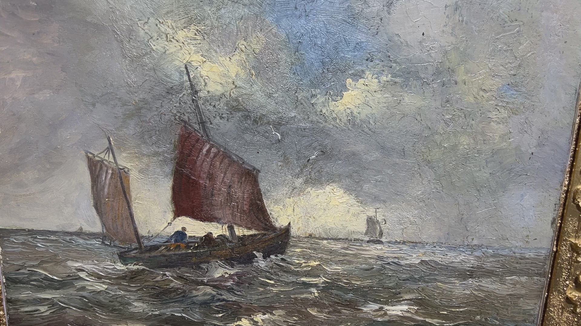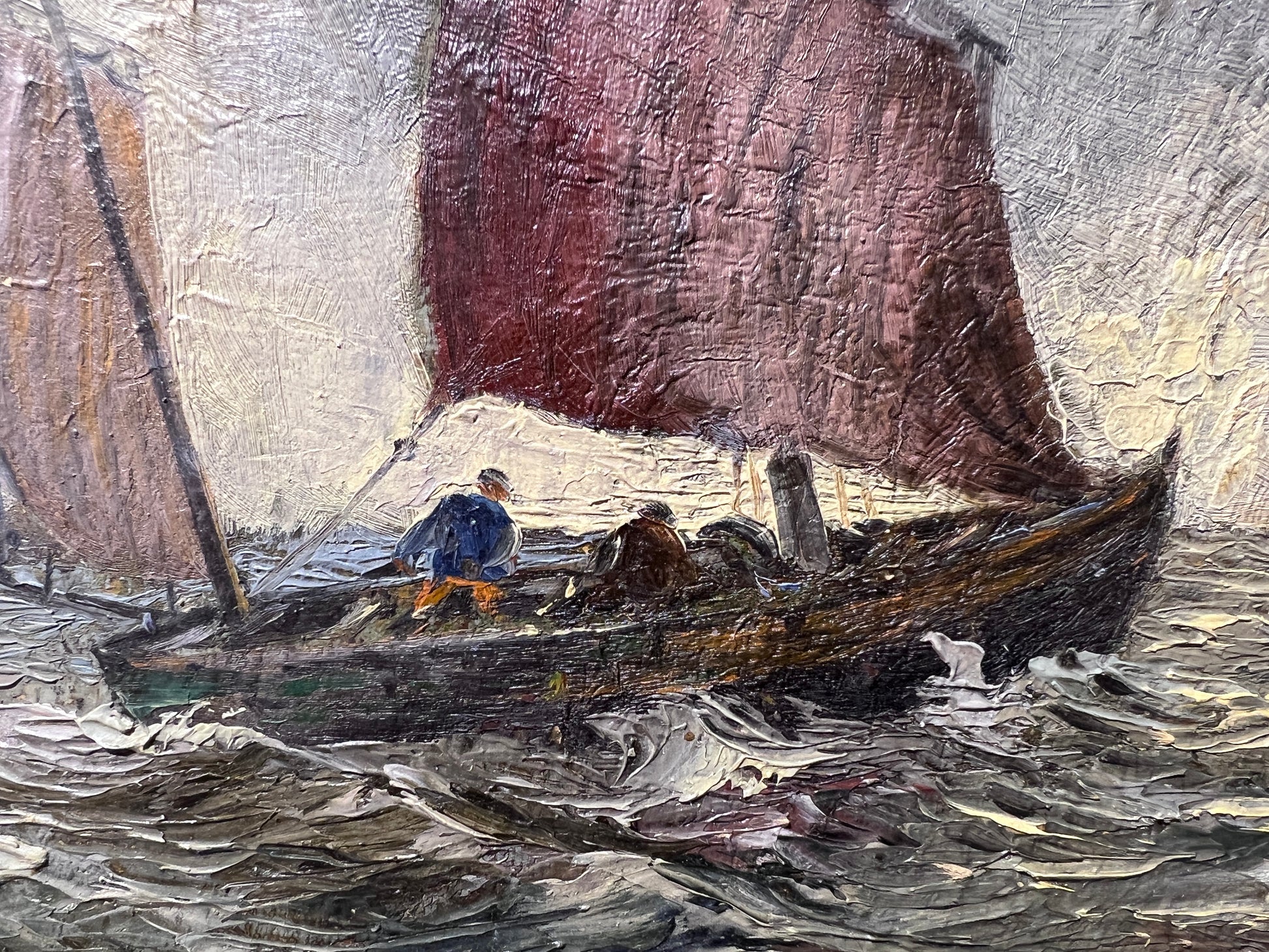 This antique original oil painting on canvas masterfully captures a dramatic seascape, with figures aboard a sailboat navigating open waters under a shifting, cloud-filled sky. The choppy waves, painted with expressive, textured brushstrokes, convey the movement and energy of the sea, while the sails — one a deep, weathered red and the other in muted beige — stand out vividly against the cool tones of the water and sky. A second sailboat can be seen on the distant horizon, adding depth and atmosphere to the composition.