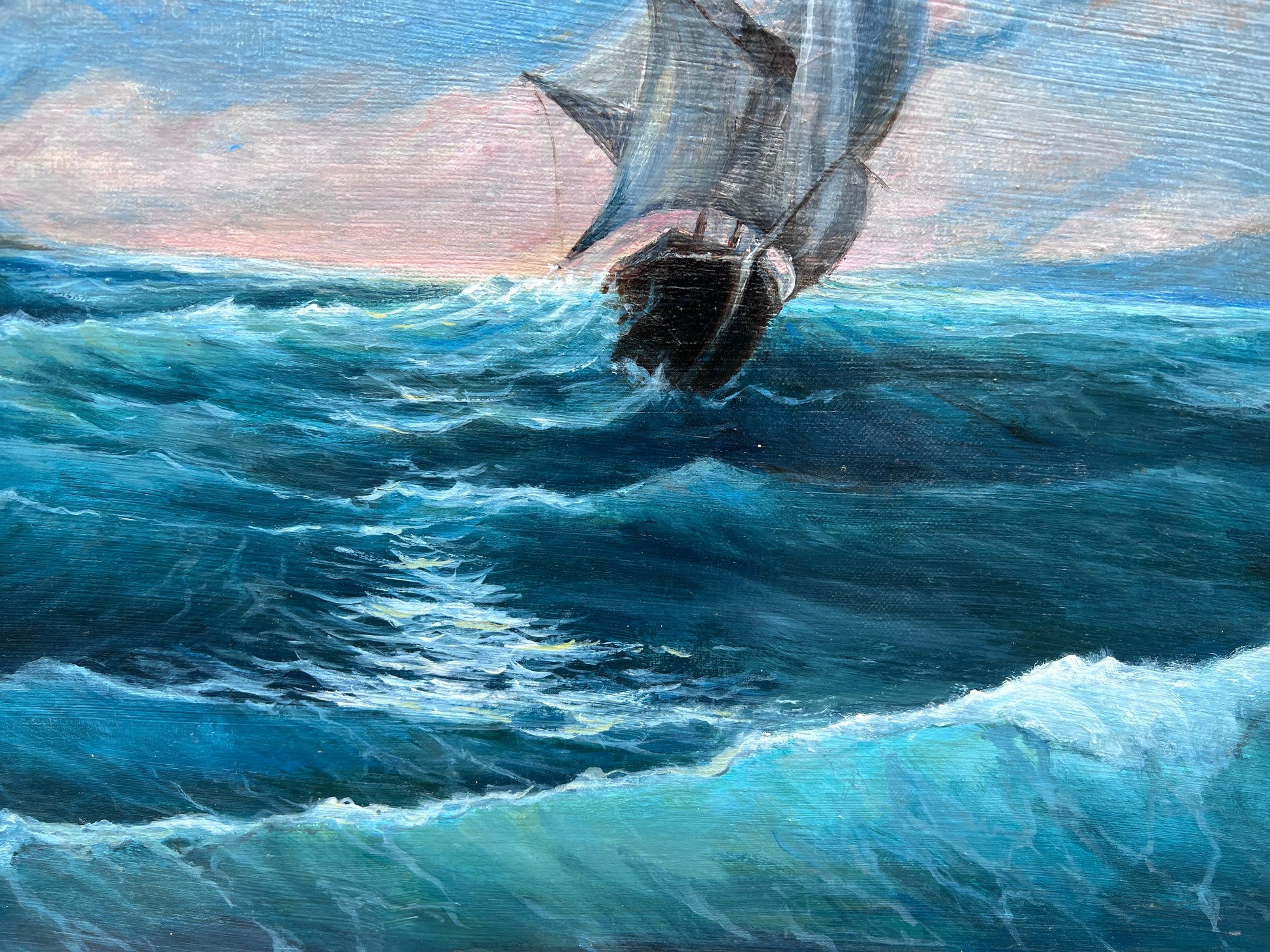 Up for sale is a captivating large oil painting on canvas by Russian artist Viktor Nikolayevich Ilyushkin (born 1946). This dramatic maritime scene portrays a lone sailing ship navigating through turbulent waves under a stormy sky, with touches of pink sunset illuminating the horizon. The deep blues of the ocean contrast with the lighter clouds, creating a moody and atmospheric seascape full of movement and intensity.